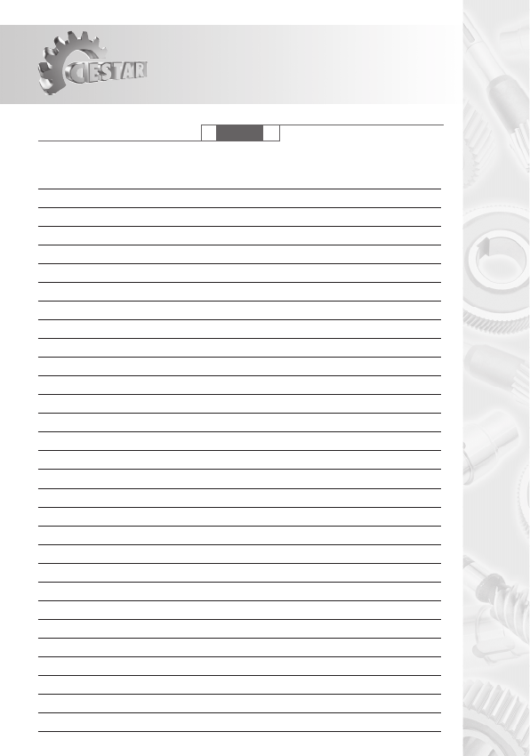 MAGMA Redutores e Motorredutores de Coroa e Rosca sem fim Índice Descrição página Características Gerais 2 Código do Produto 3 Execução 4-6 Posição de Trabalho - Sentido de rotação dos eixos 7 Seleção do Redutor 8 Cargas Radiais e Axiais admissíveis 9 Fator de serviço 10-11 Capacidade a 1750 rpm na entrada - 1 Estágio 12 Capacidade a 1150 rpm na entrada - 1 Estágio 13 Capacidade a 1750 rpm na entrada - 2 Estágios 14-15 Capacidade a 1150 rpm na entrada - 2 Estágios 16-17 Dimensões - 1 Estágio - Fixação na carcaça 18 Dimensões - 1 Estágio - Fixação por pé 19 Dimensões - 1 Estágio - Fixação por base 20 Dimensões - 1 Estágio - Fixação por pé lateral 21 Dimensões - 1 Estágio - Posicionado por braço de torção 22 Dimensões - 1 Estágio - Fixação na carcaça 23 Dimensões - 2 Estágios - Fixação na carcaça 24-25 Dimensões - 2 Estágios - Fixação por pé normal 26 Dimensões - 2 Estágios - Fixação por base 27-28 Dimensões - 2 Estágios - Posicionado por braço de torção 29 Dimensões - 2 Estágios - Fixação na carcaça 30-31 Dimensões do Flange Lanterna - 1 Estágio 32 Dimensões do Flange Lanterna - 2 Estágios 33 Dimensões do Flange Compacto - 1 Estágio 34 Dimensões do Flange Compacto - 2 Estágios 35 Dimensões dos eixos 36 Instruções de serviço 37-38 Peso dos redutores / Quantidade de lubrificante 39 Os redutores Magma são do tipo “coroa e rosca sem fim”, projetados para acionamento de toda classe de máquinas e equipamentos de baixa velocidade. Uma seleção completa de tamanhos, com reduções de 1:10 até 1:4000, e formas construtivas que permitem sua instalação em diferentes posições, ocupando um espaço mínimo devido ao seu tamanho reduzido. São fabricados com a mais avançada tecnologia, empregando-se materiais, máquinas e ferramentas de primeira linha, e submetidos a um rigoroso controle de qualidade. ROSCA SEM FIM As roscas são executadas em aço cromo-níquel para cementação, que após tratamento térmico atingem uma dureza superficial de 58 a 60 HRc. O perfil evolvente é retificado com a máxima precisão, proporcionando ao redutor um alto rendimento e um funcionamento suave. COROAS As coroas são executadas em bronze centrifugado liga especial, com propriedades mecânicas que garantem um ótimo funcionamento e durabilidade. São de forma globoidal e dentes helicoidais, geradas em máquinas de grande precisão com ferramentas especiais (Classe de precisão “ A “, conforme DIN 3968). CARCAÇAS As carcaças são fabricadas em ferro fundido cinzento de alta qualidade e distinguem-se por sua estética, rigidez e versatilidade.A superfície externa é totalmente aletada, proporcionando uma melhora considerável na dissipação de calor. São usinadas com precisão e dotadas na entrada e saída, de retentores de borracha sintética de dupla ação, assegurando uma completa vedação e evitando a entrada de corpos estranhos no interior da caixa bem como vazamento do lubrificante. EIXOS DE SAÍDA Os eixos de saída são dimensionados para suportarem as cargas indicadas. Todos os assentos, pontas de saída e furos (no caso de eixos vazados), são retificados e obedecem as tolerâncias indicadas neste catálogo. MANCAIS As roscas sem fim, e os eixos de saída são apoiados em mancais de rolamentos cônicos, exceto para eixos de saída vazado. Neste caso, são utilizados rolamentos de esferas. A seleção desses rolamentos é feita para garantir uma longa vida dos mesmos. LUBRIFICAÇÃO A lubrificação é feita por imersão em banho de óleo, garantindo uma perfeita lubrificação dos componentes. Para determinadas posições de serviço, são aplicados rolamentos lubrificados à graxa. REFRIGERAÇÃO A refrigeração é feita através do próprio lubrificante e de uma ventoinha acoplada à rosca sem fim que, através das aletas da carcaça, refrigera todo o redutor. 2 Características Gerais 3 MAGMA Redutores e Motorredutores de Coroa e Rosca sem fim Código do Produto Identifica posição de entrada duplex em relação ao 2° redutor (pag. 5,6,7 ) 0 - Para simples redução 1 - Eixos paralelos entrada superior direita 2 - Eixos paralelos entrada superior esquerda 3 - Eixos paralelos entrada inferior direita 4 - Eixos paralelos entrada inferior esquerda 5 - Eixos ortogonais entrada superior direita 6 - Eixos ortogonais entrada superior esquerda 7 - Eixos ortogonais entrada inferior direita 8 - Eixos ortogonais entrada inferior esquerda Modelo 04 Tamanho 03 04 05 06 07 08 10 12 14 17 20 24 28 34 1 N° de estágios 1- Simples estágio 2- Duplo estágio 30 0 1 N 1 D N W 1 Redução K Identifica tipo de entrada (pag. 7) 0 - Entrada simples 1 - Entrada simples com flange lanterna 2 - Entrada simples com flange compacto 5 - Entrada dupla 6 - Entrada dupla com flange lanterna 7 - Entrada dupla com flange compacto Tipo e posição do acessório 0 - Sem acessório 1 - Pé normal lado da rosca 2 - Pé normal lado eixo de saída 3 - Base lado direito 4 - Base lado esquerdo 5 - Pé lateral lado da ventoinha 7 - Braço torção lado direito 8 - Braço torção lado esquerdo A - 56 D - 80 G - 100C K - 132M N - 180M R - 200L B - 63 E - 90S H - 112 L - 160M P - 180L S - 225S C - 71 F - 90L J - 132S M - 160L Q - 200M T - 225M 0 - sem motor Tipo motor 0 - sem motor 1 - motor do cliente N - motor standard A - motor alto rendimento E - motor especial Fabricante motor 0 - sem motor C - motor do cliente E - Eberle W - Weg P - disponível em estoque Posição de trabalho Obs.: Somente para dupla redução, adotar como referência o 2° redutor (sáida) na posição de trabalho 1, visto de frente para o eixo de entrada Tipo do eixo de saída (considerando-se posição de trabalho 1) N - Normal direito E - Normal esquerdo D - Duplo V - Vazado Identifica carcaça 86 75 1 2 3 4 1 2 6543 Simples Redução Dupla Redução Red. Cód. Red. Cód. Red. Cód. Red. Cód Red. Cód Red. Cód. 10 20 30 30 100 40 400 52 900 59 2000 66 15 24 40