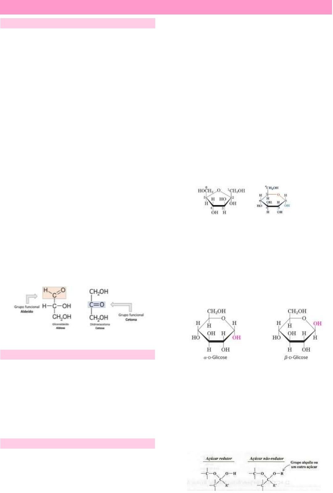 Bioquímica Glória Mamédio Furanose piranose Carboidratos Caracteristicas Os carboidratos são biomoléculas mais abundantes São constituídos por aldeídos e cetonas, formando poli-hidroxialdeidos e poli-hidroxicetonas Também são chamados de glicídios, açucares ou hidratados de carbono. A formula é constituída por C,H e O. alguns apresentam enxofre, nitrogênio e fosforo São divididos em 3: monossacarídeos: são açucares formados por apenas uma unidade de sacarídeo. Quando apresentam 4 ou mais C assumem forma cíclica. O principal é o D-glicose (dextrose) oligossacarídeo: são açucares formados por cadeias curtas de monossacarídeos, são conectados por meio de ligações glicosídicas. Os mais abundantes são os dissacarídeos. Nas células, os oligossacarídeos formados por 3 unidades ou mais estão ligados a moléculas que não são açucares (lipídeos e proteínas). Todos os monossacarídeos e dissacarídeos comuns tem sufixo “ose” polissacarídeos: são formados por mais de 20 unidades de monossacarídeos Alguns possuem forma linear e outros são ramificados Funcoes Reserva energética Composição dos ácidos nucleicos Componentes estruturais de muitos organismos Proteção Sinais de localização celular Lubrificação de juntas esqueléticas Adesão intracelular Monossacarideos Açucares simples São cristalinos, incolor e solúveis em água A maioria tem sabor adocicado Os mais comuns não possuem cadeia ramificada, apenas ligações simples entre os carbonos Quando possui o grupo funcionas aldeído são aldoses, quando possuem cetona são cetoses Não são hidrolisáveis e são hidrossolúveis Triose (3C), tretose (4C), pentose (5C) e hexose (6C) Todos os monossacarídeos possuem carbonos quirais e são opticamente ativos .(exceto as cetotrioses) Os que possuem função biológica importante apresentam configuração D D-glicose e D-frutose são os mais comuns na natureza. Os monossacarídeos formados por 4 ou mais carbono, em água, assumem forma cíclica. As mais estáveis são as furanoses e piranoses Quando em forma cíclica as aldoses são hemiacetal e as cetoses são hemicetal Na forma cíclica o carbono quiral ou anomerico é o que está ligado á O e OH Quando formam anéis podem assumir configuração α quando o grupo OH está para baixo e β quando o OH está para cima Hexoses simples: glicose, galactose e manose Em algumas hexoses o grupo OH de qualquer carbono pode ser trocado por outro grupo ou um átomo de C pode ser oxidado Açucares redutores: alguns monossacarídeos podem sofrer redução a partir da oxidação de um grupo carbonila. Essa é a base da reação de Fehling que era usado para detectar níveis de açucares redutores Bioquímica Glória Mamédio Oligossacaredeos Carboidratos formados por um pequeno número de monossacarídeos ligados por ligação glicosídica A ligação glicosídica é determinada pela ligação glicosídica do carbono anomerico, se a OH for α é ligação α, se o OH for β é ligação β Dissacarideos São oligossacarídeos formados por 2 monossacarídeos ligados por ligação glicosídica, a hidroxila se liga ao carbono anomérico A formação de uma ligação glicosídica gera um açúcar não redutor Em dissacarídeos uma das extremidade com carbono anomerico é livre e pode ser reduzida, chamando de extremidade redutora Maltose: formado por 2 resíduos de glicose. É um dissacarídeo redutor. É resultante da hidrolise do amido. Lactose: formado por glicose mais galactose. É naturalmente presente no leite. A enzima lactase inicia o processo de digestão desse dissacarídeo e como outros dissacarídeos. Não é absorvido no intestino delgado. É um dissacarídeo redutor Sacarose: formado por glicose mais frutose, é produzido pelas plantas e está presente principalmente na cana de açúcar e na beterraba. Não é um açúcar redutor e é hidrolisado pela enzima sacarase. Polissacarideos São polímeros formados por centenas ou milhares de resíduos de monossacarídeos Podem ser lineares os ramificadas Diferenciem entre si pelo tipo de monossacarídeos repetidos, comprimento, tipo de ligação que une os resíduos e grau de ramificações Homopolissacarídeos: possuem apenas um tipo de monossacarídeo em toda a estrutura. Ex: amido, glicogênio, insulina, celulose e quitina. Heteropolissacarídeos: possuem 2 ou mais tipos de monossacarídeos. Ex: glicosaminoglicanos, ácido hialurônico, glicoproteínas e peptidoglicano. Amido: polímero de α-D-glicose. Serve como resrva energética para plantas e alimento para animais Glicogênio: polímero de glicose. Presente no corpo humano como reserva. Fica no reticulo endoplasmático liso dos hepatócitos e células muscular. Na célula hepática funciona para controle da glicemia e no musculo para fornecer energia para o movimento. Celulose: formado por D-glicose. Presente no caule, tronco e toda a parte de madeira da planta. É uma substancia fibrosa, flexível e insolúvel em agua. Os animais não podem digerir devido a falta da enzima β amilase. Os ruminantes possuem bactérias que produzem essa enzima, então podem digerir a celulose. Quitina: substancia de sustentação e compõe o exoesqueleto dos artrópodes. Formado por unidade de N-acetil glicosamina Digestao dos carboidratos Os principais sítios para digestão é a boca e o lúmen. A digestão é rápida As enzimas que fazem a digestão geralmente são endoglicosidase e dissacaridase Boca: inicia a digestão do amido pela α-amilase. A digestão cessa temporariamente no estômago pois o ambiente ácido inativa a amilase salivar. Intestino delgado: o bicabornato neutraliza o conteúdo ácido do estômago e a amilase pancreática continua a digestão do amido. Jejuno: no epitélio mucoso do jejuno superior. Libera dissacaridase e oligossacaridases como maltase, sacarase e lactase.. Quando á um defeito nas enzimas o carboidrato não é digerido e vai para o intestino grosso. A agua flui da mucosa p