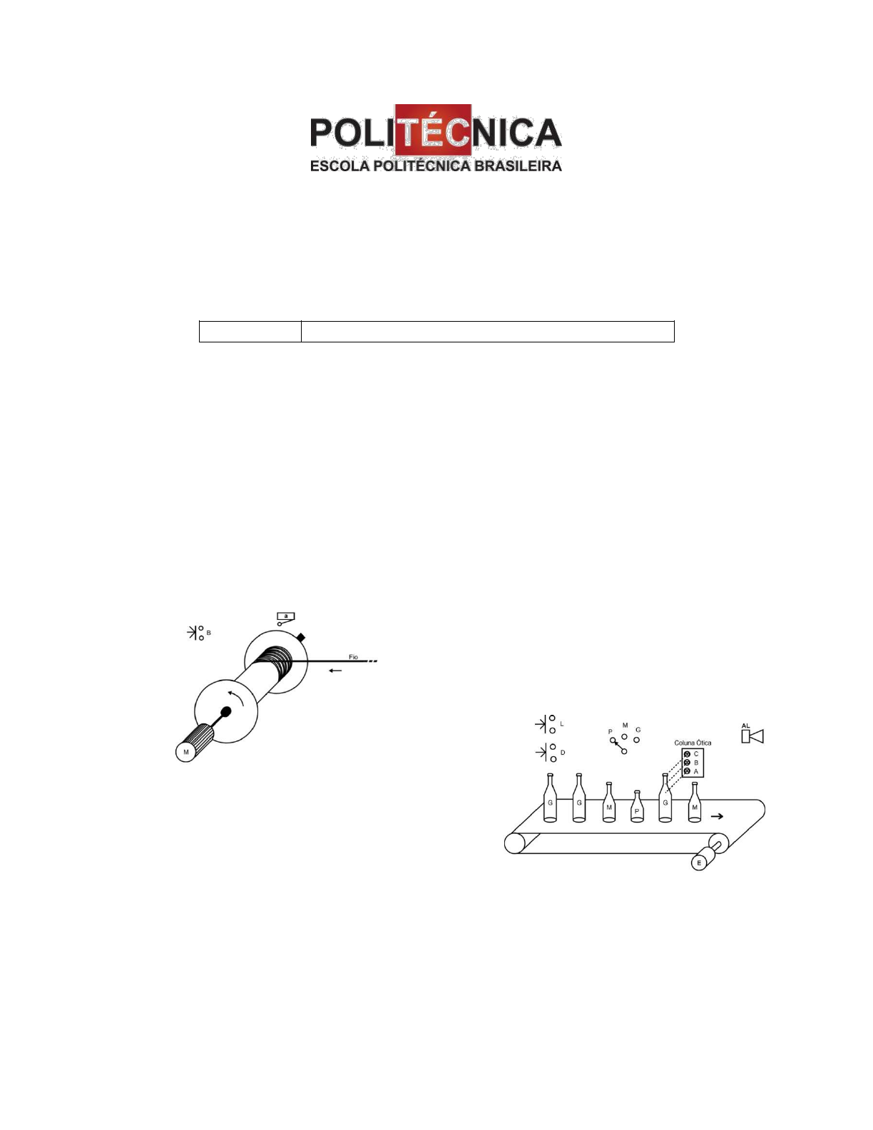 CLP - Controladores Logicos Programaveis Avaliação Final Prof. Wisley Alex Costa Aluno(a) Leandro Rodrigues Melo 1. Elabore um programa de CLP para que o mesmo faca o controle do numero de vagas num esta- cionamento capaz de abrigar 50 ve culos. O sis- tema e composto por duas l^ampadas de sinal- izac~ao LIB(liberado) e LOT(lotado), as quais in- formam sobre a disponibilidade de vagas no esta- cionamento. Ha um sensor de entrada de ve culo SEV na unica via de acesso ao estacionamento e outro sensor SSV de sa da de ve culo. Atraves da botoeira BOT o operador informa que todas as va-gas est~ao livres. 2. Elabore um programa de CLP capaz de controlar 60 espiras a serem bobinadas em um indutor numa maquina de bobinamento automatica, a qual opera a partir do comando da botoeira B dado pelo op- erador. O motor principal de acionamento MA e acionado por um inversor que possui uma entrada para velocidade lenta VL, outra para velocidade rapida VR e outra ainda para freio imediato FI. Considere duas voltas como o per odo necessario para acelerar/desacelerar o indutor. Um sensor SV monitora o termino de bobinamento de cada espira. 3. Elaborar um programa CLP para processo indus- trial em que, uma esteira acionada pelo motor E transporta garrafas de tr^es tamanhos (pequena, media e grande) que sensibilizam tr^es sensores oticos A, B, C, conforme ilustra a gura a seguir. O processo tem in cio quando a botoeira L e acionada, e interrompido pela botoeira D. A selec~ao do tipo de garrafa e feita a partir de uma chave seletora de tr^es posic~oes (P, M e G). Assim, caso, por exem-plo, sejam selecionadas garrafas grandes, a esteira deve parar e o alarme AL soar caso uma garrafa pequena ou media seja detectada. Apos a retirada manual da garrafa indesejada, o operador deve re-ligar o sistema em L. 4. Elaborar um programa CLP para controlar dois reles (R1 e R2) de tal maneira que R1 pode at- uar de forma independente e R2 so pode atuar se R1 estiver ligado, mas pode continuar ligado apos o desligamento de R1. Os reles s~ao ligados pelas botoeiras L1 e L2, e s~ao desligados pelas botoeiras D1 e D2. 1 5. Desenhar o diagrama de interconex~oes eletricas f sicas e o programa de controle do CLP para um sistema de reservatorio composto de uma valvula de entrada P, duas bombas (acionadas por M1 e M2), um alarme AL e quatro sensores de n vel (a, b, c, d), conforme ilustrado na gura. As condic~oes de funcionamento s~ao as seguintes: se o n vel for ‘a’, ent~ao fecha-se a valvula P. Se o n vel for inferior a ‘b’, ent~ao abre-se a valvula P. Acima de ‘b’, M1 e M2 bombeiam.Abaixo de ‘b’, somente M1 bombeia. Abaixo de ‘c’, soa o alarme AL. Em ‘d’, nenhuma das bombas devera funcionar. 2