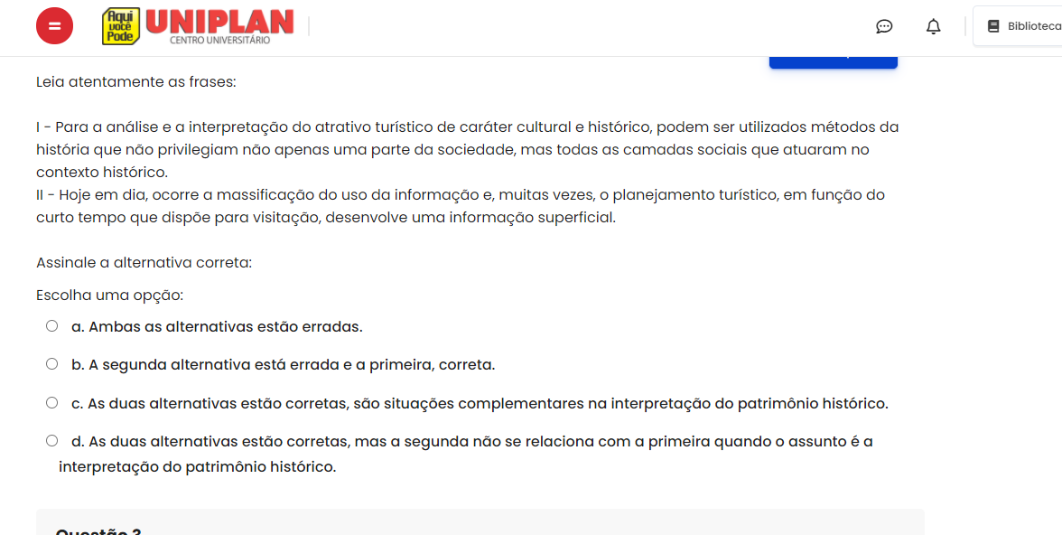 Aqui = UNIPLAN Biblioteca Pode CENTRO UNIVERSITÁRIO Leia atentamente as frases: Assinale a alternativa correta: I - Para a análise e a interpretação do atrativo turístico de caráter cultural e histórico, podem ser utilizados métodos da história que não privilegiam não apenas uma parte da sociedade, mas todas as camadas sociais que atuaram no contexto histórico. Hoje em dia, ocorre a massificação do uso da informação e, muitas vezes, planejamento turístico, em função do curto tempo que dispõe para visitação, desenvolve uma informação superficial. a. Ambas as alternativas estão erradas. b. A segunda alternativa está errada e a primeira, correta. C. As duas alternativas estão corretas, são situações complementares na interpretação do patrimônio histórico. d. As duas alternativas estão corretas, mas a segunda não se relaciona com a primeira quando o assunto é a interpretação do patrimônio histórico.