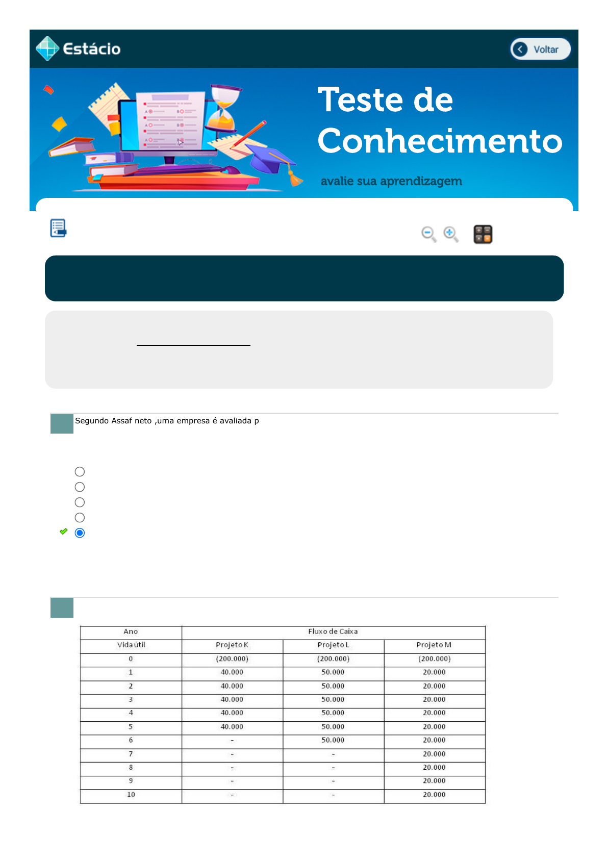 O quadro a seguir apresenta o fluxo de caixa e a vida ú�l dos projetos K, L e M de uma empresa.