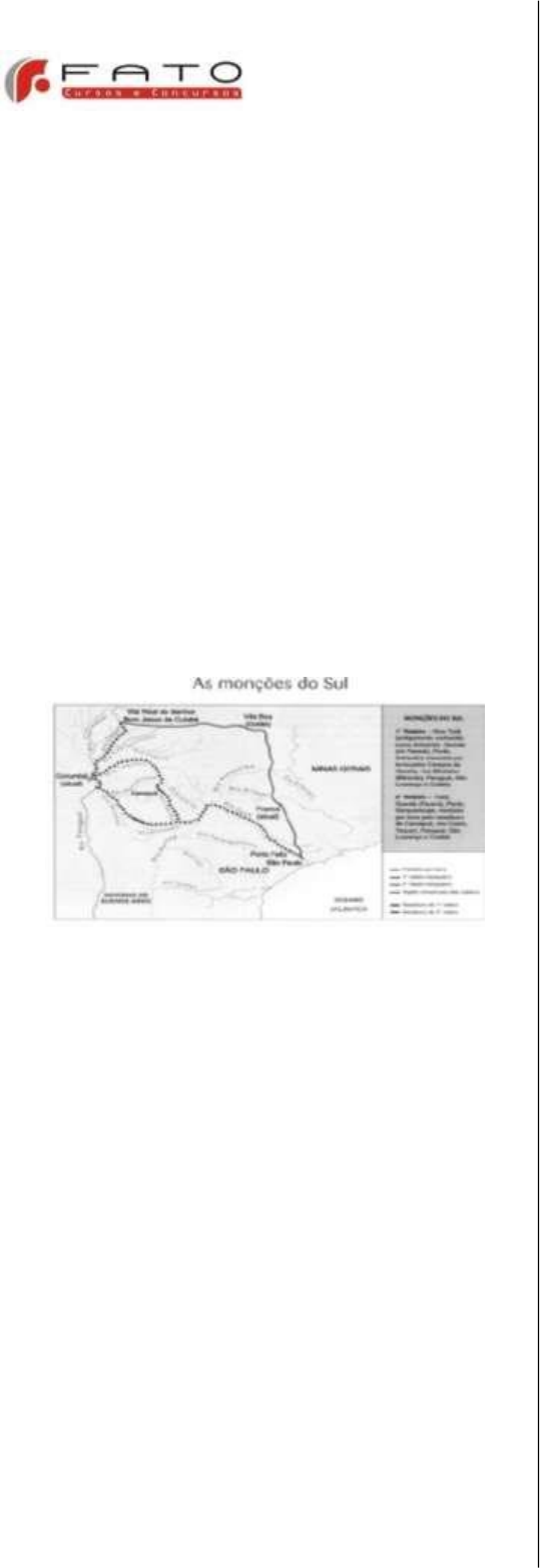 CURSO PREPARATÓRIO História Regional Professor – Gênesis BLOCO 01 – Período Colonial (1718 a 1822) (Séc. XVIII e inicio do XIX) 01. (UEMS) A respeito da nova realidade criada pela exploração aurífera em Minas Gerais, Goiás e Cuiabá, a partir de fins do século XVIII, assinale a alternativa correta. I. Embora fosse altamente lucrativa, atividade mineira não chegou a atrair grande número de pessoas, de modo que a população da colônia não apresentou crescimento significativo durante o século XVIII. II. Por ser uma atividade concentradora de renda e urbanizante, a mineração estimulou o desenvolvimento de outros ramos da economia colonial, como a produção de gêneros alimentícios. III. Nessa economia mineradora era muito utilizado o trabalho escravo nativo/negro, não sendo mais importante a utilização de trabalhadores livres. a) Apenas a I está correta. b) Apenas a II está correta.. c) Estão corretas a I e lI. d) Estão corretas a II e III. e) Estão corretas a I e III. 02. (UFMS) A figura e o texto que se seguem se referem à história do antigo Mato Grosso em tempos coloniais. “Quando os bandeirantes paulistas atingiram o rio Coxipó, implementando guerra aos índios Coxiponés, chegaram a pé ou através de pequenas embarcações, utilizando-se da imensa rede hidroviária que drena o centro do continente. No momento em que a mineração floresceu, às margens do rio Cuiabá, nasceu ali um arraial onde foram construídas casas, igrejas, estabelecido pequeno comércio, tornando-se necessário regularizar o abastecimento, pois seus habitantes estavam ocupados somente com a mineração. [...] A esse sistema abastecedor e de transporte de pessoas, implementado exclusivamente através dos rios, deu-se o nome de monções”. (SIQUEIRA, Elizabeth Madureira. História de Mato Grosso: de ancestralidade aos dias atuais. Cuiabá: Entrelinhas, 2002. p. 34). A partir da análise da figura e do texto apresentados e com base em seus conhecimentos sobre a História do antigo Mato Grosso, é correto afirmar que: (01) A descoberta de ouro na região de Cuiabá, em 1719, estimulou Portugal a adotar uma série de medidas com vistas a expandir e consolidar seus domínios sobre a bacia do Alto Paraguai e outras regiões localizadas para além dos limites estabelecidos pelo Tratado de Tordesilhas, de 1494.. (02) Durante todo o período colonial, os bandeirantes paulistas tinham, como principal atividade somente, a busca e a exploração de metais preciosos pelos sertões, incluindo aqui os territórios atualmente compreendidos pelos Estados de Mato Grosso e Mato Grosso do Sul. (04) Os paulistas eram conhecedores das sociedades indígenas estabelecidas no interior da colônia, e tinham muita habilidade em viajar pelos sertões, haja vista, dentre outras coisas, a ajuda que tiveram de muitos indígenas na fabricação de embarcações (batelões e canoas), como guias nas viagens, na alimentação e na medicina.. (08) Durante a primeira metade do século XVIII, monções oriundas do Rio de Janeiro e de Itú abasteciam a população de Cuiabá com produtos como charque, sal, pólvora e tecidos de algodão. (16) Na década de 1720, por conta da exploração de ouro em Cuiabá, o então governador de São Paulo, Rodrigo César de Menezes, transferiu-se por algum tempo para aquela longínqua zona mineira. Lá ele promoveu um austero controle administrativo-fiscal, inclusive mediante aumento de imposto e maior fiscalização na sua cobrança, garantindo assim a reprodução do modelo colonial.. 03. (UFMT) Ao se referir ao abastecimento da região mineira de Cuiabá, nos primeiros tempos da colonização, a historiadora Elizabeth M. Siqueira assim se expressa: “As duas regiões mais próximas das Lavras do Sutil e responsáveis pelo seu abastecimento mais imediato foram: Rio Abaixo (hoje Santo Antônio do Leverger) e Serra Acima (Chapada dos Guimarães) [...] Dessa forma nem só de alimentos vivia esta população...” (Revivendo Mato Grosso. Cuiabá, SEDUC, 1997, p.14-16) A respeito desse contexto histórico, julgue as características: (00) O primeiro trajeto fluvial percorrido pelos sertanistas para abastecer Cuiabá transformou o Rio Abaixo em importante entreposto comercial.. (01) De Rio Abaixo, a produção agrícola era trazida pelo rio Cuiabá até a região aurífera.. (02) Vestimentas, instrumentos de trabalho e escravos vinham de outras províncias por meio de tropas ou das Monções. (03) Os primeiros engenhos surgidos na região foram responsáveis pelo fabrico não somente do açúcar, mas também da rapadura e de aguardente.. 04 - "A maior Mina da região estava plantada na colina do Rosário e deu início à formação da cidade. A colina onde se localizou a igreja do Rosário, ergue-se à margem esquerda do rio Prainha. Em torno das jazidas, principalmente à margem direita do córrego, inicia-se o povoamento. Próximo também a essa margem localiza-se uma esplanada, escolhida para construção da Igreja da Matriz. Ruas e ruelas serpenteiam pelo terreno, ajustando-se a ele, ao longo do curso d'agua. O pelourinho, a igreja do Rosário assentam os primeiros pontos de tensão em torno dos quais a vila se estrutura e se organiza." (FREIRE,Julio De Lamônica. Por uma poética popular da arquitetura, p. 40-42). O texto acima descreve o espaço urbano de Cuiabá no período colonial. A partir da leitura do texto acima e de seus conhecimentos, assinale a alternativa correta. I. A área central da Vila Real do Senhor Bom Jesus de Cuiabá era composta pela Câmara Municipal, cadeia e a Igreja da Matriz.. II. A Igreja do Rosário conhecida também como da Boa Morte localiza-se atualmente no bairro Baú III. Foi Rodrigo César de Menezes, governador de São Paulo, que elevou Cuiabá à categoria de vila. Durante a sua administração, Rodrigo César de Menezes deu atenção especial à fiscalização das minas e à tributação.. a) I, II e III são corretas. b) I e II são corre