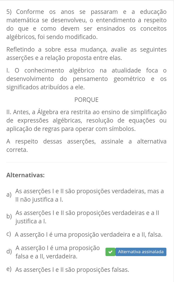 Conforme os anos se passaram e a educação matemática se desenvolveu, o entendimento a respeito do que e como devem ser ensinados os conceitos algébricos, foi sendo modificado. Refletindo a sobre essa mudança, avalie as seguintes asserções e a relação proposta entre elas. A respeito dessas asserções, assinale a alternativa correta. I. conhecimento algébrico na atualidade foca o desenvolvimento do pensamento geométrico e os significados atribuídos a ele. II. Antes, a Álgebra era restrita ao ensino de simplificação de expressões algébricas, resolução de equações ou aplicação de regras para operar com símbolos. a) As asserções I e II são proposições verdadeiras, mas a II não justifica a I. b) As asserções I e II são proposições verdadeiras e a II justifica a I. c) A asserção I é uma proposição verdadeira e a II, falsa. d) A asserção I é uma proposição falsa e a II, verdadeira. e) As asserções I e II são proposições falsas.