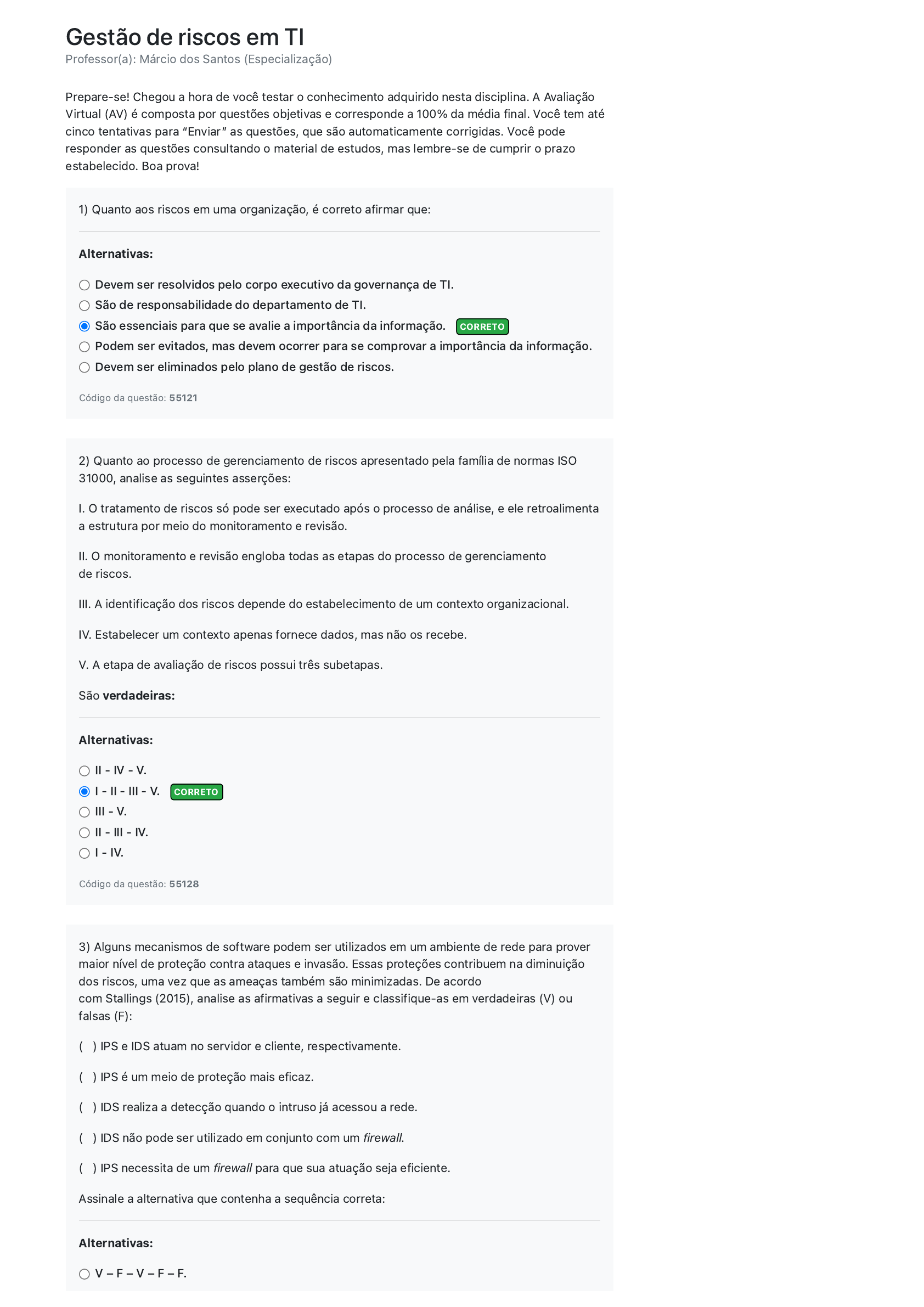 Gestão de riscos em TI Professor(a): Márcio dos Santos (Especialização) 1) 2) 3) Prepare-se! Chegou a hora de você testar o conhecimento adquirido nesta disciplina. A Avaliação Virtual (AV) é composta por questões objetivas e corresponde a 100% da média final. Você tem até cinco tentativas para “Enviar” as questões, que são automaticamente corrigidas. Você pode responder as questões consultando o material de estudos, mas lembre-se de cumprir o prazo estabelecido. Boa prova! Quanto aos riscos em uma organização, é correto afirmar que: Alternativas: Código da questão: 55121 Quanto ao processo de gerenciamento de riscos apresentado pela família de normas ISO 31000, analise as seguintes asserções: I. O tratamento de riscos só pode ser executado após o processo de análise, e ele retroalimenta a estrutura por meio do monitoramento e revisão. II. O monitoramento e revisão engloba todas as etapas do processo de gerenciamento de riscos. III. A identificação dos riscos depende do estabelecimento de um contexto organizacional. IV. Estabelecer um contexto apenas fornece dados, mas não os recebe. V. A etapa de avaliação de riscos possui três subetapas. São verdadeiras: Alternativas: Código da questão: 55128 Alguns mecanismos de software podem ser utilizados em um ambiente de rede para prover maior nível de proteção contra ataques e invasão. Essas proteções contribuem na diminuição dos riscos, uma vez que as ameaças também são minimizadas. De acordo com Stallings (2015), analise as afirmativas a seguir e classifique-as em verdadeiras (V) ou falsas (F): ( ) IPS e IDS atuam no servidor e cliente, respectivamente. ( ) IPS é um meio de proteção mais eficaz. ( ) IDS realiza a detecção quando o intruso já acessou a rede. ( ) IDS não pode ser utilizado em conjunto com um firewall. ( ) IPS necessita de um firewall para que sua atuação seja eficiente. Assinale a alternativa que contenha a sequência correta: Alternativas: Devem ser resolvidos pelo corpo executivo da governança de TI. São de responsabilidade do departamento de TI. São essenciais para que se avalie a importância da informação. CORRETO Podem ser evitados, mas devem ocorrer para se comprovar a importância da informação. Devem ser eliminados pelo plano de gestão de riscos. II - IV - V. I - II - III - V. CORRETO III - V. II - III - IV. I - IV. V – F – V – F – F. 4) 5) 6) Código da questão: 55144 Quanto ao Cobit e seus procedimentos aplicáveis à governança de TI, podemos afirmar que: I. A governança de TI tem como um dos objetivos compreender a necessidade estratégica da TI na organização II. Cobit pode ser considerado como um framework. III. Para a governança de TI, uma das maiores decisões está ligada à estratégia de infraestrutura. IV. Uma das iniciativas descritas no Cobit é: medir e aprimorar, que visa mensurar as implementações e prover melhorias necessárias. V. Para o Cobit, eficácia e eficiência são derivações do mesmo conceito. São verdadeiras: Alternativas: Código da questão: 55119 O quadro de ameaças é uma forma mais prática de elencar os possíveis componentes danosos e que deve ser conhecido por toda a organização. Este quadro deve especificar _________________ para que seja possível sua identificação clara e objetiva, além de citar ______________________ para fins de categorização. Neste raciocínio, recomenda-se elencar ___________________ da ameaça para que tratativas específicas possam ser aplicadas. Assinale a alternativa que completa adequadamente as lacunas acima: Alternativas: Código da questão: 55133 Leia e associe as duas colunas. Realizar a gestão de riscos é um processo que engloba um conhecimento profundo de cada setor de uma organização – motivo pelo qual a governança de TI precisa ser composta por membros de várias áreas e hierarquias. Apenas esses membros saberão o nível dos dados, informação e conhecimento que são trafegados em seus respectivos rols de atuação, bem como, os tipos de riscos e impactos que os afetam. Neste ínterim, é necessário que cada colaborador da organização – e primordialmente aqueles que compõem a governança de TI – detenham pleno conhecimento sobre o que é um Mapa de Riscos e saibam diferenciar dados, informação e conhecimento. Neste contexto, analise o quadro a seguir, relacionando as colunas. V – V – V – V – F. F – V – V – F – F. CORRETO V – F – V – F – V. F – F – F – V – F. I - II - IV - V. II - III - IV. I - II - III. CORRETO I - IV I - III - V. O nome da ameaça; Seu tipo; A origem. O nível de criticidade; Sua origem; O modo de solução. O tipo de ameaça; Seu nome; Os prazos de solução. O nome da ameaça; Os impactos; O prazo de solução. A origem; O impacto; O modo de solução. INCORRETO 7) 8) 9) Assinale a alternativa que traz a associação correta entre as duas colunas: Alternativas: Código da questão: 55118 Considere que você, membro da governança de TI da ABC S/A, precisa implantar a filosofia de gestão de riscos em TI dentro da organização utilizando a família de normas ISO 31000. Um dos primeiros passos que você dará será quanto: Alternativas: Código da questão: 55129 Quanto aos ativos dentro de uma organização, considere as afirmativas a seguir e classifique-as em verdadeiras (V) ou falsas (F). ( ) A informação é um ativo do tipo abstrato. ( ) Os dados podem ser considerados ativos quantitativos. ( ) Ativos podem ser impactados por ameaças, danosas ou não. ( ) Recursos humanos são ativos concretos, mas com aspectos abstratos. ( ) As características dos recursos humanos são ativos de menor valor. Assinale a alternativa que contenha a sequência correta: Alternativas: Código da questão: 55134 Para implantar uma estrutura de governança de TI em uma organização, analise as afirmações a seguir e classifique-as como verdadeiras (V) ou falsas (F): ( ) É necessário requerer 