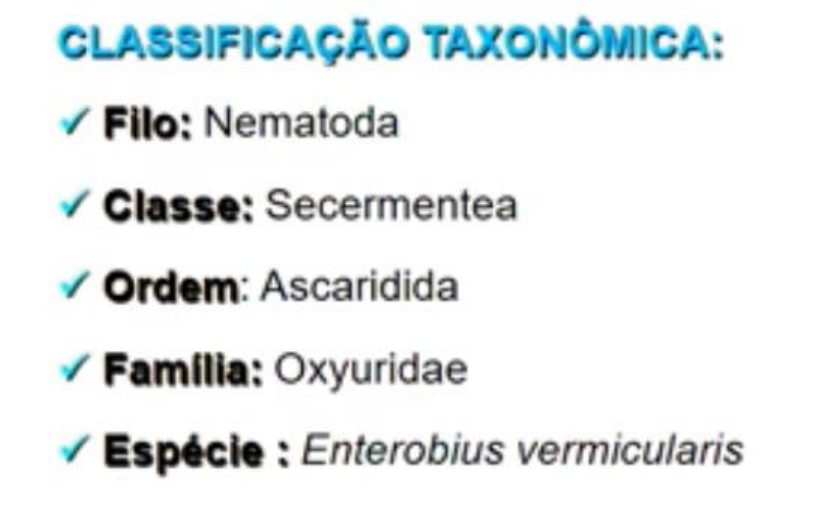 Jonas César Universidade de Vassouras Turma 103 B OXIUROSE(Enterobiose) → Causada por um parasito que se aloja no Intestino Grosso(APENAS DE SERES HUMANOS). Nematódeos apresentam ciclo monoxênicos. .Capacidade de infecção muito grande. .Muito difundido em difundido em ambientes coletivos. .Facilidade de infectar os seres humanos. → Em países de clima temperado é comum que as pessoas se aglomerem dentro de casa quando há nevascas ,por exemplo. → No Brasil, isso ocorre com mais frequência nos invernos da região sul do país. → A partir de 15 anos de idade o corpo humano apresenta um sistema imunológico mais maduro ,o que dificulta a instalação do verme. As fêmeas são maiores que os machos. Além disso ,elas a presentam como característica marcante a região posterior do corpo bastante afilada. As fêmeas têm ,em média,1 cm de comprimento. Elas possuem asas cervicais que funcionam como órgão de fixação no Intestino Grosso. OBS: .Esses vermes tem a capacidade de parasitar o corpo humano por volta de 2 meses. Tal como se comprova na imagem A, o macho apresenta a região posterior do corpo espiralada . O macho tem ,em média ,0,5 cm. ➢ Tanto o macho quanto a fêmea apresentam uma coloração branca, o que permite a identificação desses vermes no organismo ,principalmente quando a carga parasitária é alta. O ovo tem um formato irregular e ,após ser eliminado do corpo eles apresentam um larva infectante ,o que contribui para a sua alta capacidade de contaminação. .Esse ovo tem um tempo de duração no ambiente bastante grande(3 a 6 meses).MAIOR TRANSMISSIBILIDADE Filiformes = Alongadas As fêmeas vivem mais no corpo. Elas chegam a migrar para a região perianal . Os machos morrem logo após a cópula. Por uma carga parasitária alta, pode haver apendicite como consequência. O sintoma clássico da presença de fêmeas na região perianal é o prurido na região . .Ao coçar ,o indivíduo fica com a mão repleta de ovos e passa a espeçar esses ovos para o ambiente. .Esses ovos também podem ficar contidos em roupas íntimas,roupas de cama e vários outros. Quando a fêmea chega na região perianal ,ela sofre um processo de dessecação ,no qual seu tegumento se rompe e seus ovos são liberados para o ambiente. TRASSMISSÃO : Heteroinfecção : Os ovos liberados pelo corpo de um indivíduo são liberados pelo ambiente e são ingeridos por outro organismo. Autoinfecção indireta: Os ovos passam pelo ambiente e retornam para o mesmo indivíduo.(Alimentos e objetos) Autoinfecção direta externa: O indivíduo coça a região perianal e esse individuo leva a mão a boca.(PERPETUAÇÃO) MUITO FREQUENTE Autoinfecção direta interna: As fêmeas se rompem ainda dentro do Intestino Grosso. Retroinfecção : Ovos ficam retidos na região perianal do indivíduo e desses ovos eclodem as larvas ,as quais podem retornar pelo ânus até a porção do CECO. Essas larvas podem adentrar no canal Vaginal e atingem o Sistema Urogenital feimenino.(RETROINFECÇÃO ECTÓPICA) Podem adentrar no canal da Uretra também . • Pode haver diarreia em caso de uma carga parasitária muito alta. • Não há desnutrição, pois eles se alojam no Intestino Grosso. • Em caso de uma carga parasitária muito alta, pode haver Enterite catarral e região anal também repleta de muco. O método da fita adesiva é utilizado na pesquisa de ovos de Enterobius vermicularis. Com o auxílio de um tubo de ensaio, realiza-se pressão em uma fita gomada transparente (parte colante) sobre o ânus e região perianal. Os ovos e, ocasionalmente, as fêmeas adultas se aderem à superfície pegajosa da fita, que é colada na lâmina e observada em microscópio. Médias de controle: → Não sacudir a roupa de cama da pessoa infectada pela manhã, mas sim enrolar e lavar em água fervente todos os dias. O verme possui hábito noturno, ou seja, a fêmea do verme coloca os ovos na região anal à noite, e o fato da criança coçar, por exemplo, pode fazer com que os ovos sejam espalhados na roupa de cama. → Cortar as unhas e evitar roê-las, pois evita que os ovos sejam transportados nas unhas e ingeridos; → Limpar a casa com aspirador, pois evita que os ovos sejam espalhados; → Consumir apenas água filtrada ou engarrafada, evitando consumir água que aparentemente não esteja própria para consumo; → Lavar bem os alimentos antes de prepará-los. Os alimentos que são consumidos com casca devem permanecer de molho numa bacia com 1 litro de água e 1 colher de cloro por pelo menos 20 minutos. → Lavar bem as mãos antes e depois de ir ao banheiro, bem como antes de preparar os alimentos. Os indivíduos parasitados devem: Lavar suas roupas separadamente. Tomar um ótimo banho pela manhã. É PRUDENTE TRATAR TODOS OS MEMBROS DA FAMÍLIA EM CASO DE UM DELES ESTAR COONTAMINADO COM O VERME. Vamos praticar : 1) Paciente, masculino, 21 a nos de idade, foi admitido na emergência do Hospital de clínicas de Porto Alegre, relatando dor abdominal do tipo cólica, além de prurido anal noturno recorrente e enterite catarral. Não relatou alteração do hábito intestina l, vômitos o u febre. O médico, suspeitando do diagnóstico de enterobíase, solicitou o correto exame laboratorial. O paciente, após ser submeti do ao exame, teve o diagnósti coconfirmado. a) O médico pode ter solicitado exame parasitológico de fezes para o diagnóstico desta parasitose? Justifique sua resposta. Não, o exame ideal é o da fita gomada, pois os ovo se encontram na região perianal e não na luz intestinal , logo dificilmente são encontrados nas fezes. b) Quais cuidados devem ser tomados pelo p aciente a ntesda realização do exame? O paciente não deve ter evacuado ou realizado higiene no local . c) Enterobíase é uma parasitose caracterizada como ‘ ’ doença de mãos sujas’ ’ , já que os ovos de Enterobius vermicularis não precisam passar pelo solo para maturação . Diante disso , descreva as seguintes forma