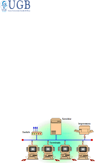 Curso de Tecnologia em Redes de Computadores Disciplina: Redes I – Fundamentos - 1º Período Professor: José Maurício S. Pinheiro Material de Apoio IV TOPOLOGIAS DE REDE A topologia define a estrutura da rede. Existem duas partes na definição da topologia, a topologia física e a topologia lógica. A topologia física trata do layout, ou seja, a forma como os dispositivos ficarão dispostos na rede. A topologia lógica define como os meios são acessados e à forma como os sinais trafegam pelos dispositivos. Há diversas topologias utilizadas nos ambientes de comunicação inter-redes atuais e várias são as estratégias de topologia, embora as variações sempre derivem de três topologias básicas que são as mais frequentemente empregadas: barramento, anel e estrela. 1. Barramento Uma topologia de barramento é uma topologia de rede multiponto onde todos os dispositivos estão conectados por um cabo comum ou links de comunicação (Figura 1). Alguns dos exemplos de redes em multiponto: Ethernet (802.3) e Token Bus (802.4). Figura 1 - Topologia em Barramento PROJETO DE REDES www.projetoderedes.com.br 1.1. Características Gerais A Ethernet utiliza o que se conhece por topologia de barramento por contenção. Qualquer estação na rede pode transmitir à medida que nenhuma outra estação esteja transmitindo. Quanto maior o número de estações na rede desejando transmitir, pior será o desempenho geral. Como regra geral, as topologias de barramento apresentam facilidade de instalação e fácil expansão, uma vez que utiliza menos cabeamento que outras tecnologias. Geralmente é possível expandir a rede sem que seja afetada a sua operação. A facilidade de instalação 1.2. Vulnerabilidade A dificuldade de mudar ou mover nós é uma desvantagem e praticamente não oferece tolerância a falhas. Há grande dificuldade de diagnosticar falhas ou erros e um defeito no barramento interromperá a rede. Entretanto, em uma rede adequadamente projetada e construída, tais defeitos não são comuns. Uma falha em uma única estação de trabalho geralmente não afeta a rede toda. 2. Anel A topologia em anel é uma topologia ponto-a-ponto onde os dispositivos da rede estão conectados entre si em um circuito fechado (Figura 2). Um exemplo de topologia e anel é o Token Ring (802.5) e a Fiber Distributed Data Interface (FDDI). Cada estação deve processar o sinal antes de passá-lo (ou repeti-lo) à próxima estação. Figura 2 - Topologia em Anel 2.1. Características Gerais As topologias em anel comumente utilizam um método de acesso chamado token passing. Nenhuma estação pode transmitir a menos que tenha uma ficha livre. Baseado nesta restrição em transmissão, diz-se que o token ring é determinístico, pois é possível calcular exatamente os períodos de atraso de transmissão. As topologias em anel são fáceis de expandir, mas podem envolver cálculos de comprimentos de cabos a fim de manter a rede dentro da especificação. É simples acrescentar ou remover estações em uma rede e isto pode ser realizado enquanto a rede estiver em operação. Não são necessários armários de distribuição de cabos uma vez que as ligações são efetuadas em cada um dos nós. O desenho do cabeamento é bastante simples. 2.2. Vulnerabilidade A falha de um nó pode provocar a falha da rede. Também apresenta certo grau de dificuldade de localização de falhas. Há dificuldade em reconfigurar a rede (instalação de vários nós em locais diferentes). Softwares de alto nível se encarregam de reconhecer nós defeituosos e também de removê-los da rede re- configurando automaticamente o anel. Entretanto, pode ocorrer dificuldade no estabelecimento de protocolo de acesso à rede dado que cada nó terá que assegurar a continuidade do sistema e só após a certificação de que a rede está disponível poderá enviar a sua própria informação. 3. Estrela A topologia em estrela é uma rede ponto-a-ponto onde os dispositivos de rede estão conectados a um concentrador ou controlador central (Figura 3). Empregam- se dois métodos de acesso: polling e contenção. Figura 3 - Topologia Estrela • Polling - Os dispositivos não podem transmitir mensagens a menos que recebam permissão de um computador ou controlador central. Um dispositivo deve aguardar para transmitir até que o controlador solicite as informações. O desempenho de uma rede de polling depende do desempenho do controlador e do número de dispositivos que estão anexados a ele. Um defeito no controlador interromperá a rede. O defeito em um nó individual, normalmente não afetará o resta da rede. • Contenção - É método de acesso utilizado em redes Ethernet. As estações de trabalho estão conectadas a um concentrador. As regras de contenção ditam que somente uma estação pode transmitir a qualquer momento e qualquer estação pode transmitir contanto que a rede esteja em silêncio. Esse método de acesso elimina a necessidade de polling e melhora a vazão de dados e o desempenho. Os concentradores podem ser expandidos a fim de controlar centenas de dispositivos sem a degradação de desempenho. Realiza-se facilmente a expansão simplesmente encaixando uma conexão no concentrador. Um defeito no concentrador pode interromper parte da rede. Alguns fabricantes permitem backup redundante do concentrador e múltiplas fontes de alimentação com carga compartilhada, a fim de eliminar um ponto único de defeito. Um defeito em um nó normalmente não afetará a operação da rede. 3.1. Vantagens • Facilidade de modificação do sistema, já que todos os cabos convergem para um só ponto; • Se um dispositivo falhar, apenas ele é afetado; • Fácil detecção e isolamento de falhas; • Simplicidade no protocolo de comunicações. Resume-se a selecionar qual o nó periférico que em cada momento está ligado ao nó central. 3.2. Desvantagens • Maior comprimento de cabo para efetuar ligações. A distância máxima se