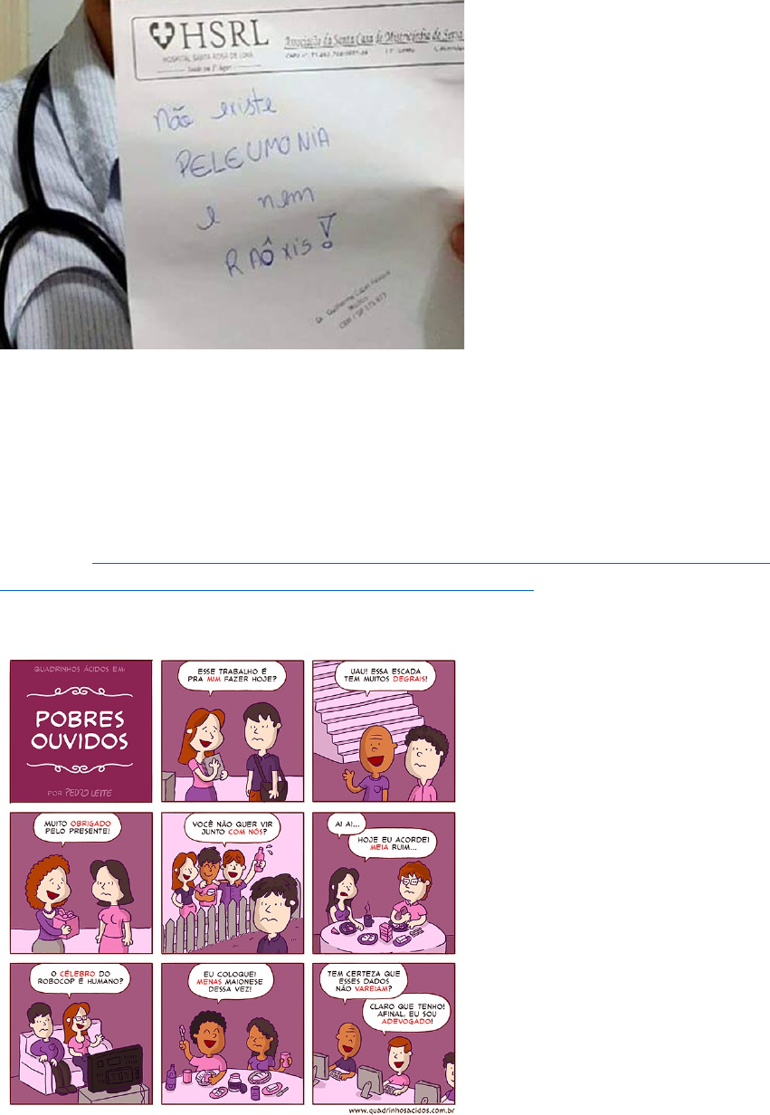 Na imagem acima podemos observar a manifestação de um profissional da saúde satirizando o jeito como um de seus pacientes pronunciou as palavras “pneumonia” e “raio X”. O médico chegou a postar essa foto nas redes sociais expondo o ocorrido, contudo houve muitas respostas repudiando sua atitude, principalmente da família do paciente. Ele foi afastado e se desculpou publicamente. Noticia: https://vejasp.abril.com.br/blog/pop/a-reacao-nada-profissional-de-um-jovem-medico-no-facebook-provocou-seu-afastamento/ Na imagem acima observamos o incomodo recorrente do protagonista devido algumas palavras usadas ou faladas fora da norma. Pela expressão do personagem e pelo titulo do texto fica explicito o preconceito linguístico. A desaprovação e julgamento da maneira de falar dos demais, mesmo cumprindo o objetivo da comunicação. Era bruto, sim senhor, nunca havia aprendido, não sabia explicar-se. Estava preso por isso? Como era? Que mal fazia? Então mete-se um homem na cadeia porque ele não sabia falar direito? Que mal fazia a brutalidade dele? Vivia trabalhando como um escravo. Desentupia o bebedouro, consertava as cercas, curava os animais – aproveitara um casco de fazenda sem valor. Tudo em ordem podiam ver. Tinha culpa de ser bruto? Quem teria culpa? [...] Difícil pensar. Vivia agarrado aos bichos... Nunca vira uma escola. Por isso não conseguia defender-se, botar as coisas nos seus lugares (RAMOS, 2005, p. 35). Na palma da mão as notas estavam úmidas de suor. Desejava saber o tamanho da extorsão. Da última vez que fizera contas com o amo o prejuízo parecia menor. Alarmou-se. Ouvira falar em juros e em prazos. Isto lhe dera uma impressão bastante penosa: sempre que os homens sabidos lhe diziam palavras difíceis, ele saía logrado. Sobressaltava-se escutando-as. Evidentemente só serviam para encobrir ladroeiras. Mas eram bonitas. Às vezes decorava algumas e empregava-as fora de propósito. Depois esquecia-as. Para que um pobre da laia dele usar conversa de gente rica? Sinhá Terta é que tinha uma ponta de língua terrível. Era: falava tão bem quanto as pessoas da cidade. Se ele soubesse falar como Sinhá Terta, procuraria serviço em outra fazenda, haveria de arranjar-se. Não sabia. Nas horas de aperto dava para gaguejar, embaraçava-se como um menino, coçava os cotovelos, aperreado. Por isso esfolavam-no. Safados. Tomar as coisas de um infeliz que não tinha nem onde cair morto! Não viam que isso não estava certo? Que iam ganhar com semelhante procedimento? Hem? Que iam ganhar? ... (RAMOS, 2005, p. 35). Os dois trechos da obra Vidas Secas – Graciliano Ramos apresentam as consequências do preconceito linguístico. No primeiro fica evidente que o Fabiano (personagem principal) foi preso por uma falha na comunicação com o guarda, por ele não saber falar como o mesmo, não se expressar de maneira “correta”. No segundo Fabiano lamenta não saber falar como a Sinha Terta, pois se ele soubesse não seria enganado pelo patrão; Este que aproveitava de sua ignorância para lhe explorar e extorquir usando palavras que não pudera compreender, desta forma refutava seus argumentos e reivindicações de seus direitos, além de ameaças de demissão.