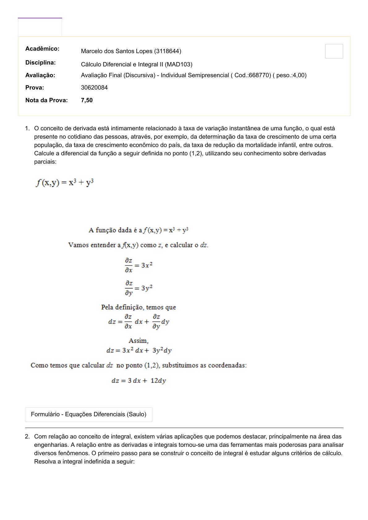 23/04/2021 UNIASSELVI - Centro Universitário Leonardo Da Vinci - Portal do Aluno - Portal do Aluno - Grupo UNIASSELVI https://portaldoalunoead.uniasselvi.com.br/ava/notas/gabarito_tentativas.php?action1=RU5HMDE3NQ==&action2=TUFEMTAz&action3=NjY4Nz… 1/2 Acadêmico: Marcelo dos Santos Lopes (3118644) Disciplina: Cálculo Diferencial e Integral II (MAD103) Avaliação: Avaliação Final (Discursiva) - Individual Semipresencial ( Cod.:668770) ( peso.:4,00) Prova: 30620084 Nota da Prova: 7,50 1. O conceito de derivada está intimamente relacionado à taxa de variação instantânea de uma função, o qual está presente no cotidiano das pessoas, através, por exemplo, da determinação da taxa de crescimento de uma certa população, da taxa de crescimento econômico do país, da taxa de redução da mortalidade infantil, entre outros. Calcule a diferencial da função a seguir definida no ponto (1,2), utilizando seu conhecimento sobre derivadas parciais: Resposta Esperada: A resposta deverá seguir a resolução a seguir: Anexos: Formulário - Equações Diferenciais (Saulo) 2. Com relação ao conceito de integral, existem várias aplicações que podemos destacar, principalmente na área das engenharias. A relação entre as derivadas e integrais tornou-se uma das ferramentas mais poderosas para analisar diversos fenômenos. O primeiro passo para se construir o conceito de integral é estudar alguns critérios de cálculo. Resolva a integral indefinida a seguir: Tentativa 1 Tentativa 2  https://portaldoalunoead.uniasselvi.com.br/extranet/layout/request/imag_prova_ead_anexo_n2.php?action1=MzA2MjAwODQ=&action2=NzUyMjU2 23/04/2021 UNIASSELVI - Centro Universitário Leonardo Da Vinci - Portal do Aluno - Portal do Aluno - Grupo UNIASSELVI https://portaldoalunoead.uniasselvi.com.br/ava/notas/gabarito_tentativas.php?action1=RU5HMDE3NQ==&action2=TUFEMTAz&action3=NjY4Nz… 2/2 Resposta Esperada: Resposta esperada: Anexos: Formulário - Cálculo Diferencial e Integral (MAD) - Paulo https://portaldoalunoead.uniasselvi.com.br/extranet/layout/request/imag_prova_ead_anexo_n2.php?action1=MzA2MjAwODQ=&action2=NzUyMjU3