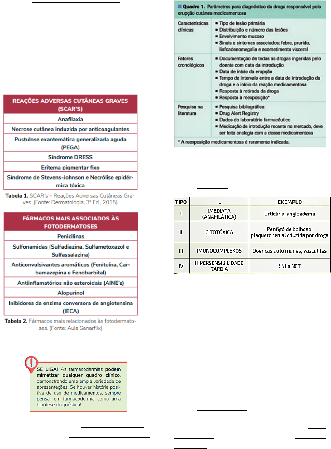 Soniely Melo FARMACODERMIAS Reação cutânea adversa a medicamentos; RMA – reações adversas medicamentosas Podem aparecer até 6 semanas após o uso de determinada medicação; 0,1 – 1% da população geral; 2 – 3% dos hospitalizados; Pode mimetizar qualquer quadro clínico! O mecanismo alérgico é dose independente, e acomete apenas os indivíduos susceptíveis, que podem cursar com farmacodermias graves mesmo com doses bem pequenas. DIAGNÓSTICO DA DROGA ENVOLVIDA FISIOPATOLOGIA Alérgica: classificação Gel – Coombs Tipo I – imediata – ocorre por IgE o estímulo à degranulação dos mastócitos com liberação de histamina. Tipo II – citotóxico – os anticorpos lesam as células. Tipo III – imunocomplexos – formação do complexo antígeno- anticorpo. Tipo IV – imediado por imunidade celular, não pela humoral, sendo efetivado pela ação de Linfócitos T. Não alérgica: + comuns; o mecanismo não alérgico é dose- dependente, e pode atingir qualquer indivíduo. Ocorrem por diversos fatores, ex: Soniely Melo ▪ Superdosagem: o organismo não consegue metabolizar nem excretar, gerando efeitos adversos; ▪ Fatores individuais: principalmente patologias hepáticas e/ou renais, cursando com alteração na metabolização e excreção dos medicamentos; ▪ Efeitos colaterais: queda de cabelo por quimioterapia; ▪ Teratogênese - necrose cutânea por cumarínico: nos primeiros dias os cumarínicos tem efeito pro- trombótico, podendo levar a trombose de vasos cutâneos, com consequente necrose cutânea. - reação de Jarish-Herxheimer: ocorre, por exemplo, na sífilis, quando é tratada com penicilina; os microrganismos morrem em grande quantidade, liberam substancias tóxicas, podendo piorar as lesões de pele na fase inicial do tratamento; - urticária não alérgica: quando a própria substância leva a degranulação dos mastócitos e liberação de histamina; ex: contraste iodado e morfina. PRINCIPAIS FARMACODERMIAS ➢ EXANTEMA: 75% Aparece até 2 semanas após uso da medicação; Rash maculopapular eritematoso pruriginoso simétrico, geralmente mobiliforme e que desaparece à digito-pressão; tronco e mmss; Curso benigno; Tto: suspender a medicação; Em situações mais graves, pode-se utilizar anti-histamínicos e corticosteroides. ➢ URTICÁRIA E ANGIOEDEMA 25%; ocorrendo principalmente em associação ao uso de antibióticos, AINE’s e anestésicos. FISIOPATOLOGIA: A urticária induzida por drogas pode ser alérgica (imunologicamente mediada) ou pseudoalérgica (não imunologicarnente mediada). -- > mediada por IgE; - - > Na reação tipo III, o complexo lgG-droga ativa a cascata do complemento liberando C3a e CSa, anafilatoxinas que degranulam mastócitos e basófilos. Este tipo de reação é responsável pela urticária vasculite induzida por drogas. --- > mecanismos não imunomediados: Não existe fase de sensibilização e a reação pseudoalérgica pode ocorrer no primeiro contato com adroga. As reações pseudoalérgicas parecem ser dose-dependentes e ocorrer até 24 horas após a ingestão da droga, com Soniely Melo 50% ocorrendo nas primeiras 6 horas. As reações alérgicas IgE-dependentes ocorrem minutos após a exposição). Aguda: até 6 semanas Crônica: > 6 semanas dura até 2-5 anos; Contínua ou Recorrente; Forma imediata (30 min); Urtica ou ponfo – edema de derme superficial: placas eritematosas com centro pálido; pruriginosas; Angioedema -edema da derme profunda-(50%) - caracterizado com edema de mucosa labial, língua e região periocular -> edema de glote -> choque anafilático Tto: suspensão da droga + anti-histamínicos Os anti-histamínicos são mantidos por ao menos 14 dias, iniciando-se o tratamento com os anti-H1 não sedantes, progredindo para os anti-H1 clássicos se não houver resposta. Caso haja urticária crônica com exacerbações importantes, pode-se realizar um curso curto (7 a 14 dias) de corticosteroides orais. CHOQUE ANAFILÁTICO: adrenalina 0,5 ml IM/SC (meia ampola); ➢ ERITEMA PIGMENTAR FIXO 10%; Lesões únicas ou múltiplas; pode formar bolhas; Eritematosas -> acastanhadas; surge em até 24h da exposição, persiste até 2-3 semanas; Hiperpigmentação residual; Soniely Melo A cada nova exposição -> lesões nos mesmos locais; TTO: afastamento do agente causal e, eventualmente, aplicação de corticoides tópicos em casos mais graves. ➢ ERITEMA MULTIFORME MINOR 5%; Lesões herpéticas (herpes simplex vírus); Eritema polimorfo = diversas morfologias; LESÃO CLÁSSICA: em alvo; se dissemina das extremidades para o tronco -> pelo menos 3 anéis concêntricos, de diferentes colorações e com bordas elevadas; Existem ainda lesões atípicas; Curso benigno; regride em 2 semanas; 20% evoluem para a forma eritematosa multiforme major (síndrome de steven- jhonson); Soniely Melo ➢ STEVENS-JOHNSON E NECRÓLISE EPIDÉRMICA TÓXICA MESMA doença, DOIS espectros diferentes As principais drogas associadas são antibióticos (principalmente as sulfas), anticonvulsivantes, AINE’s e alopurinol. SSJ NET + comum (2x mais) + grave (letalidade 10x mais) 15 dias após exposição ao fármaco Autolimitada (1 mês) -> sem sequelas cutâneas e com sequelas mucosas Microorganismos (Mycoplasma pneumoniae 15%) Inicia com pródromos, em geral, gripais Evolue para Rash maculopapular eritematoso Disseminação centrífuga Doloroso Com lesões em alvo atípicas Bolhas hemorrágicas Sinal de Nikolsky positivo apenas nas áreas acometidas *ddx: pênfigo Desnudamento: SSJ < 10%; Desnudamento NET > 30% SSJ NET Lesões mucosas obrigatórias >OU = 2 áreas (oral, ocular, genital) Acometimento da mucosa ocular -> cegueira TTO: internação, reposição hidroeletrolítica, nutrição enteral, lubrificante ocular NÃO usar AGT profilático sistêmico, nem sulfadiazina de prata - - - -> porque a chance do paciente ter farmacodermia a esses medicamentos é muito grande!! Existem contradições na literatura sobre a utilização d
