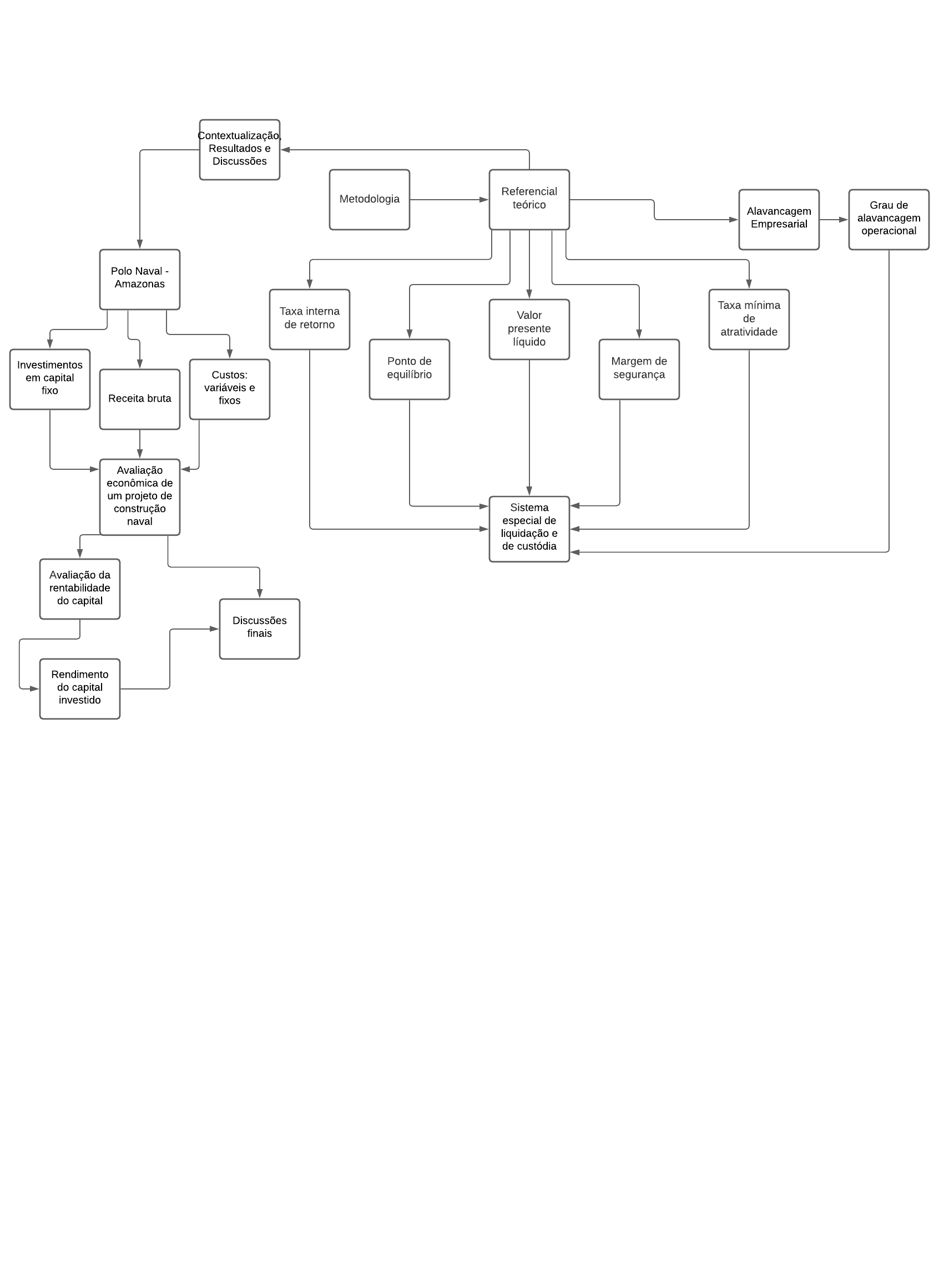 Metodologia Referencial teórico Valor presente líquido Taxa interna de retorno Taxa mínima de atratividade Ponto de equilíbrio Margem de segurança Alavancagem Empresarial Grau de alavancagem operacional Sistema especial de liquidação e de custódia Contextualização, Resultados e Discussões Polo Naval - Amazonas Investimentos em capital fixo Receita bruta Custos: variáveis e fixos Avaliação econômica de um projeto de construção naval Avaliação da rentabilidade do capital Rendimento do capital investido Discussões finais Diagrama em branco Página 1