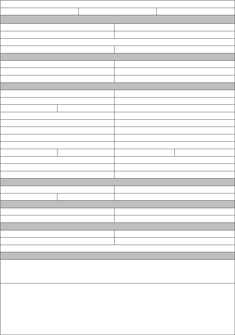 AVALIAÇÃO NUTRICIONAL DO ADULTO Nome: Idade: Sexo: Raça/cor: Avaliação Antropométrica Peso atual (Kg): Altura (m): IMC (Kg/m²): Classificação: Peso habitual (Kg): % Mudança de peso: Classificação: Peso teórico mínimo (Kg): Peso teórico máximo (Kg): Peso ideal (Kg): Peso ajustado (Kg): % adequação do peso: Classificação: PP: Classificação: PC: Classificação: PQ: RCQ: Classificação: RCE: Classificação: PB: % adequação do PB: Classificação: CMB: % adequação da CMB: Classificação: PCT: PCB: PCSE: PCSI: % adequação da PCT: Classificação: AMBc: Classificação: AGB: Classificação: %GC BIA: Classificação: ∑PC: % GC: Classificação: Água BIA (%): MM BIA (Kg): MO BIA (Kg): Gordura visceral: IMC MLG (Kg/m²): Classificação: IMC MG (Kg/m²): Classificação: Distribuição da GC: ( ) Androide ( ) Ginoide Diagnóstico Nutricional: Legenda: PP: perímetro da panturrilha; PC: perímetro da cintura; PQ: perímetro do quadril; RCQ: relação cintura/quadril; RCE: relação cintura/estatura; PB: perímetro do braço; CMB: circunferência muscular do braço; PCT: prega cutânea tricipital; PCB: prega cutânea bicipital; PCSE: prega cutânea subescapular; PCSI: prega cutânea suprailíaca; AMBc: área muscular do braço corrigida; AGB: área de gordura do braço; %GC: percentual de gordura corporal; BIA: bioimpedância; ∑PC: somatório das quatro pregas cutâneas; MM: massa magra; MO: massa óssea; MLG: massa livre de gordura; MG: massa de gordura. Referências para classificação IMC = Kg / m² IMC (Kg/m²) Classificação < 16 Magreza grau III 16 a 16,9 Magreza grau II 17 a 18,4 Magreza grau I 18,5 a 24,9 Eutrofia 25 a 29,9 Pré-obeso 30 a 34,9 Obesidade grau I 35 a 39,9 Obesidade grau II ≥ 40 Obesidade grau III Fonte: OMS, 1995 e 1998. Mudança de peso (%) = (peso usual – peso atual) x 100 / peso usual Tempo Perda significativa de peso (%) Perda grave de peso (%) 1 semana 1 a 2 > 2 1 mês 5 > 5 3 meses 7,5 > 7,5 6 meses 10 > 10 Fonte: Blackburn, G.L. & Bistrian, B.R., 1977. Peso Teórico Mínimo = IMC mínimo X estatura (m)² Peso Teórico Máximo = IMC máximo X estatura (m)² Peso ideal ou desejável = IMC desejado X estatura (m)² Peso ajustado = (peso ideal – peso atual) x 0,25 + peso atual Adequação do peso (%) = Peso atual x 100 / peso ideal Adequação do peso (%) Estado nutricional ≤ 70 Desnutrição grave 70,1 a 80 Desnutrição moderada 80,1 a 90 Desnutrição leve 90,1 a 110 Eutrofia 110,1 a 120 Sobrepeso > 120 Obesidade Fonte: Blackburn, G.L. & Thotnton, P.A., 1979. PP < 35 cm Indicativo de perda de MM PC Risco de complicações metabólicas associadas à obesidade Sexo Elevado Muito elevado Feminino ≥ 80 cm ≥ 88 cm Masculino ≥ 94 cm ≥ 102 cm Fonte: WHO, 1998. RCQ = PC / CQ Sexo WHO, 1995 WHO, 1998 Feminino > 0,80 > 0,85 Masculino > 0,95 > 1,00 Fonte: WHO, 1995 e 1998. RCE = PC / Estatura RCE < 0,5 = sem indicação de risco cardiovascular Fonte: Ashwell e Hsieh, 2005; McCarthy e Ashwell, 2006. Adequação da PB (%) = PB obtida (cm) / PB percentil 50 x 100 Observação: Obtenção do Percentil 50. Desnutrição grave Desnutrição moderada Desnutrição leve Eutrofia Sobrepeso Obesidade PB < 70% 70 a 80% 80 a 90% 90 a 110% 110 a 120% > 120% Fonte: Blacknurn, G.L. & Thornton, P.A., 1979. CMB (cm) = CB (cm) – π x [PCT (mm) / 10] Adequação da CMB (%) = CMB obtida (cm) / CMB percentil 50 x 100 Observação: Obtenção do Percentil 50. Desnutrição grave Desnutrição moderada Desnutrição leve Eutrofia CMB < 70% 70 a 80% 80 a 90% > 90% Fonte: Adaptado de Blacknurn, G.L. & Thornton, P.A., 1979. Adequação da PCT (%) = PCT obtida (mm) / PCT percentil 50 x 100 Observação: Obtenção do Percentil 50. Desnutrição grave Desnutrição moderada Desnutrição leve Eutrofia Sobrepeso Obesidade PCT < 70% 70 a 80% 80 a 90% 90 a 110% 110 a 120% > 120% Fonte: Blacknurn, G.L. & Thornton, P.A., 1979. Homem AMBc (cm²) = Mulher AMBc (cm²) = Observação: Obtenção do Percentil no Apêndice. Normal Desnutrição leve/moderada Desnutrição grave AMBc Percentil > 15 Percentil entre 5 e 15 Percentil < 5 Fonte: Frisancho, A.R., 1990. AGB (cm²) = Observação: Obtenção do Percentil no Apêndice. AGB Estado Nutricional < Percentil 25 Depleção de reservas energéticas e proteica Percentil entre 25 e 90 Eutrofia ≥ Percentil 90 Obesidade Fonte: Frisancho, A.R., 1990. ∑ = somatório das 4 pregas cutâneas Gordura Corporal (%GC) Sexo Feminino Masculino Desnutrição < 8% < 6% Normal 9% a 22% 6% a 14% Média 23% 15% Excesso 24% a 31% 16 a 24% Obesidade ≥ 32% ≥ 25% Fonte: Lee e Nilman, 1985. IMC da MG IMC da MLG IMCG = PG (Kg) / A² (m²) IMCLG = PLC (Kg) / A² (m²) Fonte: Vanitalle, 1990. 1