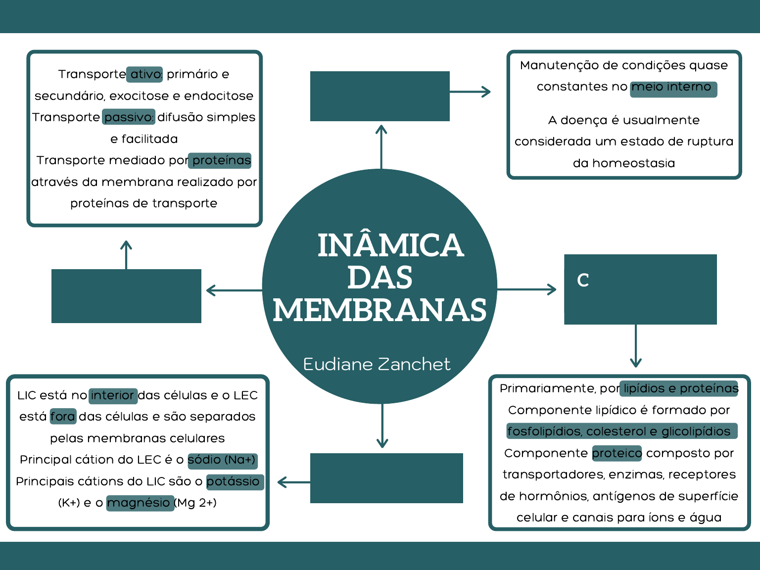 Homeostasia Constituição da Membrana LIC e LEC Transportes Manutenção de condições quase constantes no meio interno A doença é usualmente considerada um estado de ruptura da homeostasia DINÂMICA DAS MEMBRANAS Primariamente, por lipídios e proteínas Componente lipídico é formado por fosfolipídios, colesterol e glicolipídios Componente proteico composto por transportadores, enzimas, receptores de hormônios, antígenos de superfície celular e canais para íons e água LIC está no interior das células e o LEC está fora das células e são separados pelas membranas celulares Principal cátion do LEC é o sódio (Na+) Principais cátions do LIC são o potássio (K+) e o magnésio (Mg 2+) Transporte ativo: primário e secundário, exocitose e endocitose Transporte passivo: difusão simples e facilitada Transporte mediado por proteínas através da membrana realizado por proteínas de transporte Eudiane Zanchet DINÂMICA DAS MEMBRANAS Eudiane Zanchet O compartimento intracelular contém alguns ânions que não possuem cátions correspondentes, conferindo às células carga líquida negativa Compartimento extracelular possui carga líquida positiva A separação das cargas ocorre através da membrana celular Potencial de Membrana em Repouso Conceitos Gradiente químico: diferença na concentração de uma substância entre dois locais Gradiente de pressão: no fluxo de massa, um gradiente de pressão faz o fluido fluir de regiões de pressão mais alta para regiões de pressão mais baixa Gradiente eletroquímico: combinação de gradientes elétricos e de concentração Lipofílicas solúveis em lipídeos e lipofóbicas se dissolvem em água Moléculas que se dissolvem em água: hidrofílicas e que não se dissolvem em água, são hidrofóbicas Potencial de membrana em repouso é a diferença de potencial existente através da membrana das células excitáveis O potássio é o principal cátion no interior das células, e o sódio domina o líquido extracelular O que cria o potencial de membrana é o gradiente de concentração de íons entre LEC e LIC e a membrana celular seletivamente permeável