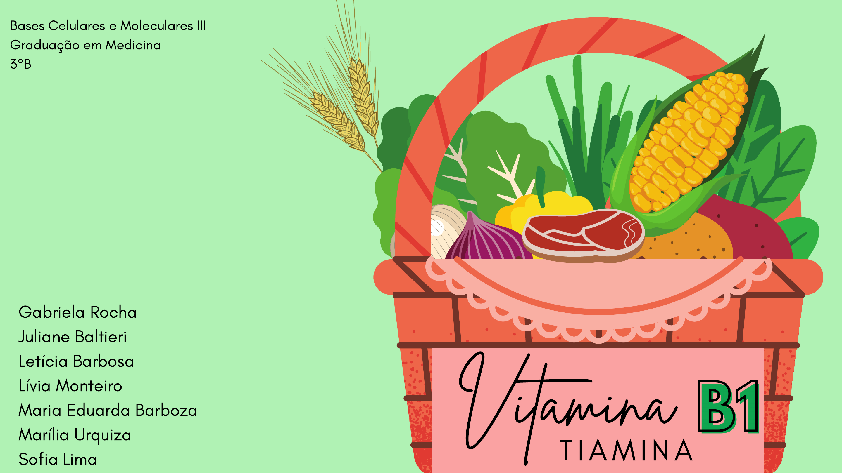 Gabriela Rocha Juliane Baltieri Letícia Barbosa Lívia Monteiro Maria Eduarda Barboza Marília Urquiza Sofia Lima Vitamina Bases Celulares e Moleculares III Graduação em Medicina 3°B T I A M I N A T I A Z O L + P I R I M I D I N A = V I T A M I N A B 1 · F Ó R M U L A : E S T R U T U R A 1 Quantidade de Tiamina no Soro ou Sangue Atividade da Transcetolase Eritrocitária Consumo dietético Sinais e Sintomas C O M O A V A L I A R ? 2 MEDICINA Papel essencial no metabolismo dos carboidratos; Ação no metabolismo de gorduras e proteínas, agindo como uma coenzima - a difosfato de tiamina. Tiamina + fósforo coenzima pirofosfato de tiamina (TPP ou TDP) Necessária para a descarboxilação oxidativa do piruvato para formar acetato ativo (acetil-CoA) – componente principal da via metabólica do ciclo de Krebs. M E T A B O L I S M O 3 Levedura de cerveja seca; Carne (porco, cordeiro, vaca); Aves; Cereais de grão inteiro; Leguminosas; Leite; Ovos. F O N T E S 4 Metabolismo da glicose; Protege a saúde do fígado; Essencial para o funcionamento normal do sistema nervoso; Obtenção de energia do glicogênio muscular; Controla os impulsos nervosos; Previne o processo neurodegenerativo. F U N Ç Õ E S 5 Insônia; Nervosismo; Cansaço; Perda de memória; Perda de apetite; Dificuldades respiratórias; Edemas dos membros respiratórios; Insuficiências cardíaca; Formigamento; Beribéri; Síndrome de Korsakoff; H I P O V I T A M I N O S E 6 H I P O V I T A M I N O S E Deficiência de B1 pela má alimentação ou alcoolismo; Sintomas: perda de apetite, fraqueza, dor nos membros, falta de ar e pés e pernas inchados; Tratamento: suplementação de B1 e dietas ricas em alimentos como cereais integras, feijão e carne vermelha; Tipos: Beribéri seco, Beribéri úmido, Beribéri grave Sintomas: confusão mental, amnesia e diminuição da percepção dos sentidos; Causado pelo consumo excesso de álcool; Beribéri: Síndrome de Korsakoff: 7 Intoxicação; Neuropatias; Disfunção cardiovascular e cerebral; Encefalopatia; Confabulação; Falta de memória; Esse excesso é eliminado na urina. H I P E R V I T A M I N O S E 8 C A S O C L Í N I C O Homem de 20 anos, pardo, trabalhador rural braçal, apresentando parestesia e edema de membros inferiores há 10 meses e há um mês edema generalizado e dispneia aos esforços. Sem antecedentes de tabagismo e, na história alimentar, relatada ingestão de uma a duas garrafas de cerveja nos finais de semana. Os exames laboratoriais revelaram ausência de proteinúria em urina de 24h; níveis de ureia, creatinina, albumina e bilirrubinas normais no soro; coagulograma, hemograma e exames da tireoide sem alterações. Ao eletrocardiograma, verificaram-se taquicardia sinusal e bloqueio incompleto de ramo direito. O ecogradiograma da internação revelou aumento das câmaras esquerdas, além de altos valores no percentual de encurtamento e na fração de ejeção. 9 E X A M E S • FC: 100 bpm FR: 16 irpm PA: 140 x 70 mmHgS I N A I S V I T A I S 10 D I A G N Ó S T I C O Deficiência de tiamina (vitamina B1) 11 T R A T A M E N T O Suplementação da vitamina B1 por via oral, em casos mais leves e por via intravenosa nos mais graves Aumentar o consumo de alimentos ricos dessa vitamina como cereais integrais, feijão e carne bovina, e o não consumo de bebidas alcoólicas. B1 TIAMINA 12 R E F E R Ê N C I A S 12 Current aspects of thiamine deficiency on heart function. Life Sci. 2014 PINTO, Hernani; ALVES, Luis. Vitamina B1. Diagn Tratamento, vol. 15, no. 2, p. 69–70, 2010. . Role of thiamine in Alzheimer's disease. Am J Alzheimers Dis Other Demen. 2011 Obrigada! 13