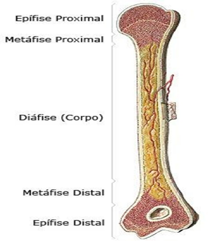 Ossos · Epífise = ´´Cabeça do osso´´, extremidade superior. * Proximal - mais perto da raiz ( mais próximo do tronco ou do ponto de origem) * Distal - mais perto da parte de baixo (que se localiza longe do centro, do ponto de origem ou do ponto de união) · Metáfise = ´´Pescoço do osso´´, * Proximal - mais perto da raiz (mais próximo do tronco ou do ponto de origem) * Distal - mais perto da parte de baixo (que se localiza longe do centro, do ponto de origem ou do ponto de união). · Diáfise: ´´Corpo do osso´´, cresce longitudinalmente, alongando-se. É a parte mais longa do osso. Nos ossos longos a diáfise é composta de grande quantidade de osso compacto, com pequena quantidade de osso esponjo. · Arquitetura do osso · Orgânica: Responsável por conferir o osso a uma certa ´´maleabilidade´´ para suportar pressões sem ocorrer fraturação · Inorgânica: Responsável por dar a resistência e a dureza do osso · Substância óssea · Compacta: Osso estável, compacto, duro · Esponjosa: Aparência de esponja, preenchimento tem medula óssea · Periósteo · Revestido por uma camada de tecido conjuntivo mais fibrosa · Medula óssea · Na região interna tem uma cavidade medular que é preenchida por medula óssea, é mais fácil de encontrar a medula óssea vermelha em animais mais jovens, conforme o animal envelhece vira gordura e fica com aspecto amarelado. A medula óssea é responsável pela produção das células · · Cartilagem epifisária · (linha epifisária) · Permite o crescimento dos ossos. Quando o animal é jovem ela permite o crescimento ósseo, animais jovens tem cartilagem mais definida · Quando o animal chega na vida adulta, maturidade sexual, a cartilagem começa a ossificar · Número de ossos · Vária conforme a idade e o tipo de espécie · Conforme o animal envelhece as estruturas ossificam e viram ´´um osso só´´ · Classificação dos ossos: · Longo: Comprimento maior que a largura e espessura (úmero, rádio, ulna, metacarpo, falanges proximal e média, fêmur, tíbia, fíbula, metacarpo/tarso) · Plano: Comprimento maior que a largura, espessura menor (escápula, alguns ossos do crânio) · Curtos: Comprimento, largura e espessura similares (ossos do carpo) · Irregular: Sem forma definida (base do crânio e vertebras) · Pneumático: Presença de ar no interior, geralmente relacionada com cavidade nasal (ossos do crânio – seio paranasal) · Sesámoide: Ossos associados a articulações com muito estresse · Esqueleto: · É o conjunto de ossos interligados entre si através de algum tecido de união, ligamentos ou cartilagens · Sua função é sustentar os órgãos, músculos. Serve de proteção para órgãos internos · Reservas minerais: Cálcio do sangue · Hematopoiese: Produção de hemácias (medula óssea) · Sistema de alavancas: Sistema locomotor · O esqueleto pode ser separado em 3 partes: · Axial, apendicular, esplâncnico/visceral