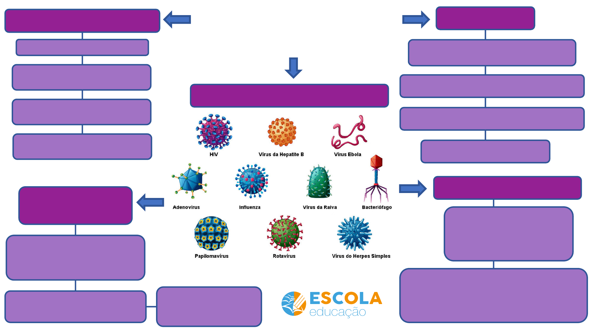 Vírus Doenças causadas por vírus Parasitas intracelulares obrigatórios Organismos acelulares Não possuem metabolismo próprio Material genético passa por muitas mutações Características gerais Mecanismo de infecção Adsorção: fixação na membrana ou parede celular da célula hospedeira Penetração: uso de enzimas para enfraquecer a parede Injeção: introdução do DNA viral e início do parasitismo Reprodução Só conseguem se reproduzir dentro de uma célula hospedeira Síntese de proteínas do capsídeo viral Duplicação do material genético viral Formação dos novos vírus Ciclos de reprodução Lítico: ocorre a produção de novos vírus dentro da célula que se rompe para liberá-los. Lisogênico: DNA viral se acopla ao DNA da célula que se reproduz com o material genético do vírus acoplado em todas células filhas.
