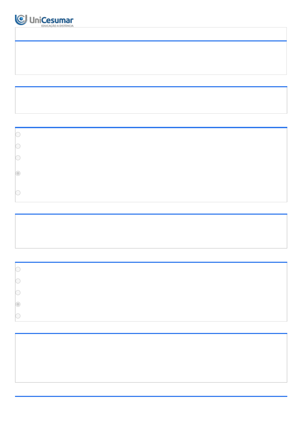 28/04/2021 Unicesumar - Ensino a Distância 1/5 ATIVIDADE 1 - MAT - FUNDAMENTOS HISTÓRICOS E FILOSÓFICOS DA EDUCAÇÃO - 2019B1 Período:06/05/2019 08:00 a 31/05/2019 23:59 (Horário de Brasília) Status:ENCERRADO Nota máxima:0,50 Gabarito:Gabarito será liberado no dia 01/06/2019 00:00 (Horário de Brasília) Nota obtida:0,50 1ª QUESTÃO As ideias inatas, que nascem com as pessoas, como defendia Descartes, são rebatidas por empiristas como John Locke. Locke defende que o conhecimento é adquirido pelas experiências e reflexões que adquirimos e realizamos ao longo da vida. Sobre o pensamento de Locke, assinale a alternativa correta. ALTERNATIVAS Para Locke, Deus é a única garantia de que o conhecimento racional possa ser firmado. O empirismo de Locke é uma vertente nascida do próprio racionalismo como tentativa de melhorá-lo. Todo conhecimento, apesar de estar ligado à experiência, na verdade, inicia-se com a racionalidade. Locke considerava que as pessoas nascem destituídas de qualquer ideia, como uma página em branco a ser preenchida. Locke vai ao encontro dos conceitos cartesianos ao dispor de elementos mecanicistas para inferir a possibilidade de conhecimento. 2ª QUESTÃO Sócrates consolida técnicas que visam distinguir a opinião da verdade (universal), por acreditar que a sabedoria torna os homens éticos, virtuosos e livres. Essas técnicas se reúnem em seu conhecido Método Socrático, composto pela Maiêutica e pela Ironia. A respeito das características deste método assinale a alternativa correta. ALTERNATIVAS Visa explicar a mudança das coisas no mundo, conjuntamente com suas essências que não mudam. Defende a existência de duas realidades, uma sensível e outra inteligível. É composto por quatro causas: material, eficiente, formal e final. Visa incitar a capacidade reflexiva e da dúvida nas pessoas. Visa incitar a capacidade inflexiva e da certeza nas pessoas. 3ª QUESTÃO A Immanuel Kant, considerado um dos maiores filósofos da modernidade, defendeu, em suas teorias, a importância do homem alcançar a autonomia do pensamento por meio da maioridade, o que significa a saída da menoridade. Assim, o filósofo pauta algumas empecilhos que dificultam a ascensão do homem enquanto sujeito autônomo, ou seja, liberto. Assinale correta quanto ao pensamento kantiano: ALTERNATIVAS 28/04/2021 Unicesumar - Ensino a Distância 2/5 Para Kant, os homens são presos às crenças por causa da sua zona de conforto, o que impede o desenvolvimento intelectual. Para Kant, a autonomia só é possível com a maioridade, ou seja, quando a pessoa obtiver 18 anos completos, poderá decidir por si próprio. Para Kant, os homens vêem, na razão, a única possibilidade de verdade. Por isso, negam todo e qualquer conhecimento advindo da experiência sensível. Para Kant, os homens estão absortos em paradigmas científicos e não se abrem a possibilidade de negar esses ideais para que a ciência possa evoluir. Kant defende que o homem está no mundo e que a verdade depende de uma análise do contexto histórico, cultural e socioeconômico na qual está inserido. 4ª QUESTÃO O período medieval estabelecido após a destruição do Império Romano caracterizou-se, dentre outros aspectos, pela emergência de uma estrutura de poder romana associada à Igreja Católica, a qual teve no Papa o representante desse poder relacionado à administração dos homens ocidentais. Sobre tal período, analise as afirmações a seguir considerando V para verdadeiras e F para as falsas. ( ) Os bárbaros, invasores do Império Romano, foram fortemente contrários à expansão da fé cristã e não cederam à propagação do cristianismo. ( ) As interpretações da Bíblia e o aprimoramento do pensamento religioso presente nesta obra foram difundidos por pensadores da época. ( ) Os indivíduos passaram a ter dois tipos de governantes: enquanto os imperadores administravam os corpos, o Papa cuidava das almas. A sequência correta é: ALTERNATIVAS V, V, F. V, F, F. V, F, V. F, F, V. F, V, V. 5ª QUESTÃO 28/04/2021 Unicesumar - Ensino a Distância 3/5 O Século XIX foi marcado pelos descobrimentos científicos, enquanto no século XX destacaram-se duas Guerras Mundiais. Por conta desses eventos, estabeleceu-se uma crise entre o pensamento filosófico e a ciência, bem como a Filosofia se distanciou da arte (AGUIAR; CASTELEIRA, 2018). AGUIAR, Gilson da Costa; CASTELEIRA, Rodrigo Pedro. Fundamentos Históricos e Filosóficos da Educação. Maringá-PR: UniCesumar, 2018. Sobre esse conteúdo, analise as afirmações a seguir: I - Durante e após as duas Guerras, a humanidade se fragmentou entre o avanço do conhecimento científico e o conceito de homem sobre si. II - A fragmentação do conhecimento faz com que, nos dias de hoje, a humanidade não seja capaz de desenvolver algum saber em um campo do conhecimento. III - Após a Guerra Fria, estabeleceu-se um equilíbrio entre as sociedades capitalistas e socialistas, sendo a China um exemplo desse fenômeno. IV – A Guerra Fria foi um dos resultados dos conflitos das duas Guerras Mundiais, caracterizado pelo confronto entre países expoentes do capitalismo e do socialismo. Estão corretas apenas as afirmações: ALTERNATIVAS I e II. I e IV. II e IV. II, III e IV. I, III e IV. 6ª QUESTÃO Galileu Galilei, nascido em 1564, foi considerado um dos fundadores do método experimental e da ciência moderna. Ele também foi estudante de medicina, mas acabou por se interessar por Astronomia e Matemática, as quais se dedicou pelo resto de sua vida. Em uma de suas mais famosas teses, reafirmou o pensamento de Nicolau Copérnico. Assinale a alternativa correta quanto ao conteúdo da tese de Galileu Galilei que remete ao pensamento copernicano: ALTERNATIVAS Os corpos celestes e o sol giram ao redor da Terra. A Terra é um corpo que gira em seu próprio eixo e os corpos celestes giram ao seu redor. A Terra é um corpo sem movimento, ao mesmo tempo em que os