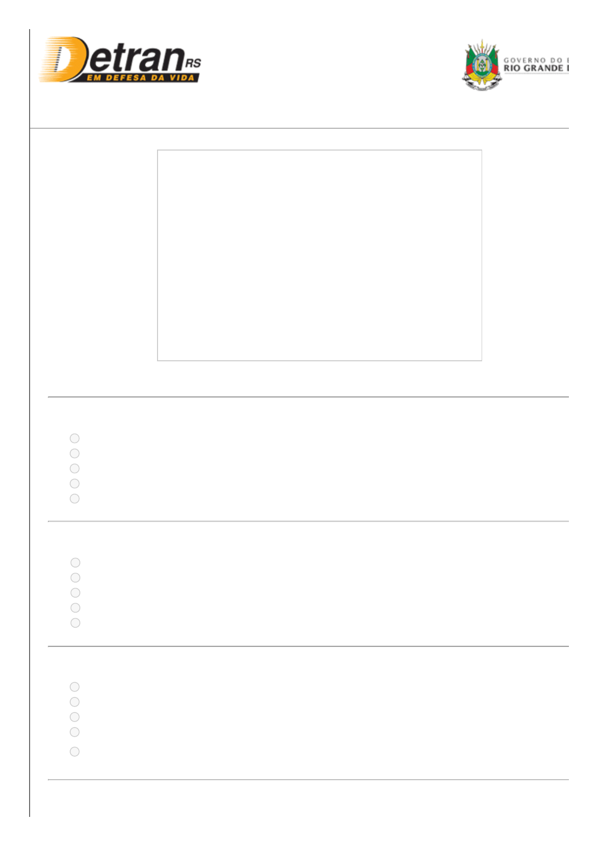 29/04/2021 Prova Simulada www.portaldetransito.rs.gov.br/dtw/simulado/prova_simulada_resultado.jsp?erro=false 1/6 Prova finalizada. Você foi REPROVADO, acertou 0 questões. Gabarito: 1-E 2-B 3-E 4-C 5-B 6-B 7-C 8-D 9-C 10-C 11-B 12-C 13-B 14-A 15-D 16-E 17-C 18-A 19-B 20-A 21-E 22-D 23-A 24-A 25-A 26-D 27-D 28-E 29-D 30-E Confira abaixo as suas respostas: 01) O aprendiz poderá conduzir veículo automotor A) sozinho, desde que porte o Certificado de Registro e Licenciamento de Veículo - CRLV. B) sozinho, desde que esteja portando a Licença de Aprendizagem de Direção Veicular - LADV. C) acompanhado de condutor habilitado na categoria "D". D) acompanhado de qualquer condutor habilitado. E) somente quando estiver acompanhado de instrutor autorizado. 02) Para habilitar-se na categoria "D", o candidato deverá ser: A) penalmente imputável, não importando sua idade. B) maior de 21 (vinte e um) anos. C) maior de 18 (dezoito) anos. D) menor de 21 (vinte e um) anos. E) menor de 18 (dezoito) anos. 03) Todo condutor deve A) ultrapassar outro veículo em movimento somente pela direita. B) parar o veículo em todos os cruzamentos. C) ultrapassar somente pela faixa da direita. D) realizar gestos com os braços sempre que for entrar à esquerda. E) apresentar, sempre que solicitado pela autoridade de trânsito ou seus agentes, os documentos dporte obrigatório exigidos por lei ou regulamentação. 04) A placa abaixo indica que adiante existe uma Exame Simulado 2 29/04/2021 Prova Simulada www.portaldetransito.rs.gov.br/dtw/simulado/prova_simulada_resultado.jsp?erro=false 2/6 A) finalização da bifurcação. B) obra. C) confluência de trânsito pela esquerda e o tráfego vai se incorporar à via na qual você está circul D) junção com a primeira via lateral na qual se forma um cruzamento. E) barreira à esquerda que desvia o tráfego para a direita. 05) Quando um condutor cometer duas infrações de trânsito ao mesmo tempo, será aplicada A) a penalidade de menor pontuação. B) a respectiva penalidade para cada infração, de maneira cumulativa. C) a penalidade referente à infração que foi vista em primeiro lugar pelo agente de trânsito. D) a penalidade de maior valor. E) a penalidade de maior pontuação. 06) É dever de todo condutor de veículo automotor: A) quando solicitado dar passagem pela direita. B) transitar em velocidade compatível com a segurança nos cruzamentos. C) realizar ultrapassagens somente pela direita. D) dirigir com um dos braços para fora nos dias quentes. E) ficar o mais próximo possível do veículo que está à frente numa rodovia. 07) O condutor, para ultrapassar outro veículo em movimento, deverá: A) buzinar e forçar a saída do veículo que estiver a sua frente para um dos lados da via. B) ligar a luz de emergência e fazer a ultrapassagem rapidamente. C) certificar-se de que dispõe de espaço suficiente e de que a visibilidade lhe permite fazê-la comsegurança. D) desligar os faróis do veículo para não ofuscar a visão do motorista que vai à frente. E) acelerar, chegar bem próximo do veículo à frente e efetuar a ultrapassagem. 08) Nas vias rurais sem sinalização regulamentadora, a velocidade máxima permitida para automóveis A) 70 km/h, quando em rodovia. B) 70 km/h, quando em estrada. C) 80 km/h, quando em rodovia. D) 60 km/h, quando em estrada. E) 100 km/h, quando em estrada. 09) A quem cabe a responsabilidade pelo pagamento de multas decorrentes de infrações na direção do veículos? A) Ao proprietário do veículo e ao condutor. B) Ao condutor. C) Ao proprietário do veículo. D) Aos pais ou responsáveis pelo condutor. À 29/04/2021 Prova Simulada www.portaldetransito.rs.gov.br/dtw/simulado/prova_simulada_resultado.jsp?erro=false 3/6 E) À pessoa que assumir a responsabilidade pela infração. 10) Qual atitude relacionada abaixo é considerada uma infração de trânsito? A) Obedecer aos sinais sonoros ou gestos do agente da autoridade de trânsito. B) Dirigir veículo de carga com habilitação na categoria E. C) Transitar com veículo em velocidade inferior à metade da velocidade máxima permitida para a v retardando ou obstruindo o trânsito, a menos que as condições de tráfego e meteorológicas não permitam, salvo se estiver na faixa da direita. D) Dar preferência de passagem aos veículos que vierem da direita em cruzamento de vias nãosinalizadas. E) Reduzir a velocidade do veículo de forma compatível com a segurança do trânsito. 11) É proibido o uso da buzina no perímetro urbano no horário compreendido entre A) 20 (vinte) horas e 7 (sete) horas. B) 22 (vinte e duas) horas e 6 (seis) horas. C) 8 (oito) horas e 18 (dezoito) horas. D) 18 (dezoito) horas e 22 (vinte e duas) horas. E) 18 (dezoito) horas e 6 (seis) horas. 12) Usar no veículo equipamento com som em volume ou frequência que não sejam autorizadas pelo CONTRAN A) não é poluição sonora e nem infração de trânsito. B) é um crime de trânsito. C) é uma infração de trânsito de natureza grave. D) é poluição sonora, mas não configura uma infração de trânsito. E) é uma norma de circulação e conduta. 13) São condutas prudentes de um condutor que dirige defensivamente: A) habilidade, conhecimento, descuido, previsão, ação. B) respeito, atenção, previsão, habilidade, conhecimento. C) previsão, ação, respeito, atenção, nervosismo. D) atenção, perícia, habilidade, conhecimento, imprudência. E) inteligência, paciência, atenção, imperícia, habilidade. 14) Em uma via onde existir dificuldade de deslocamento com rapidez devido a um engarrafamento loc condutor deverá A) manter-se calmo. B) mudar de faixa de rolamento. C) ler um livro ou jornal para se distrair. D) desligar o veículo. E) buzinar sem parar. 15) Choques com animais, mesmo de pequeno porte, sempre acarretam graves consequências aos motociclistas. É uma atitute que reduz o risco de incidência desse tipo de acidente: A) utilizar a buzina para assustar o animal.