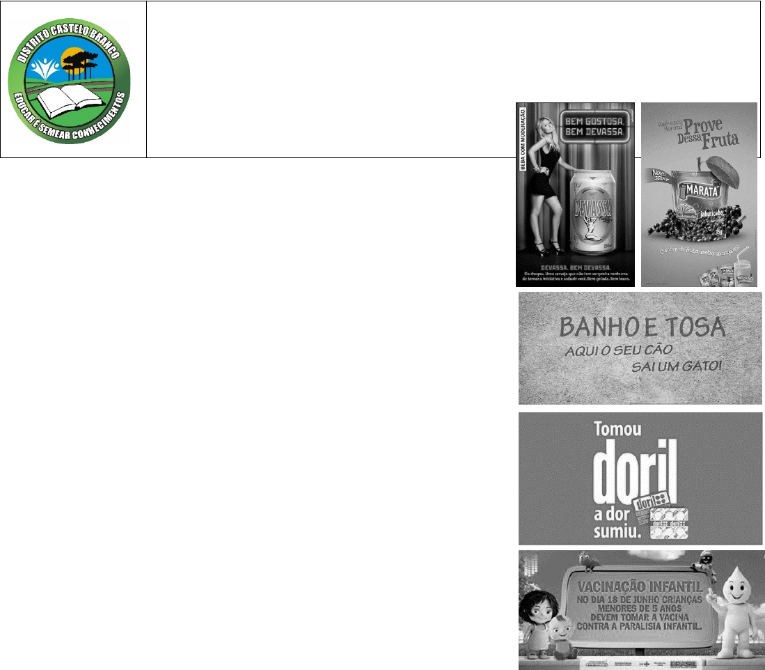 Atividade nº____ Escola: Municipal de Educação Infantil e Ensino Fundamental José Henrique de Araújo. Profesor(es): Pollyana Oliveira Aluno(a): _____________________________________________ Série(s)/Turma(s): ______________________________________ Área do conhecimento: Linguagens Data: ____/___/2020 Componente Currícular: Língua Portuguesa Objeto de Conhecimento: Gênero textual Anúncio Publicitário Objetivo de Aprendizagem: Conhecimento sobre o gênero e produção textual. ANÚNCIO PUBLICITÁRIO O anúncio publicitário (ou simplesmente publicidade) é um gênero textual que promove um produto ou uma ideia sendo veiculado pelos meios de comunicação de massa: jornais, revistas, televisão, rádio e internet. Podemos encontrá-los também em outdoors, panfletos, faixas ou cartazes na rua, no ônibus, no metrô, etc. A principal característica desses tipos de textos são precisamente o convencimento do consumidor para a compra de um produto ou serviço. Os publicitários, ou seja, aqueles que produzem os anúncios publicitários, utilizam diversas ferramentas discursivas, por exemplo, uso de imagens, de linguagem simples e humor. Note que esse tipo de texto tem como intuito chamar a atenção do consumidor e, portanto, são atrativos. São repletos de verbos no imperativo, o modo verbal que oferece ordem: Compre! Veja! Analise! De acordo com as funções da linguagem, os anúncios publicitários são textos que apresentam a função conativa ou apelativa, que por sua vez possuem o intuito de convencer os receptores da mensagem, ou seja, os consumidores. Podem ser textos verbais (palavras) e não verbais (uso de imagens), e ainda textos orais, por exemplo, aqueles veiculados pelo rádio. Características do Anúncio Publicitário As principais características do Anúncio Publicitário são: · Caráter comercial · Linguagem verbal e não verbal · Linguagem simples · Textos relativamente curtos · Textos persuasivos e atrativos · Humor, ironia e criatividade · Verbos no modo imperativo · Figuras e vícios de linguagem · Uso de cores, imagens, fotografias Atividade Faça um anúncio publicitário promovendo uma ideia ou um produto. Primeiramente, escolha a ideia ou o produto que você deseja divulgar e os objetivos que a envolvem: · Para que ela é importante? · Qual o público alvo envolvido? Quem compararia sua ideia ou produto? · Você usará imagens ou desenhos? Após respondida as perguntas, elabore um texto curto e criativo de acordo com os exemplos das imagens acima. Importante conhecer o público alvo, ou seja, se o anúncio é destinado ao público jovem pode apresentar uma linguagem mais despretensiosa, com uso de figuras de linguagem e gírias. No entanto, se o público alvo são os idosos, a linguagem deve ser mais cuidada e clara, destituídas de gírias que podem não atingir o público pretendido. Você pode fazer essa atividade em seu caderno ou no verso da folha. Bom trabalho!