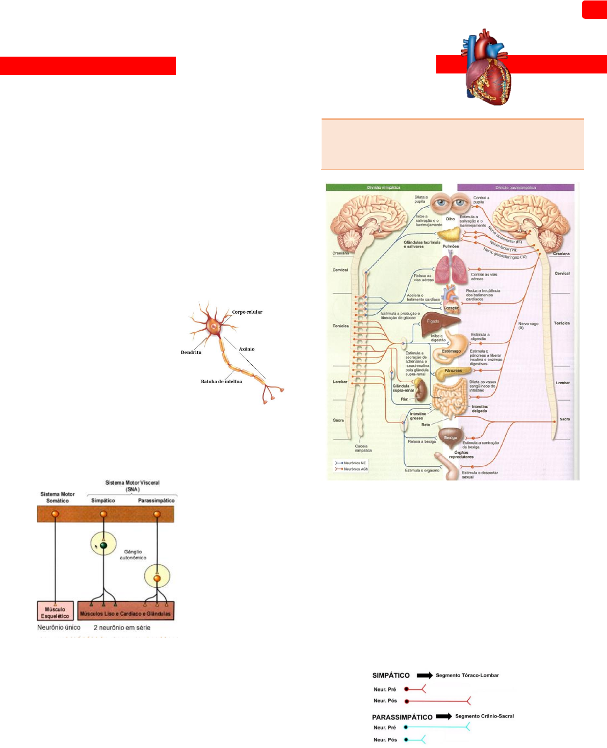 JASMINY MOREIRA | TURMA 5 BMF | 2020.2 1 Inervação do Coração Conceitos do Sistema Nervoso Autônomo - Possui fibras sensoriais e fibras motoras que conferem o controle das estruturas que não conseguimos controlar, são estruturas vitais e fundamentais para o funcionamento como: coração, respiração, glândulas. Esses sistemas serão controlados pelo sistema autônomo. - Esse sistema da todo o controle para que possamos viver em homeostase. - Pensando na respiração, de certa parte ‘’conseguimos controlar nossa respiração’’ mas ninguém consegue o ‘’suicídio’’ prendendo a respiração. Porque na hora que o organismo percebe que não tem o² suficiente, ele estimula o SNA e avisa para que está na hora de movimentar os músculos respiratórios e ai, você volta respirar mesmo que não queira. - O sistema nervoso somático conseguimos controlar. - O sistema nervoso autônomo não conseguimos controlar. - O autônomo será dividido em sistema nervoso simpático e parassimpático. O simpático eu tenho uma ação excitatória (vou aumentar, estimular mais a ação). O parassimpático vai diminuir/parar o simpático. - O sistema nervoso autônomo é constituído por 2 neurônios. Esses neurônios vão estar na região de encéfalo e medula espinal e o meu segundo neurônio é o que vai fazer sinapse na região de gânglio para poder chegar na região que eu quero estimular. - A diferença entre os sistemas é que o autônomo possui 2 neurônios e o somático apenas 1 neurônio. Sistema nervoso simpático: toracolombar/ neuronio partindo da região torácica e lombar. Sistema nervoso parassimpático: craniossacaral/ neuronio partindo da região o encéfalo para a região sacral. GANGLIOS - É um acúmulo de corpos celulares fora do meu sistema nervoso central. - No sistema nervoso autônomo o gânglio é onde acontece a sinapse. Sistema Nervoso Autônomo Parassimpático - No sistema parassimpático, as fibras pré- ganglionares normalmente seguem, sem interrupção, até o órgão que será controlado, fazendo então sinapse com os neurônios pós-ganglionares. Resumindo: Fibras pré-ganglionares bem grandes que seguem sem interrupções até chegar no perto do órgão para depois fazer sinapse chegar ao outro neurônio para controlar o coração. Então eu tenho o pré-ganglionar gigante sem interrupção e quando está próximo ao coração ele se depara com o outro gânglio para fazer sinapse e depois vem o neurônio pós-sináptico pequeno para fazer a contração. - Quando falamos do parassimpático, falamos da fibra que vai chegar até o órgão sem interrupção. Ele sai JASMINY MOREIRA | TURMA 5 BMF | 2020.2 2 do sistema nervoso central (região de encéfalo e sacral) e vai sem interrupção para o órgão. Quando chega perto do órgão, se depara com um gânglio simpático e terá a sinapse; eu tenho um neurônio menor para poder estimular aquele órgão. As nossas fibras parassimpáticas estarão relacionadas ao nervo vago (serão provenientes das fibras pré-ganglionares). Se ele é parassimpático: região encéfalo e região sacral. Os corpos celulares dos neurônios. Os gânglios do parassimpático estão grudados no órgão ou perto dos órgãos. (no coração: parede atrial, região do septo interventricular, próximos a duas estruturas: os nós sinoatrial e atrioventricular e na região das artérias coronárias). Esses gânglios partem do nervo vago (fibras pré-ganglionares dentro do sistema nervoso central) e as fibras pós- ganglionares estão localizadas nas regiões dos gânglios cardíacos. O sistema nervoso parassimpático terá alguns nervos/ramos específicos do nervo vago. São eles: ramo do nervo cardíaco cervical superior e inferior, ramo cardíaco torácico. Ou seja, 3 ramos parassimpáticos que são ramos do nervo vago. - Quando não enxergamos esses gânglios é o sistema nervoso parassimpático. – Gânglio perto do órgão. Ou seja, ambos têm gânglios, o que difere é a localização. - O sistema nervoso autônomo terá fibras parassimpáticas e simpáticas. O simpático aumenta o DC e o parassimpático diminui o DC. O simpático demanda muito O² e o parassimpático diminui e economiza a energia do órgão. Sistema Nervoso Autônomo Simpático - No sistema simpático logo depois que o nervo espinhal deixa o canal espinal, as fibras pré- ganglionares abandonam o nervo e passam para um dos gânglios da cadeia simpática, onde farão sinapse com um neurônio pós-ganglionar. Resumindo: Logo depois que ele sai da região do sistema nervoso central (medula espinal) ele deixa o canal e já se depara com um gânglio, eu tenho essa fibra pré-ganglionar pequena e a pós-ganglionar mais extensa. - Quando falamos do simpático, falamos que na hora que ele sai do sistema nervoso central (medula espinal região toracolombar) ele já se depara com a cadeia ganglionar. A fibra pré-ganglionar é pequena e depois eu tenho a pós-ganglionar bem grande para poder atingir aquele órgão para acontecer o estímulo. No caso tenho o coração, acelerando, excitando esse órgão para aumentar e ser realizada todas as funções dele. Quando falamos das fibras simpáticas. As fibras pré- ganglionares vão partir da região torácica (T5 ou T6). As fibras pós-ganglionares vão partir dos gânglios cervicais superior, médio e inferior (perto da região da medula espinal). Esses nervos da região simpática diferente da parassimpática eu tenho nervos próprios. Tenho o nervo cardíaco cervical superior, médio, inferior e o nervo cardíaco torácico. - Quando pensamos nos gânglios que estão longe do órgão (essas bolinhas) é o sistema nervoso simpático. – Gânglio longe do órgão. Ou seja, ambos têm gânglios, o que difere é a localização. - O sistema nervoso autônomo terá fibras parassimpáticas e simpáticas. O simpático aumenta o DC e o parassimpático diminui o DC. O simpático demanda muito O² e o parassimpático diminui e econ