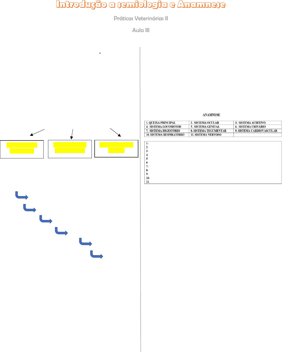 Conjunto de sinais. Ex: Febre Tudo Reconhecido pelo examinador Sensação sentida pelo paciente Práticas Veterinárias II Aula III Semiologia é o estudo dos sintomas/sinais. Conceitos: o Semiotécnica – Arte de examinar o paciente; o Propedêutica – Raciocínio e análise fundamental; o Semiogênese – Mecanismos do aparecimento dos sintomas. Sintoma X Sinal X Síndrome Etapas do exame clínico Resenha Anamnese Exame fÍsico Suspeita clínica Exames complem. Diagnostico Tratamento Resenha Nome/espécie/sexo(castrado)/raça/idade/peso Anamnese É a entrevista Tutor-clínico afim diagnosticar. Fatores importantes da anamnese • Metódica: Seguir sempre a mesma sequência lógica de perguntas.* • Relação com o tutor: Confiar na informação, trata-lo sem desconfiança (mesmo quando mereça) • Perguntas claras e abertas: Valorizar a perspectiva do cliente. *Não existe ordem certa de perguntas, existe a ordem do clínico. Estrutura - Queixa principal: Aquilo que o levou ao medico - Sistema(s) envolvidos(s): Queixa em que parte do corpo; - Sistema(s) correlatados(s): Queixa isolada? Pode interferir em outras partes? - Outros sistemas: Mais alguma queixa? - Histórico reprodutivo; - Manejo (dieta, vacinação e vermifugação, ectoparasitas) - Contactantes; - Antecedentes mórbidos/ familiares/ viagens; Jonatã Sampaio – Medicina Veterinária Queixa principal A QUEIXA PRINCIPAL é o primeiro passo, depois tem alguns tópicos sobre ela: o Período – Quando começou? o Teve evolução? Qual? o Existem outras queixas? o Usou algum medicamento? Algumas coisas a serem seguidas e observadas 1. Indentificação do animal; 2. Queixa principal; 3. Sistema digestório. - Apetite e deglutição: normorexia, hiporexia, polifagia, parorexia, disfagia. - Emese e regurgitação: início, quantidade, frequência, aspecto. - Defecação e fezes: normoquesia , disquesia , diarréia , hematoquesia/melena, início, aspecto, - Ingestão de água: normodipsia , polidipsia , oligodipsia , adipsia 4. Sistema cardio respiratório - Respiração: dispnéia , taquipnéia , bradipnéia - Tosse/Espirro: período, frequência, produtiva ou não. - Secreção nasal e/ou ocular: início, aspecto, quantidade. - Intolerância ao exercício: cansaço pós exercício, síncope, cianose. - Aumento de volume: edema de membros, ascite, vai para o litoral. 5. Sistema gênito urinário. - Micção: anúria, oligúria, poliúria, disúria, estrangúria, polaquiúria, biliuria, hematúria, incontinência. - Fêmeas: castrada, intervalo entre cios, cruzamentos, pseudociese, contraceptivos, corrimento, secreção, parto anterior, aborto. - Machos: libido, cruzamentos, castrado, agressividade, postura de micção 6. Sistema nervoso locomotor. - Convulsões ou alterações de comportamento: início, frequência, tipo, fatores iniciantes, caracterização de fases. - Postura e marcha: base ampla, dificuldade de locomoção, dor no movimento, ataxia, paresia, paralisia, dificuldade com obstáculos. - Possibilidade de intoxicação: banhos, injeção carrapaticida, dedetização, água de bateria. 7. Peles e anexos. - Pele: prurido, descamação, odores, lesões, localizações. - Orelha: prurido, secreção, odor, meneios cefálicos, normoacusia, acusia. - Unha: crescimento, queda, fratura. 8. Manejo. - Presença de ectoparasitas pulgas (puliciose), carrapatos ixodidiose - Ambiente domiciliado, semi domiciliado , acesso à rua, quintal, presença de roedores na região. - Dieta: ração, comida caseira, frequência, quantidade. - Banhos: produto, frequência. - Vacinação: quando, quais, onde (campanha, pet shop). - Contactantes: quais, estado geral. - Antecedentes mórbidos: quando,diagnósticos, resultados de exames complementares, resolução do quadro, tratamentos anteriores. Anamnese na vacinação Identificação/ resenha ●Anamnese básica: ○ Histórico e queixa atual ○ Atividades fisiológicas: alimentação, excreção, locomoção ○ Contactantes ○ Protocolos anteriores * Na prática clínica alguns termos devem ser incorporados na rotina do médico, por isso eles devem ser vistos e decorados. Abaixo segue alguns termos importantes e seus significados: