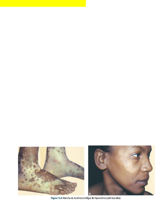 Lesões elementares Modificações do tegumento cutâneo causadas por processos inflamatórios, degenerativos, circulatórios, neoplásicos, transtornos do metabolismo ou por defeito de formação. Para a avaliação de lesões elementares, empregam-se a inspeção e apalpação. As lesões elementares classificam-se em: • Alterações de cor • Elevações edematosas • Formações sólidas • Coleções líquidas • Alterações da espessura • Perda e reparações teciduais. Alterações de cor (mancha ou mácula) A mancha ou mácula corresponde à área circunscrita de coloração diferente da pele normal, no mesmo plano do tegumento e sem alterações na superfície. As manchas ou máculas dividem -se em: pigmentares, vasculares, hemorrágicas e por deposição pigmentar. 1. Pigmentares São pigmentares quando decorrem de alterações do pigmento melânico. Subdividem-se em três tipos: • Hipocrômicas e/ ou acrômicas: resultam da diminuição e/ou ausência de melanina. Podem ser observadas no vitiligo, pitiríase alba, hanseníase; algumas vezes são congênitas, como no nevo acrômico e no albinismo. • Hipercrômicas: dependem do aumento de pigmento melânico. Exemplos: pelagra, melasma ou doasma, manchas hipercrômicas dos processos de cicatrização, manchas hipercrômicas da estase venosa crônica dos membros inferiores, nevos pigmentados, melanose senil. Os nevos são muito frequentes, têm aspecto variável e aparecem em qualquer idade. O nevo tuberoso ou "verruga mole" é uma pequena saliência roxa, geralmente pilosa, localizada, na maioria das vezes, no rosto. Efélides são as manchas de sarda. • Pigmentação externa: substâncias aplicadas topicamente que produzem manchas do cinza ao preto. Exemplos: alcatrões, antralina, nitrato de prata, permanganato de potassio. 2. Vasculares Decorrem de distúrbios da microcirculação da pele. São diferenciadas das manchas hemorrágicas por desaparecerem após digitopressão/puntipressão ou vitropressão. As manchas vasculares subdividem -se em: telangiectasias e manchas eritematosas ou hiperêmicas. a) Telangiectasias Dilatações dos vasos terminais, ou seja, arteríolas, vênulas e capilares. Ex: telangiectasias venocapilares e aranhas vasculares. b) Mancha eritematosa ou hiperêmica Decorre de vasodilatação, tem cor rósea ou tom vermelho-vivo e desaparece à digitopressão ou à vitropressão. É uma das lesões elementares mais encontradas na prática médica. 3. Hemorrágicas São também chamadas "sufusões hemorrágicas" e, como já foi mencionado, não desaparecem pela compressão, diferentemente dos eritemas. De acordo com a forma e o tamanho, subdividem-se em três tipos: a) Petéquias: quando puntiformes e com até 1 em de diâmetro b) Víbices: quando formam uma linha. Esse termo também é empregado para lesão atrófica linear. c) Equimoses: quando são em placas maiores que 1 em de diâmetro. 4. Deposição pigmentar Pode ser por deposição de hemossiderina, bilirrubina (icterícia), pigmento carotênico (ingestão exagerada de mamão, cenoura), corpos estranhos (tatuagem) e pigmentos metálicos (prata, bismuto). Elevações edematosas Elevações causadas por edema na derme ou hipoderme. Enquadra-se a lesão urticada ou tipo urticária, que correspende a formações sólidas, uniformes, de formato variável (arredondados, ovalares, irregulares), em geral eritematosas, e quase sempre pruriginosas, resultando de um edema dérmico circunscrito. A afecção mais frequentemente responsável por este tipo de lesão é a própria urticária. 1. Urtica: elevação efêmera, irregular, de tamanho e cor variável do branco-róseo ao vermelho pruriginosa, resulta do extravasamento de plasma com formação de edema dérmico. 2. Angioedema: área de edema circunscrito, que pode ocorrer no subcutâneo, causando tumefação. Formações sólidas Resultam de processo inflamatório ou neoplásico, atinge isoladamente ou conjuntamente epiderme, derme e hipoderme. 1. Pápula: lesão sólida, circunscrita, elevada e menor que 1 cm. 2. Placa: lesão elevada, de superfície geralmente plana, maior que 1 cm, pode apresentar superfície descamativa, crostosa ou queratinizada, pode ser formada pela confluência de pápulas. 3. Nódulo: lesão sólida, circunscrita, saliente ou não de 1 a 3 cm de tamanho. 4. Tubérculos: Elevações sólidas, circunscritas, de diâmetro maior que 1,0 cm, situadas na derme. A consistência pode ser mole ou firme. A pele circunjacente tem cor normal ou pode estar eritematosa, acastanhada ou amarelada (Figura 15.15); geralmente desenvolvem cicatriz. São observadas na sífilis, tuberculose, hanseníase, esporotricose, sarcoidose e tumores. 5. Nodosidade ou tumor: lesão sólida, circunscrita e maior que 3 cm, o termo tumor é utilizado preferencialmente para neoplasia. 6. Goma: nódulo ou nodosidade que se liquefaz na porção central, podendo ulcerar e eliminar material necrótico. 7. Vegetação: Lesão sólida e pedunculada, com aspecto de couve-flor e superfície friável. 8. Verrucosidade: Lesão sólida, elevada, de superfície dura e inelástica, formada por hiperqueratose. (tubérculo) Coleções Líquidas Lesões de conteúdo líquido que pode ser serosidade, sangue ou pus. 1. Vesícula: elevação circunscrita de até 1cm, com conteúdo claro (seroso) que pode se tornar turvo (purulento) ou rubro (hemorrágico). 2. Bolha ou Flictena: difere-se da vesícula apenas pelo tamanho, que é maior que 1cm. 3. Pústula: elevação de até 1cm e de conteúdo purulento. 4. Abscesso: possui tamanho variável, é formado por coleção purulenta da pele ou tecidos subjacentes. Sinais flogísticos podem estar presentes: edema, dor, rubor, calor. 5. Hematoma: formada por derrame de sangue na pele ou tecidos subjacentes, difere-se da equimose por haver alteração de espessura. Pode infectar e haver presença de sinais flogísticos, e o conteúdo hemorrágico pode tornar-se purulento. Alteraç