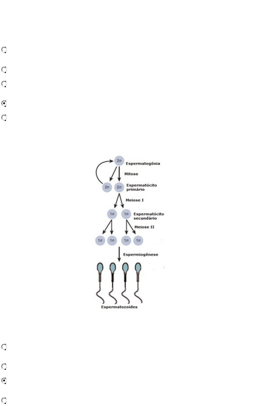 BIOLOGIA CELULAR E TECIDUAL 1 - Com organização semelhante à de uma amora, consiste em um conjunto de células produzidas, após a formação do zigoto, decorrentes de sucessivas divisões mitóticas. Trata-se da etapa inicial do desenvolvimento embrionário.” Disponível em <http://www.biologia.seed.pr.gov.br/modules/galeria/detalhe.php?foto=185&evento=2>. Acesso em 15 abr. 2019. A que estrutura do desenvolvimento embrionário o texto acima se refere? a. Blastocisto b. Zigoto c. Arquêntero d. Mórula e. Óvulo O processo de formação de gametas é uma etapa fundamental que precede a fertilização. Erros nesta etapa podem acarretar a não fecundação ou a formação de zigotos com cariótipos diferentes do esperado, caracterizando anomalias ou síndromesgenéticas.Observe, na imagem a seguir, um esquema resumido da espermogênese: Sobre este processo de formação de gametas, é correto afirmar que: a. Durante o processo de meiose não há modificação na quantidade de material genético celular, apenas aumento no número de células. b. Os espermatócitos secundários são formados a partir da divisão mitótica da espermatogônia. c. Os espermatozoides são diferenciados durante a espermiogênese, adquirindo sua forma característica para desempenho de sua função. d. Este processo de formação de gametas masculinos é exatamente igual ao processo de formação dos gametas femininos, exceto pela espermiogênese. e. A espermatogônia possui metade do material genético de uma célula somática, para que, ao se fundir ao óvulo, proporcione ao zigoto um cariótipo típico da espécie. 2 “A Inseminação Artificial (IA), também conhecida como Inseminação Intrauterina (IIU), consiste na colocação de uma amostra de esperma, preparada previamente no laboratório, no interior do útero materno a fim de aumentar o potencial de fecundação dos espermatozoides. Com este procedimento é possível sincronizar o melhor momento para o encontro dos gametas masculinos com o óvulo. Desta forma, tratamos de diminuir a distância que separa o óvulo e o espermatozoide para que o casal engravide.” Disponível em https://ivi.net.br/tratamentos-reproducao-assistida/inseminacao-artificial/. Acesso em 15 abr. 2019. De acordo com o exposto, podemos concluir que este tipo de inseminação favorece a ocorrência de qual etapa do desenvolvimento embriológico? a. blastogênese b. neurulação c. gastrulação d. nidação e. fecundação 3 O desenvolvimento embrionário vai até a oitava semana de gestação. A partir deste período, o embrião, praticamente já formado, dá origem ao feto e inicia-se, então, o período fetal que vai da nona semana até o nascimento. O período fetal é caracterizado: a. pela divisão mitótica sem crescimento no tamanho do embrião, apenas na quantidade de células que o forma. b. pela formação do arquêntero, que origina o tubo digestório primitivo. c. pela diferenciação celular a partir dos folhetos germinativos. d. pelo rápido crescimento e maturação de órgãos e tecidos. e. pelo desenvolvimento do tubo neural a partir da invaginação da placa neural.