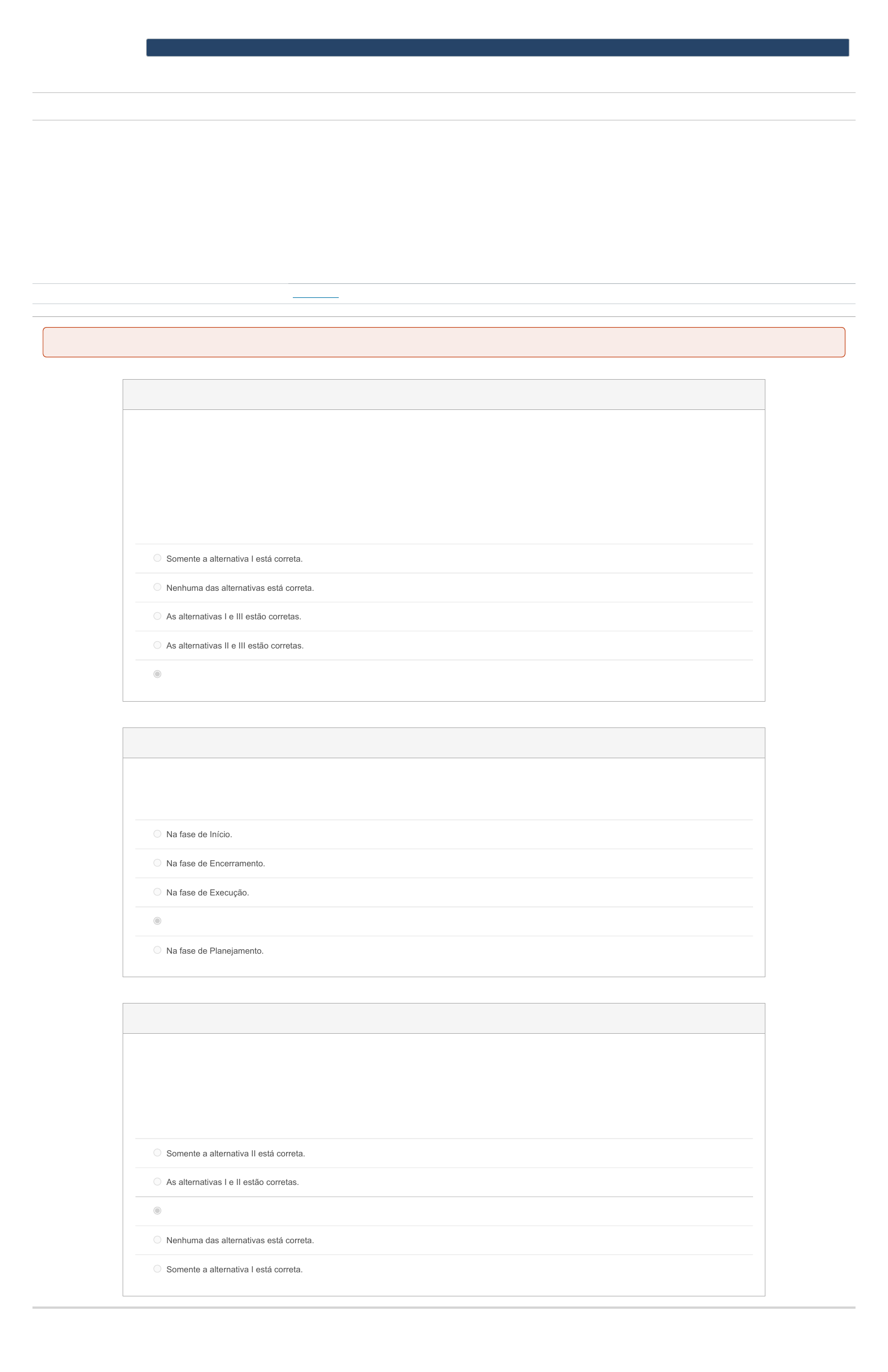 26/04/2021 Exame Final: Gestão de Projetos https://dombosco.instructure.com/courses/4180/quizzes/16312 1/3 Seu Progresso: 100 % Exame Final Entrega 1 mai em 23:59 Pontos 100 Perguntas 10 Disponível 26 abr em 0:00 - 1 mai em 23:59 6 dias Limite de tempo 60 Minutos Instruções Histórico de tentativas Tentativa Tempo Pontuação MAIS RECENTE Tentativa 1 18 minutos 90 de 100 As respostas corretas estarão disponíveis em 2 mai em 0:00. Enviado 26 abr em 0:23 Esta avaliação é composta por 10 (dez) questões objetivas com valor de 10 (dez) pontos cada questão, totalizando 100 (cem) pontos. Você tem 60 (sessenta) minutos para realizá-la. 10 / 10 ptsPergunta 1 Sobre a EAP (Estrutura Analítica de um Projeto), é correto afirmar que: I – Quanto melhor elaborada a EAP e a sequência de suas atividades, melhor será o desempenho de um projeto. II – Um erro muito comum em projetos é elaborar a EAP em um curto espaço de tempo muitas vezes inadequado, julgando-se que encurtar as atividades relacionadas ao planejamento economizam tempo em um projeto. III – Elaborar uma EAP bem estruturada com um gasto de tempo adequado para esta atividade, não ajudará a economizar tempo durante a realização de um projeto. Somente a alternativa I está correta. Nenhuma das alternativas está correta. As alternativas I e III estão corretas. As alternativas II e III estão corretas. As alternativas I e II estão corretas. 10 / 10 ptsPergunta 2 Em qual fase deve ocorrer o processo de monitoramento e controle de um projeto? Na fase de Início. Na fase de Encerramento. Na fase de Execução. Em todas as fases do projeto. Na fase de Planejamento. 10 / 10 ptsPergunta 3 Sobre o escopo do projeto é correto afirmar que: I – As informações coletadas com o cliente são de suma importância para elaboração do escopo de um projeto. II – Como um escopo é elaborado não influencia no desempenho de um projeto, pois o importante é apenas que seja elaborada a EAP. III – A EAP é uma ferramenta que pode ser utilizada para demonstrar e permitir a visualização do escopo de um projeto. Somente a alternativa II está correta. As alternativas I e II estão corretas. As alternativas I e III estão corretas. Nenhuma das alternativas está correta. Somente a alternativa I está correta. https://dombosco.instructure.com/courses/4180/quizzes/16312/history?version=1 26/04/2021 Exame Final: Gestão de Projetos https://dombosco.instructure.com/courses/4180/quizzes/16312 2/3 10 / 10 ptsPergunta 4 O Cronograma é uma ferramenta utilizada para delimitar as tarefas de um projeto dentro de um espaço de tempo, por meio do estabelecimento de prazos. Quais os principais elementos que deve conter um cronograma? Todas as alternativas estão corretas. Data de início das Tarefas. Prazo estimado para conclusão das tarefas programadas. Título ou nome da tarefa que deve ser executada. Nome dos responsáveis pelas tarefas. 10 / 10 ptsPergunta 5 EAP é a sigla da ferramenta de Gerenciamento de Projetos denominada de ... : MS Project. PMBOK. Estudo e Análise de Processos. Entradas, Ações e Processos. Estrutura Analítica de Projetos. 10 / 10 ptsPergunta 6 Assinale as alternativas que correspondem a processos de Gerenciamento do Tempo, realizados em um projeto: I – Definição das atividades e Estimativa de duração da atividade. II – Sequenciamento das atividades e Desenvolvimento do cronograma. III – Estimativa de recursos da atividade e Controle do cronograma. Nenhuma das alternativas está correta. As alternativas I, II e III estão corretas. As alternativas I e III estão corretas. Somente a alternativa I está correta. Somente a alternativa II está correta. 0 / 10 ptsPergunta 7IncorretaIncorreta Assinale as alternativas que correspondem à Ferramenta EAP (Estrutura Analítica do Projeto): Todas as alternativas estão corretas. A EAP permite aos gestores, o planejamento das atividades que serão executadas em um projeto. As atividades maiores ou tarefas situam-se nos níveis acima, e conforme o nível da ferramenta vai descendo, são definidos os desdobramentos destas atividades. Deve ser construída de cima para baixo, representando de maneira gráfica a hierarquia das atividades maiores e menores. As atividades sem desdobramentos ou fragmentações, são chamadas de pacotes de entrega. 10 / 10 ptsPergunta 8 Quando a qualidade percebida por um cliente é maior do que a sua expectativa, então a avaliação deste cliente normalmente será: 26/04/2021 Exame Final: Gestão de Projetos https://dombosco.instructure.com/courses/4180/quizzes/16312 3/3 Negativa em relação ao produto ou serviço. As alternativas I, II e III estão corretas. Neutra em relação ao produto ou serviço. Nenhuma das alternativas está correta. Positiva em relação ao produto ou serviço. 10 / 10 ptsPergunta 9 O que é kick off em um projeto? Nenhuma das alternativas está correta. Todas as alternativas estão corretas. É a reunião para iniciar um projeto e comunicar formalmente todas as partes interessadas. É a uma reunião para análise da causa raiz de um problema em um projeto. É uma reunião para coleta de informações que serão utilizadas na elaboração da EAP de um projeto. 10 / 10 ptsPergunta 10 Ferramenta utilizada para delimitar as tarefas de um projeto dentro de um espaço de tempo, por meio do estabelecimento de prazos. Estamos falando do: Briefing. Budget. Cronograma. Projeto. Prototipação.