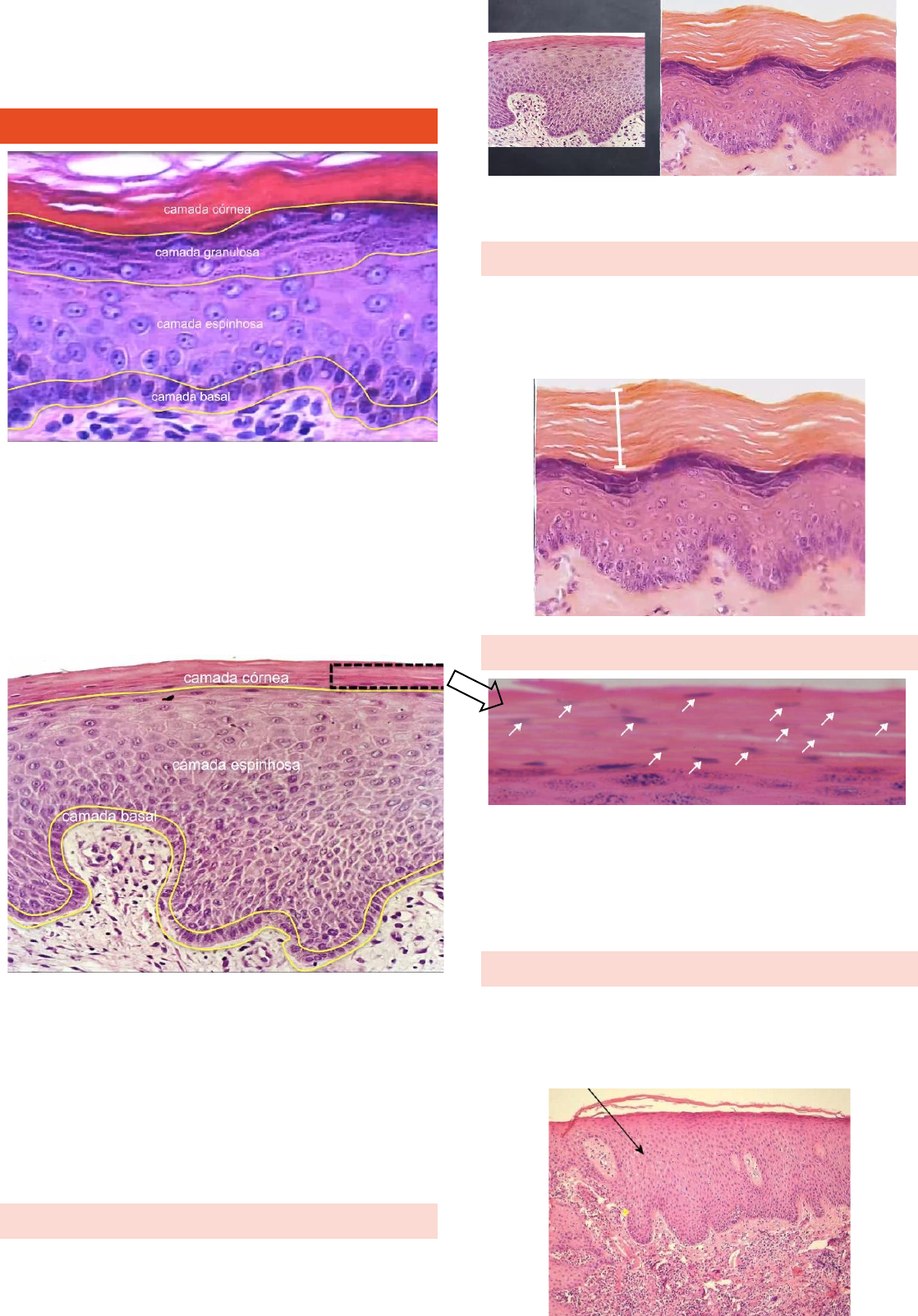 [Dermatopatologia] CONCEITOS PRÉVIOS O epitélio de revestimento da pele pode ter características variadas. Algumas camadas podem estar mais expressas em determinadas doenças. Sabemos que em articulações, palma da mão e planta dos pés temos uma constituição epitelial mais grossa, com camadas mais evidentes, enquanto em outras partes mais finas, as camadas serão mais delgadas, como a da foto. Camada Basal: camada única de células colunares basofílicas (é o local onde teremos formação de novas células que irão avançando nos diferentes estratos até constituir as lamelas córneas que serão despreendidas no dia-a-dia durante o processo de descamação) Nessa foto: não conseguimos observar a camada granulosa. HIPERGRANULOSE • Se refere a uma hiperplasia (manifestação maior) do estrato granuloso. Muitas vezes associadas a um atrito intenso na região Na primeira foto: não observamos a camada granulosa. Compare uma imagem com a outra. HIPERQUERATOSE • Espessamento do estrato córneo, produção excessiva de queratina • Várias doenças podem ocasionar hiperqueratose PARAQUERATOSE Aqui observamos que essa queratina apresenta núcleos. Quando a queratina apresenta núcleos, denomina-se paraqueratose. Essas células deveriam ter perdido suas organelas, porém elas estão mantendo suas estruturas nucleares evidentes. ACANTOSE • Perda das cristas epiteliais, devido a um crescimento exagerado da camada espinhosa • É um resultado da hiperplasia da camada espinhosa EXOCITOSE Em determinadas situações, as células inflamatórias saem dos vasos sanguíneos e se infiltram dentro do epitélio → essa saída das células inflamatórias, bem como seu ingresso no epitélio, nós denominamos de exocitose. Essas células podem ser tanto de polimorfonucleares como de mononucleares. ESPONGIOSE Podemos ter também o edema presente no epitélio, entre as células. Não é uma situação comum, mas a presença de edema entre as células epiteliais será denominada de espongiose. Essas células são unidas por junções celulares (desmossomos e hemidesmossomos); quando existe líquido entre elas, elas se afastam, porém não perdem sua adesão. Por isso na foto observamos de forma evidente as áreas mais claras, que são as regiões de junções celulares. TUMEFAÇÃO HIDRÓPICA É a presença de edema (líquido), no entanto é dentro das células epiteliais de revestimento (queratinócitos). Também pode ser chamada de alteração hidrópica. Precisa de algum tipo de alteração (como uma infecção viral por exemplo), que determina a perda da homeostase. DOENÇAS PAPULOESCAMOSAS PSORÍASE • Placa de coloração rósea a salmão, bem delimitada, coberta por escamas pouco aderentes e caracteristicamente de coloração branco-prateada • Acomete 1-2% da população Psoríase eruptiva (1ª imagem) e psoríase estável crônica (2ª imagem) PATOGÊNESE • Associada aos genes no interior do lócus de HLA • Mais especificamente: HLA-CW*0602 • Conduzida por linfócitos: ▪ CD4+ (Th1) ▪ CD4+ (Th17) ▪ CD8+ • Isso desencadeia uma grande quantidade de citocinas: IL-2, INF-gama, TNF e IL-17 • Isso gera um aumento do índice de proliferação epitelial (o normal é uma renovação em 25-30 dias, e em quem tem a doença, isso acontece em 7 dias) (1) Fenômeno de koebner (2) Sinal de Auspitz 1. Trauma na região que desencadeia as lesões 2. Também chamado de sinal do orvalho sangrante: surgimento de pontos hemorrágicos após remoção das escamas HISTOPATOLOGIA PSORÍASE CONSEGUIMOS OBSERVAR: • Paraqueratose • Acantose • Mitose • Epiderme suprapailar achatada (alongamento da papila dérmica, que faz com que a epiderme fique achatada) • Ectase vascular e edema Observamos também a presença de vasos sanguíneos, células inflamatórias que iniciarão o processo de exocitose e o acúmulo de INFILTRADO INFLAMATÓRIO (neutrófilos) na camada córnea → formando os MICROABSCESSOS DE MUNRO Imagem clássica de psoríase: conseguimos ver a acantose (muitas vezes as cristas tem forma de tubo de ensaio), vemos as papilas dérmicas mais alongadas (epiderme suprabasilar fica mais fina), observamos infiltrado inflamatório nas papilas, que podem subir e determinar os microabscessos de Munro. Além disso observamos paraqueratose e diminuição da camada granulosa, que pode até estar ausente. PSORÍASE PUSTULOSA: o que muda histologicamente? Aqui temos uma pústula neutrofílica perto da camada córnea, com inúmeros neutrófilos dentro. As outras características se mantêm RESUMINDO A HISTOPATOLOGIA DA PSORÍASE • Acantose • Espessamento do estrato córneo (paraqueratose) • Alongamento regular descendente das cristas interpapilares • Figuras de mitose • Estrato granuloso delgado ou ausente • Agregados de neutrófilos (microabscessos de Munro e pústulas espongiformes). • Infiltrado inflamatório inespecífico • Alterações vasculares na derme DERMATITE SEBORREICA • Envolve regiões com alta densidade de glândulas sebáceas: couro cabeludo, na fronte (glabela), canal auditivo externo, área retroauricular, sulco nasogeniano, área pré-esternal • Acomete 5% da população • Pode acontecer tanto no adulto quando no lactente PATOGENIA • Acontece mais em homens do que em mulheres • Patogenia desconhecida • Associa-se a doença de Parkinson • Facilita a colonização de certas espécies de fungos do gênero malassezia • Representa uma das dermatoses mais comum em pacientes com AIDS • A caspa é a expressão clínica mais comum da dermatite seborreica no couro cabeludo. • É facilmente confundida com psoríase HISTOPATOLOGIA DA DERMATITE SEBORRÉICA • Paraqueratose: pode estra alternada com áreas de hiperqueratose • Exocitose de neutrófilos • Espongiose (edema entre as cél. Epiteliais) – quando tem espongiose, podem estar presentes alguns linfócitos (não tem que ser necessariamente neutrófilos) PITIRÍASE RUBRA PILAR • Doença 