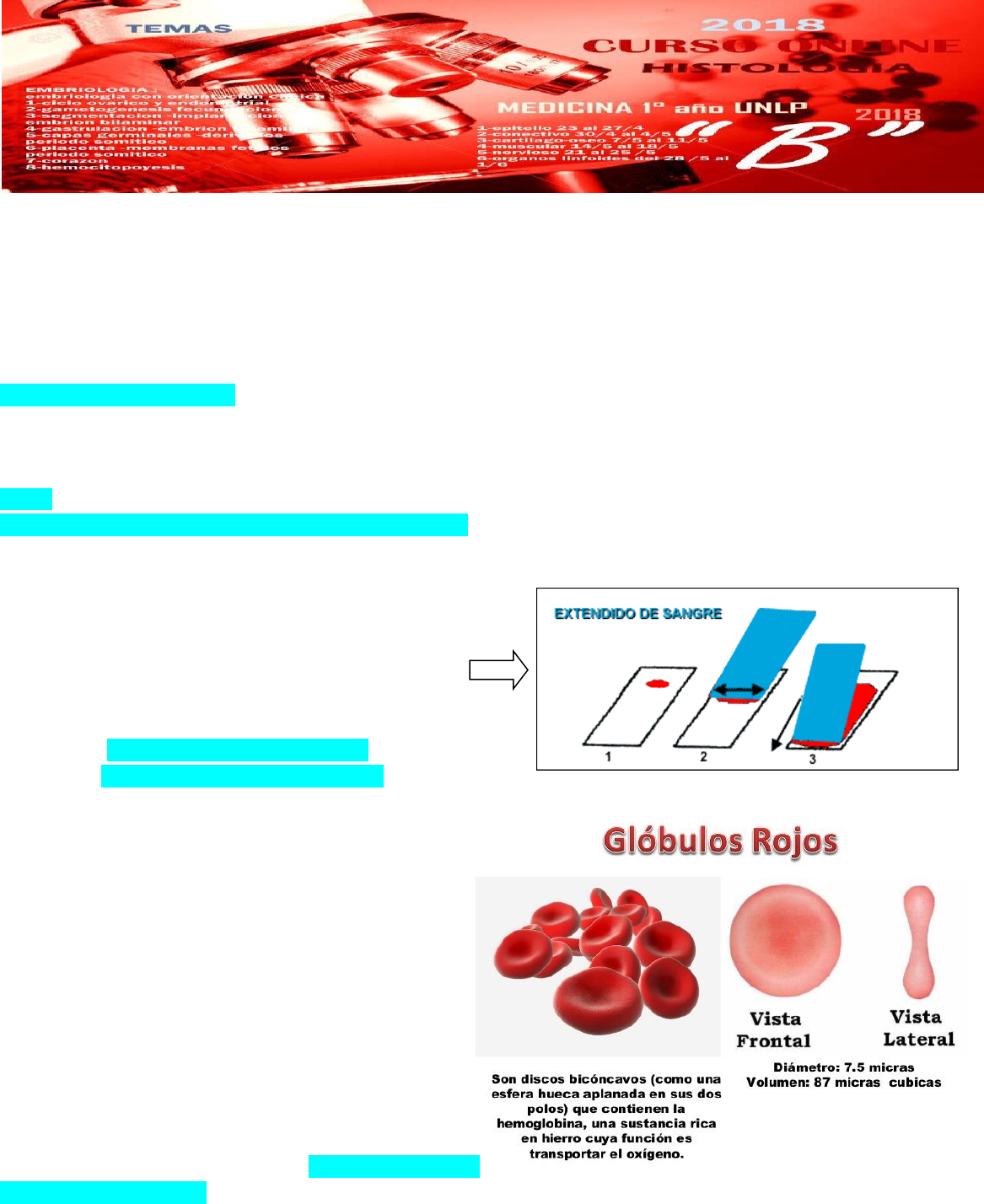 HISTOLOGIA I : SANGRE ACTUALIZACION : 2018 SANGRE Y CIRCULATORIO Es un tejido conectivo fluido especializado que circula por capilares , venas y arterias . Su color rojo es característico por el pigmento hemoglobínico contenido en los eritrocitos . Tiene una fase solida constituida por los elementos formes : globulos rojos , globulos blancos y plaquetas y una fase liquida constituida por plasma. La cantidad de sangre en el organismo es de 5 litros. COMPOSICIÓN DE LA SANGRE : pregunta de examen Plasma = 55 a 60 % ( de los cuales la mayor parte es agua 90% y un 10% es sustancia organica ( fibrinógeno y protrombina , albuminas , hidratos de carbono , lípidos , nitrógeno residual) . La parte inorgánica la representan : Na , Cl , K , Mg , Ca , Fe , Cu Elementos figurados = 40 % a 45 % ( eritrocitos , leucocitos y plaquetas o trombocitos) SUERO : es la parte de sangre SIN los factores de coagulación ( sin fibrinógeno) a diferencia del plasma que tiene los factores. PREPARACION DE MUESTRAS SE SANGRE PARA MICROSCOPIA : Se realiza por el método llamado extendido o frotis : se coloca una gota De sangre en un portaobjeto y se extiende con otro portaobjeto en una película muy delgada primero hacia atrás Y luego hacia adelante y se tiñe con GIEMSA LO PREGUNTAN EN EL EXAMEN : es asi ERITROCITOS : ( GLOBULOS ROJOS ) Valor normal mujer: 4.000.000 a 4.800.000 x ml Hombre : 4.500.000 a 5.000.000 x ml Cuando no circulan tienden a agruparse en pilas de monedas Carecen de nucleo y organelas. Su citoplasma esta ocupado Por hemoglobina ( transporta oxigeno a los tejidos) Se forman en la medula osea y viven 120 dias Tienen forma biconvava . Miden 7,5 Mm ( micrómetros) Funcion : transportar oxigeno y liberarlos a los tejidos y recoger dióxido de carbono de los tejidos Tras 120 dias son extraidos de la sangre y destruidos por los macrófagos del bazo. Cuando no circulan se disponen en pilas de monedas Se componen de hemoblogina ( formada por una proteína Llamada globina y una parte no proteica grupo HEM rico en Hierro. El hierro debe permanecer en forma ferrosa o reducida Ya que en forma ferrica u oxidada forma metahemoglobina que NO TRANSPORTA OXIGENO CICLO VITAL DE LOS ERITROCITOS : se forman a partir de una celula madre unipotente que va sufriendo diferenciaciones : primero se diferencia a proeritroblasto luego a eritroblasto basofilo luego a eritroblasto policromatofilo , luego a eritroblasto ortocromático ( con nucleo) y finalmente elimina el nucleo y forma un eritrocito. PREGUNTA DE EXAMEN : eritrocito fantasma : se produce cuando colocamos al eritrocito en una solución hipotónica . Que quiere decir esto que lo colocamos en una solución que tenga menos concetración de sales que el propio eritrocito ( por ejemplo agua destilada) por un fenómeno de osmosis el eritrocito capta el agua para diluir el exceso de sales que presenta entonces la membrana del eritrocito se estira , se hace permeable y pierde la hemoglobina que le da color. Al quedar incoloro se lo llama celula fantasma. ( para entender bien esto deben saber lo que es Osmosis : es el pasaje de una solución menos concetrada hacia la solución mas concetrada a través de una membrana semipermeable para igualar las concetraciones de ambos lados de la membrana) HEMATOCRITO : Es el volumen que ocupan los globulos rojos en un volumen dado de plasma hecha incoagulable en un tubo de wintrobe graduado en porcentaje de 0 a 100. Se obtiene por centrifugación de sangre hecha incoagulable. Los eritrocitos se depositan en el fondo del tubo por su densidad, Por encima se deposita una banda de leucocitos y por encima otra de plasma . VALORES : Varon 47% Mujer 42% Una variación puede indicar un aumento o disminución del numero o tamaño de los eritrocitos o en la cantidad de plasma. PLAQUETAS : Son fragmentos citoplasmáticos de células gigantes llamadas megacariocitos . Son anucleados . tamaño = 3 micrometros Valor normal : 150.000 a 300.000 por ml. La vida media es de 9 dias Son pequeños trozos pegajosos de material celular Muy importante en la hemostasia ( detención de perdida de sangre de un vaso). Salen de la medula osea para circular por el torrente sanguíneo y cuando se activan producen unas saliencias puntiagudas y sus bordes se hacen rugosos. Su función entonces es hemostática : formar el tapon Plaquetario cuando un vaso sanguíneo pierde sangre. LEUCOCITOS : O GLOBULOS BLANCOS : Son una parte importante del sistema inmune . Se desplazan por movimientos ameboides . La función es proteger al organismo de infecciones producidas por germenes . Ejercen su función en los tejidos a donde son transportados desde la sangre. Se forman en la medula osea. Intervienen en la defensa humoral y celular del organismo La vida media es de 14 hs . El valor normal es de 7.000 por ml -GRANULOCITOS O POLIMORFONUCLEARES: Son los neutrofilos , esosinofilos y basofilos -AGRANULOCITOS O MONONUCLEARES: macrófagos , linfocitos , monocitos y células plasmaticas -NEUTROFILOS : Son los mas numerosos Formula leucocitaria relativa : 65% hay en sangre Formula leucocitaria absoluta : 4450 por ml de sangre Su nucleo consta de un nucleo segmentado en 2 a 5 lobulos Estos lobulos están unidos por puente de cromatina . los neutrofilos inmaduros sin lobulacion del nucleo se Llaman NEUTROFILOS EN CAYADO Su citoplasma presenta granulos 1º inespecíficos o azurofilos que contienen Mieloperoxidasa, lactoferrina , lizosima ( en granulos azurofilos) Y tiene tambien granulos específicos o sendundarios con Lactoferrina , lizosima , fosfatasa alcalina y colagenasa. Funcion : defensa y fagocitosis ( emiten seudópodos) Vida media 8 dias . Diametro 12 a 15 Mm EOSINOFILO : Formula leucocitaria relativa : 1 a 3 % Formula leucocitaria absoluta : 140 por ml Su citoplasma se tiñe de rojo de ahí su nombre Posee granulos y un nucleo bilobulado Miden 12 a 15 Mm y su funcion es : intervenir En procesos alérgicos y parasitarios BASOFILOS : Se piensa que son estadios inmaduros d