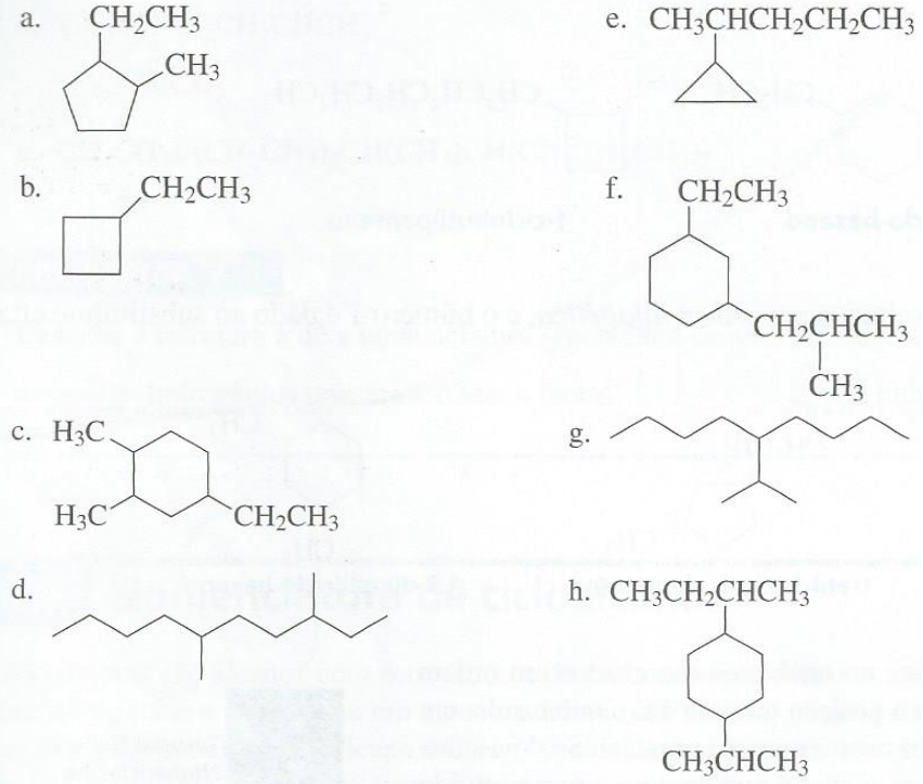 CCBS/UEPB Química Orgânica 2º Lista de Exercícios 1) Converta as estruturas condensadas abaixo em fórmulas de linha de ligação: a) CH3CH2CH2CH2CH2CH2OH c) CH3CH(CH3)CH2CH2CH(Br)CH3 b) CH3CH2CH(CH3)CH2CH(CH3)CH2CH3 d) CH3CH2CH2CH2OCH3 2) Dê o nome sistemático para os seguintes compostos: 3) Represente as fórmulas estruturais para os seguintes compostos: a) 2,3-dimetilbutano d) 5-sec-butil-3-etil-4,5-dimetilnonano b) 1-etil-3-metilcicloexano e) 3,3-dietil-4-metil-5-propiloctano c) isopropilciclopentano f ) 5-(2,2-dimetilpropil)undecano 4) Desenhe a estrutura e dê o nome sistemático dos compostos isoméricos com a fórmula molecular C6H14 . 5) Quantos haletos de alquila podem ser obtidos da monocloração do pentano, cicloexano e 2-metil-pentano. 6) Mostre as etapas de iniciação, propagação e terminação para a monocloração do cicloexano. 7) Represente as projeções de Newman para dois confôrmeros do propano, indicando qual deles é o mais estável. 8) Represente as fórmulas estruturais para os compostos abaixo: a) cis-1-cloro-2-metilciclopentano b) trans-1,3-dimetilcicloexano Aluna: MARIA LORENNA PESSOA FONSÊCA RESPOSTAS DA LISTA 2 - QUÍMICA ORGÂNICA
