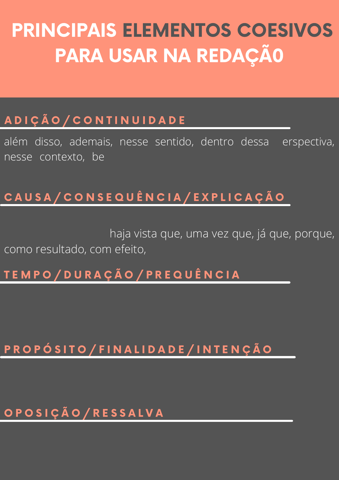 PRINCIPAIS ELEMENTOS COESIVOS PARA USAR NA REDAÇÃ0 P R O P Ó S I T O / F I N A L I D A D E / I N T E N Ç Ã O além disso, ademais, nesse sentido, dentro dessa perspectiva, nesse contexto, bem como, assim, ainda, dessa forma, dessa maneira, desse modo... C A U S A / C O N S E Q U Ê N C I A / E X P L I C A Ç Ã O T E M P O / D U R A Ç Ã O / P R E Q U Ê N C I A A D I Ç Ã O / C O N T I N U I D A D E por isso, por causa disso, por conseguinte, por consequência, consequentemente, haja vista que, uma vez que, já que, porque, como resultado, com efeito, em virtude de... atualmente, hoje, na atualidade, no contexto atual, na conjuntura atual, enfim, logo, em seguida, frequentemente, eventualmente, posteriormente, hodiernamente... com o fito, com o fim de, a fim de que, com o propósito de, para que, com o intuto de, com a finalidade de... O P O S I Ç Ã O / R E S S A L V A contudo, porém, mas, entretanto, todavia, no entanto, embora, apesar de, ainda que, ao passo que... Joyce Almeida França
