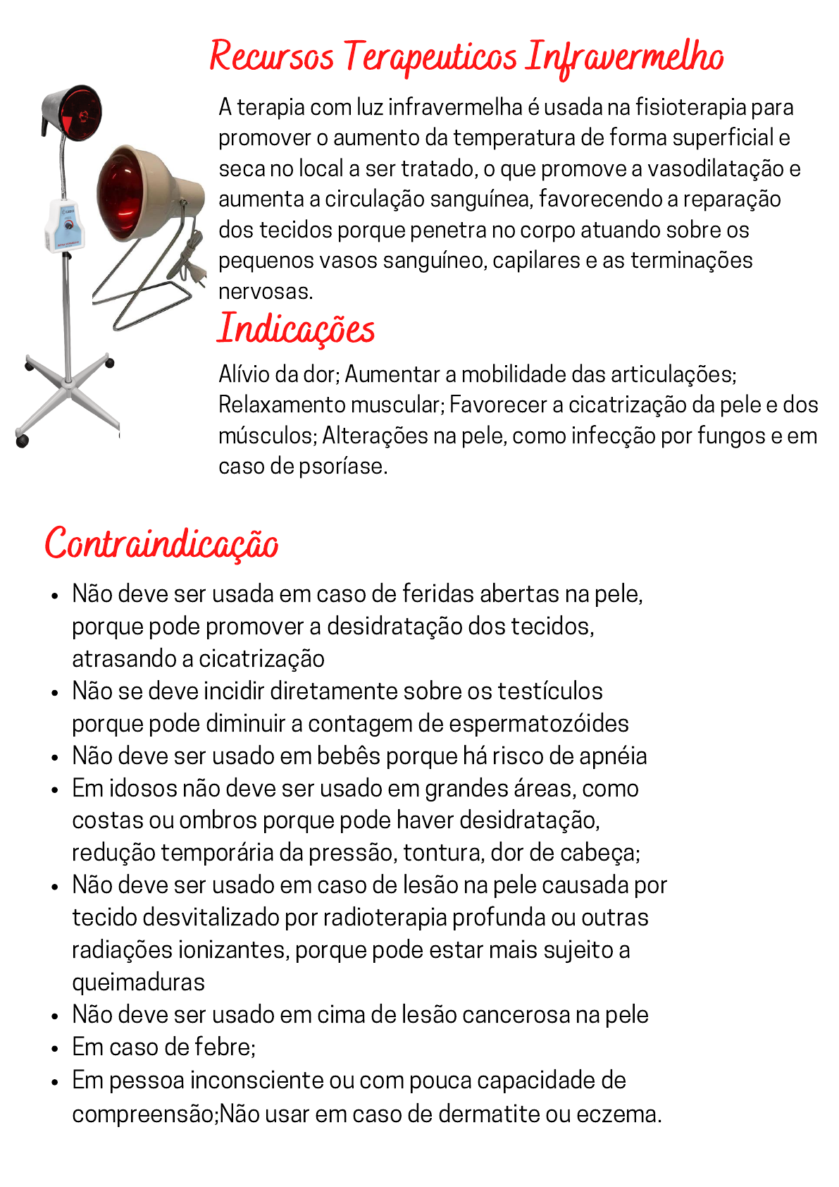 Não deve ser usada em caso de feridas abertas na pele, porque pode promover a desidratação dos tecidos, atrasando a cicatrização Não se deve incidir diretamente sobre os testículos porque pode diminuir a contagem de espermatozóides Não deve ser usado em bebês porque há risco de apnéia Em idosos não deve ser usado em grandes áreas, como costas ou ombros porque pode haver desidratação, redução temporária da pressão, tontura, dor de cabeça; Não deve ser usado em caso de lesão na pele causada por tecido desvitalizado por radioterapia profunda ou outras radiações ionizantes, porque pode estar mais sujeito a queimaduras Não deve ser usado em cima de lesão cancerosa na pele Em caso de febre; Em pessoa inconsciente ou com pouca capacidade de compreensão;Não usar em caso de dermatite ou eczema. Recursos Terapeuticos Infravermelho A terapia com luz infravermelha é usada na fisioterapia para promover o aumento da temperatura de forma superficial e seca no local a ser tratado, o que promove a vasodilatação e aumenta a circulação sanguínea, favorecendo a reparação dos tecidos porque penetra no corpo atuando sobre os pequenos vasos sanguíneo, capilares e as terminações nervosas. Indicações Alívio da dor; Aumentar a mobilidade das articulações; Relaxamento muscular; Favorecer a cicatrização da pele e dos músculos; Alterações na pele, como infecção por fungos e em caso de psoríase. Contraindicação Oque é um infravermelho? É um calor superficial São ondas eletromagnéticas cuja longitude de onda está entre 4.000 e 7.700 Aº. São emitidos por qualquer corpo aquecido e, quanto maior a temperatura do corpo emissor, menor o comprimento de onda. São ondas emitidas através de irradiação, ou seja, são emitidas somente quando encontram um meio onde acontece produção de calor. Em qual fase realizamos a aplicação? Apenas na fase Crônica e nunca na fase aguda. Não luminoso: Produz calor baseado no efeito Joule (toda vez que a eletricidade passa por um mau condutor, haverá liberação de calor). Produz aquecimento do corpo, com liberação de raios IV não visuais; demora mais tempo para aquecer, de 10 a 15 minutos. Ex: Forno de Backer luminoso: Produzido por lâmpadas de filamento de Tungstênio. O interior da lâmpada deverá ser espelhado para que seja aproveitada a reflexão interna e para que esta seja potencializada e liberada, sob a forma de calor. Escolha do aparelho: Fase aguda → Não luminoso (menos irritante e mais sedante) Fase crônica → Luminoso (mais irritante, maior ação e melhor aceitação) Tecnicas de aplicação Distancia 45 a 50 cm Perpendicular - 90° 20 a 30 minutos área em tratamento diretamente exposta a radiação. Efeitos Fisiológicos: Vasodilatação Aumento do fluxo sanguineo, levando também a aumento de sudorese Hiperemia Aumento do metabolismo Miorelaxante Analgesia Redução de edema. Efeitos Terapeuticos: Diminuição da dor Relaxamento msucular Aumento da irregação sanguinea Eliminação de produtos residuais Preparo do Paciente: Região desnuda Verificar sensibilidade para poder indicar a temperatura Motricidade: ação vasodilatadora e constrição diminuída Posição do paciente agradável, não mais se alterando durante o tratamento Sentir sensação agradável de calor Não tocar na lâmpada Tecnicas de tratamento: Início → Distância maior Depois → Diminuir a distância Extremidades abertas Fechar depois Se a sudorese for intensa → Secar o paciente Se a sudorese for deficiente → Hidratar o paciente Cuidados: Não usar toalhas ou roupas na região Proteger os olhos do paciente com algodão e tecido escuro Proteger a região occipital, em aplicações cervicais Secar as regiões com sudorese intensa Hidratar o paciente durante a aplicação Limpar a pele antes do tratamento Manter uma distância de 60 a 120 cm Manter uma angulação de 90� (lei do Coseno) Proteger os cabelos para evitar ressecamento