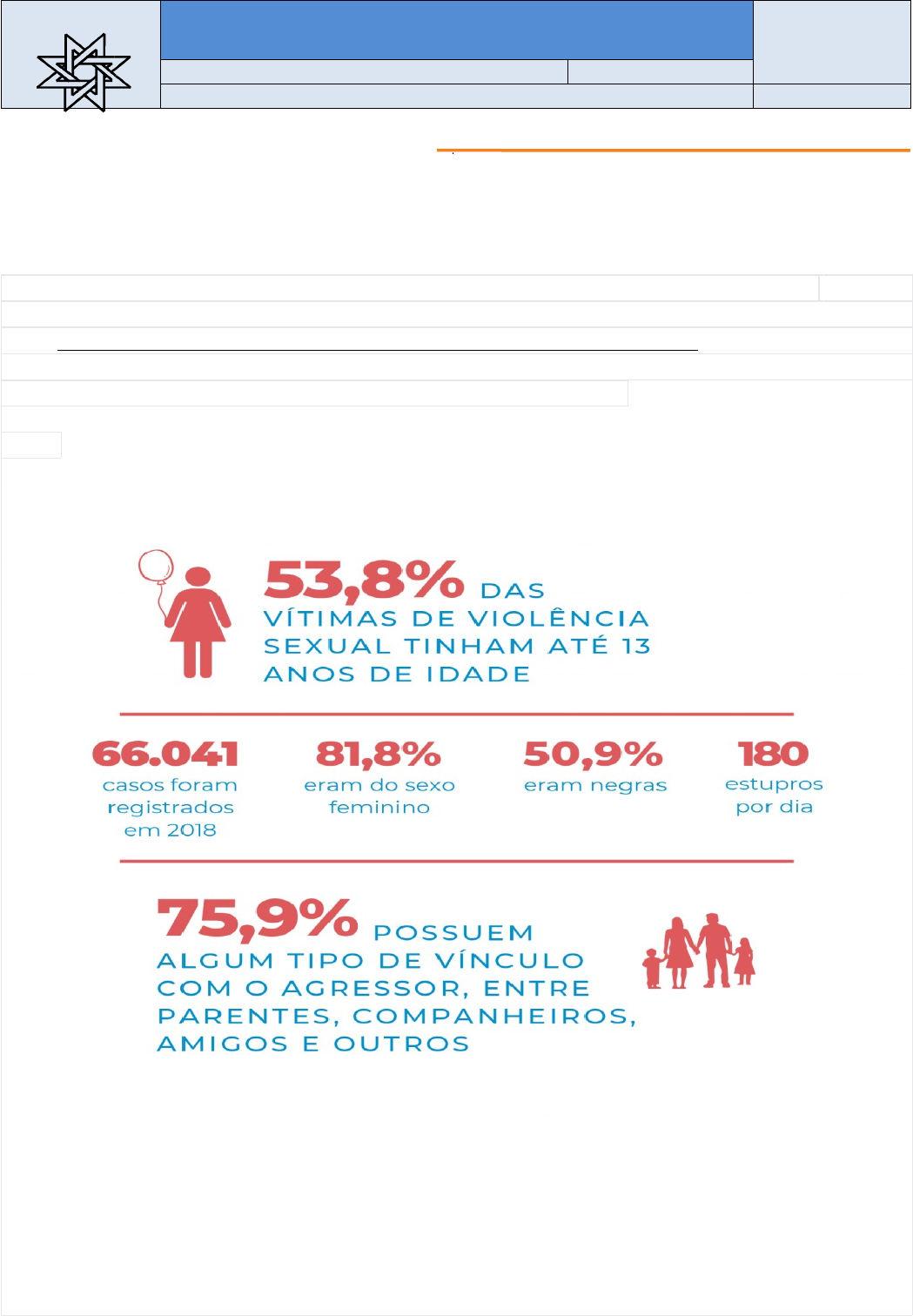 Colégio Impacto REDAÇÃO 004 PROFESSORA: France Cristina S. Camargo DATA: 15/04/2021 ALUNO: ENSINO MÉDIO EIXO TEMÁTICO :Prevenção e Enfrentamento da Violência Contra Crianças e Adolescentes TEXTOS MOTIVADORES A partir do material de apoio e com base nos conhecimentos construídos ao longo de sua formação, redija um texto dissertativo-argumentativo, em norma padrão da língua portuguesa, sobre o tema: “Caminhos para o enfrentamento ao abuso sexual infantil no Brasil”. Apresente proposta de intervenção social que respeite os direitos humanos. Selecione, organize e relacione, de maneira coerente e coesa, argumentos e fatos para defesa de seu ponto de vista. Texto I https://www.ufrgs.br/humanista/wp-content/uploads/2019/10/Box-Juliana-1024x1002.png Texto II Texto III O Brasil é o país onde existe a maior quantidade de crianças entre 10 e 15 anos ligadas à exploração sexual infantil. A Unicef (Fundo das Nações Unidas para a Infância) fala entre 250 a 500 mil, enquanto as fontes menos otimistas dizem que o número pode chegar a 2 milhões. A exploração sexual infantil talvez seja a pior forma de degradação de uma criança. Mais triste ainda é saber que, além dos aliciadores, as crianças muitas vezes são levadas a essa condição por quem teria a obrigação de protegê-las: seus próprios pais. (...) Embora a legislação seja pesada, ela não inibe a criminalidade, pois, sem efetividade por conta da ausência de fiscalização, nosso país é um dos mais atrativos ao turismo sexual voltado à criança e ao adolescente. (...). https://jus.com.br/artigos/36941/nao-e-prostituicao-infantil-e-exploracao-sexual-da-crianca Texto IV Constituição da República Art. 227: É dever da família, da sociedade e do Estado assegurar à criança e ao adolescente, com absoluta prioridade, o direito à vida, à saúde, à alimentação, à educação, ao lazer, à profissionalização, à cultura, à dignidade, ao respeito, à liberdade e à convivência familiar e comunitária, além de colocá-los a salvo de toda forma de negligência, discriminação, exploração, violência, crueldade e opressão. (...). Parágrafo 4.º: A lei punirá severamente o abuso, a violência e a exploração sexual da criança e do adolescente. Texto V Existe uma série de fatores que podem favorecer esse tipo de violência, além da condição de pobreza. Entre eles, encontramos questões de gênero, étnicas, culturais, além da erotização do corpo da criança e do adolescente pela mídia, do consumo de drogas, das disfunções familiares e da baixa escolaridade. Contudo, devemos lembrar que, ao contrário do que muitos ainda podem pensar, a violência sexual acontece em todos os meios e classes sociais. (...) A violência sexual prejudica profundamente o desenvolvimento psicossocial de crianças e adolescentes, gerando problemas como estresse, depressão, baixa autoestima e maior tendência ao suicídio. http://www.childhood.org.br/release/orientacoes-de-comunicacao-sobre-violencia-sexual-contra-criancas-e-adolescentes-2 Texto VI