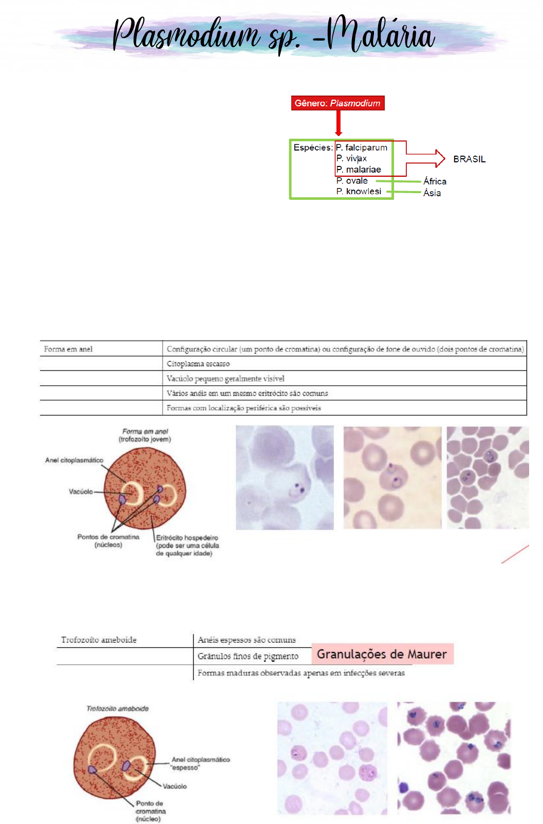 Agente etiológico Plasmodiumsp Hospedeiro intermediário (Vertebrado) Homem Hospedeiro Definitivo (Invertebrado –Vetor) Mosquito fêmea do gênero Anopheles O P. malariaeocorre apenas em 1% dos casos no Brasil Trofozoítos jovens(P.falciparum) (imaturos-Estágio de anel) Trofozoítos maduros(P.falciparum) (Ameboídes–Raros em sangue periférico) Esquizontes(P.falciparum) (raros no sangue periférico) Gametócitos–Microgametócitos(P.falciparum) (Masculino) Gametócitos-Macrogametócitos(P.falciparum) (Feminino) Trofozoítosimaturos(P.vivax) (jovens-Estágio de anel) Trofozoítos maduros(P.vivax) (Trofozoíto ameboide) Esquizontes(P.vivax) (rarosnosangueperiférico) Gametócitos-Microgametócitos(P.vivax) (Masculino) Gametócitos-Macrogametócitos(P.vivax) (Feminino) TRANSMISSÃO Através da picada do mosquito fêmea do gênero Anopheles, parasitado com esporozoíto sem suas glândulas salivares, que inocula essas formas infectantes durante o repasto sanguíneo. Nas infecções por P.vivax e P.ovale, alguns parasitos se desenvolvem rapidamente, enquanto outros ficam em estado de latência no hepatócito. São, por isso, denominados hipnozoítos. DIAGNÓSTICO Reação de cadeia de Polimerase -PCR Gota espessa Visualização com microscopia ótica do parasito em sangue, por meio da coloração de Giemsa e azul de metileno. Testes de imunocromatografia de malária