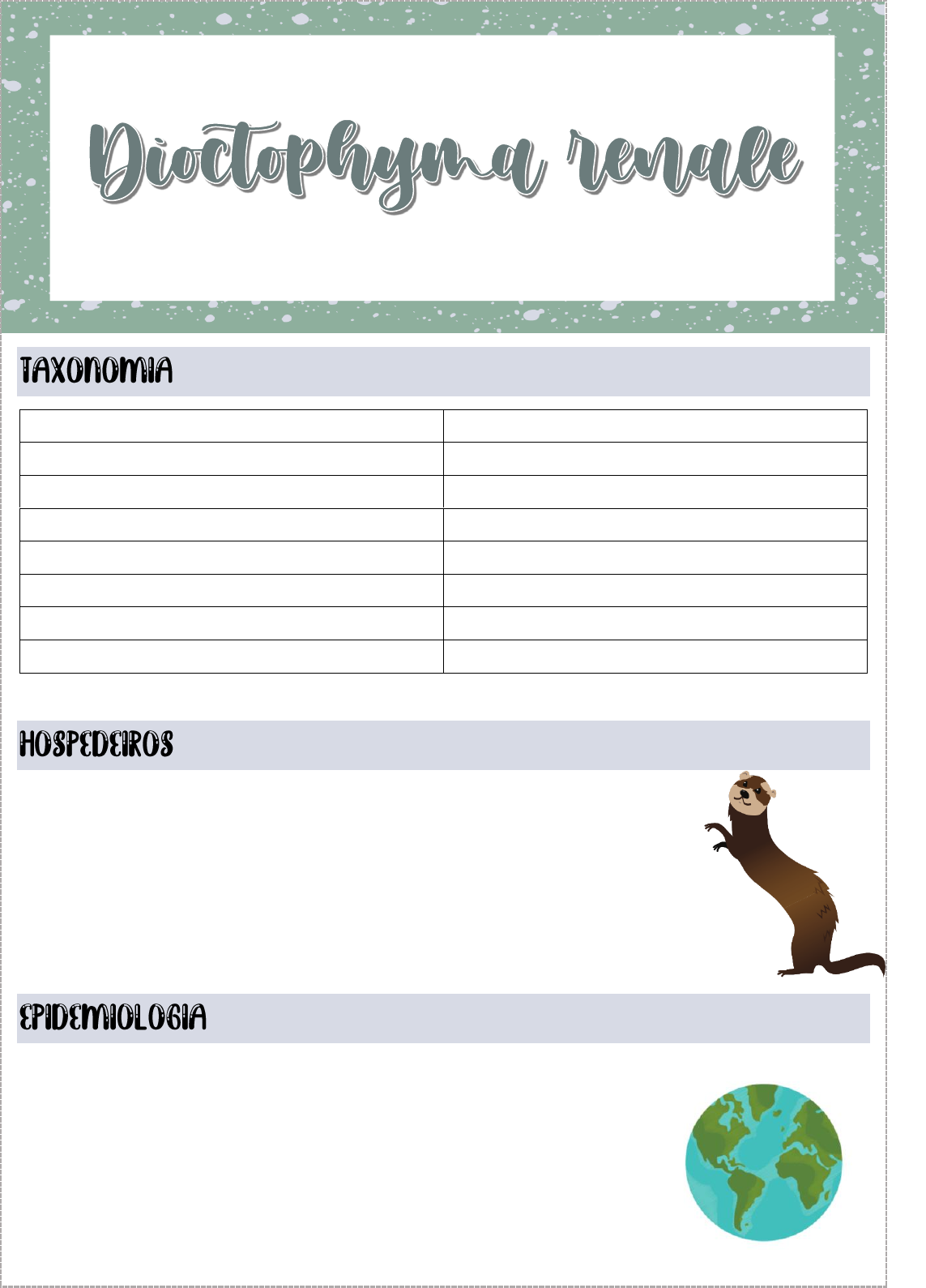 REINO Animalia FILO Nemathelminthes CLASSE Nematoda ORDEM Strongylida SUPERFAMÍLIA Dioctophymatoidea FAMÍLIA Dioctophymatidae GÊNERO Dioctophyma ESPÉCIE ✓ Dioctophyma renale Definitivos – cães, raposas, furões, doninhas, focas e lontras Ocasionais – gatos, suínos, equinos, bovinos e humanos Intermediários – oligoquetas aquáticas (anelídeos) Local de parasitismo – rins e cavidade abdominal • É um parasita de regiões temperadas de clima frios • Existentes na América do Norte, América do Sul e Ásia • Acomete cães de rua com hábito alimentares pouco seletivos @veterinariando_ → São conhecidos como o parasita gigante do rim → Podem atingir até 100cm de comprimento → O órgão parasitado costuma ser totalmente destruído o Possuem a coloração vermelho-sangue o Presença de boca pequena e simples, sem lábios, formato hexagonal e presença de 6 papilas em círculo o Possuem formato elíptico o Sua coloração é castanha o Sua casca é espessa e enrugada o Podem atingir até 45cm de comprimento por 4 a 6mm de largura o Sua extremidade posterior possui bolsa copuladora com espiculo único o Podem atingir até 100cm de comprimento por 12mm de largura o Seu órgão sexual é simples na extremidade causal obtusa • Ciclo heteroxênico (indireto) • Hospedeiro intermediário: anelídeos oligoquetas • Hospedeiro paratênico: anfíbios (sapos e rãs) e peixes de água doce • Período pré-patente: média de 155 dias (sobrevive de 3 a 5 anos no hospedeiro definitivo) 1. São eliminados através da urina os ovos não embrionados em ambiente aquático 2. Esse ambiente precisa estar em condições ideias de temperatura (14 a 20ºC) para que se dê início ao desenvolvimento da L1 3. O hospedeiro intermediário irá ingerir esse ovo com a larva L1 4. Esse ovo irá eclodir no trato digestivo do anelídeo, migrando para o vaso sanguíneo ventral fazendo muda para L2 e posteriormente muda para L3 – esse processo de muda pode durar de 2 a 4 meses e a temperatura é muito importante (20 a 30ºC) 5. Esse anelídeo oligoqueta pode ser ingerido pelos hospedeiros paratênicos (peixes e anfíbios) – nesses animais não ocorrerá desenvolvimento do parasito, eles permaneceram encistados na musculatura abdominal 6. A anelídeo oligoqueta pode ser ingerida diretamente pelo hospedeiro definitivo – esse anelídeo contendo a L3 7. No hospedeiro definitivo a L3 migra pela parede gástrica para o fígado, onde muda para L4 (45 dias) 8. A larva chega à forma adulto no rim num período de 6 meses 9. O parasita adulto normalmente se localiza no rim direito, devido a proximidade do rim direito ao duodeno e pela migração da L3 10. A localização final do parasito adulto vai depender do local onde a L3 vai penetrar Parede gástrica na curvatura menor – larva pode se desenvolver nos lóbulos do fígado Parede gástrica na curvatura maior – larva pode se desenvolver no rim esquerdo Parede duodenal – larva pode se desenvolver no rim direito • É o único verme capaz de parasitar, em especial, o rim • Penetra pela cápsula renal e no final da infecção destrói o rim • Normalmente apenas um rim é afetado (rim direito) • Por haver migração do parasito pelo rim, pode ocorrer hepatite mecânica persistente • Há destruição do parênquima renal – cápsula renal com aparência de saco estirado com vermes • Raro: ocorrência de vermes encapsulados ou livre na cavidade abdominal e no tecido conjuntivo subcutâneo o Em grande parte dos casos a infecção por esse parasita é assintomática o Quando há, podem ocorrer: disúria, hematúria, dor na lombar ao final da micção o Pode ocorrer hipertrofia de um dos rins, uma vez que a infecção é unilateral o rim sadio compensa a falta do destruído o A destruição do parênquima renal causará insuficiência renal, podendo levar o animal a óbito o Na cavidade abdominal pode causar uma peritonite crônica o Pode ser observado apatia, tristeza, emagrecimento e arqueamento do dorso, aumento de volume palpável na região renal e às vezes, andar vacilante, emagrecimento progressivo, aborto e prostração o Ovos na bexiga podem propiciar a agregação de urólitos (cálculos urinários), capaz de desencadear sinais clínicos característicos de doença obstrutiva do trato urinário inferior o Humanos – dor lombar, cólica renal e hematúria Parasitológico de urina – identificação dos ovos ou de vermes jovens ocasionalmente liberados pela urina Ultrassonografia abdominal – observação das estruturas nos rins, localizar as regiões com presença do parasita e estimar a quantidade de parasitas no órgão Necropsia – identificação de vermes adultos Exames complementares – tomografia (mais usada em humanos), urografia excretora (raio-X contrastado), hemograma que acusa processo inflamatório Laparotomia exploratória – sem fins diagnósticos → Não existe opção farmacológica que seja eficaz no tratamento → Mesmo que houvesse medicamentos, a excreção seria muito dificultada pelo tamanho e espessura → O que ocorre na maioria das vezes é a nefrectomia, consiste na remoção do rim afetada pelo verme → Eliminação de peixe cru, rãs e sapos crus ou insuficientemente cozidos da dieta dos cães → Esse verme acomete mais cães de rua, por conta dos hábitos alimentares pouco seletivos, mas pode ocorrer também em cães de fazenda