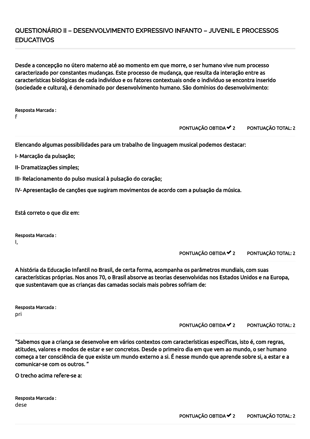20/08/2020 Course Status – Centro Universitário Faveni https://ava.unifaveni.com.br/course-status/ 1/3 QUESTIONÁRIO II – DESENVOLVIMENTO EXPRESSIVO INFANTO – JUVENIL E PROCESSOS EDUCATIVOS PONTUAÇÃO TOTAL: 2PONTUAÇÃO OBTIDA 2 Desde a concepção no útero materno até ao momento em que morre, o ser humano vive num processo caracterizado por constantes mudanças. Este processo de mudança, que resulta da interação entre as características biológicas de cada indivíduo e os fatores contextuais onde o indivíduo se encontra inserido (sociedade e cultura), é denominado por desenvolvimento humano. São domínios do desenvolvimento: Resposta Marcada : físico-motor, cognitivo e psicossocial. PONTUAÇÃO TOTAL: 2PONTUAÇÃO OBTIDA 2 Elencando algumas possibilidades para um trabalho de linguagem musical podemos destacar: I- Marcação da pulsação; II- Dramatizações simples; III- Relacionamento do pulso musical à pulsação do coração; IV- Apresentação de canções que sugiram movimentos de acordo com a pulsação da música. Está correto o que diz em: Resposta Marcada : I, II, III e IV estão corretas. PONTUAÇÃO TOTAL: 2PONTUAÇÃO OBTIDA 2 A história da Educação Infantil no Brasil, de certa forma, acompanha os parâmetros mundiais, com suas características próprias. Nos anos 70, o Brasil absorve as teorias desenvolvidas nos Estados Unidos e na Europa, que sustentavam que as crianças das camadas sociais mais pobres sofriam de: Resposta Marcada : privação cultural PONTUAÇÃO TOTAL: 2PONTUAÇÃO OBTIDA 2 “Sabemos que a criança se desenvolve em vários contextos com características especí�cas, isto é, com regras, atitudes, valores e modos de estar e ser concretos. Desde o primeiro dia em que vem ao mundo, o ser humano começa a ter consciência de que existe um mundo externo a si. É nesse mundo que aprende sobre si, a estar e a comunicar-se com os outros. ” O trecho acima refere-se a: Resposta Marcada : desenvolvimento psicossocial 20/08/2020 Course Status – Centro Universitário Faveni https://ava.unifaveni.com.br/course-status/ 2/3 PONTUAÇÃO TOTAL: 2PONTUAÇÃO OBTIDA 2 Leia as proposições a seguir, relacionando-as: A imaginação participa da constituição dos processos funcionais ou processos expressivos, Ou seja, Nasce com o sujeito e desenvolve-se durante a vida. (Não nasce com o sujeito) Resposta Marcada : as duas alternativas são falsas. PONTUAÇÃO TOTAL: 2PONTUAÇÃO OBTIDA 2 Os Referenciais Curriculares Nacionais para a Educação Infantil, volume 3 – Conhecimento de mundo que apresenta o eixo música, destaca que linguagem musical tem estrutura e características próprias, devendo ser considerada como: Resposta Marcada : produção, apreciação e re�exão. PONTUAÇÃO TOTAL: 2PONTUAÇÃO OBTIDA 2 Portugal (2009) defende que o período da infância e as primeiras experiências de vida do ser humano enquanto criança determinam aquilo que o ser humano será enquanto adulto, pois é nesse período que o sujeito aprende sobre si, sobre os outros e sobre o mundo. Neste sentido, o conhecimento da criança nesta etapa da sua vida torna-se essencial para os pro�ssionais de educação que com ela desenvolvem uma: Resposta Marcada : ação educativa PONTUAÇÃO TOTAL: 2PONTUAÇÃO OBTIDA 2 A partir de sua epistemologia genética é possível identi�car quatro estágios de evolução mental na criança. Em cada estágio, o pensamento e o comportamento infantil se caracterizam por uma forma especí�ca de conhecimento e raciocínio. Esses estágios são: (Pag.50) (V) pré-operatório; (V) operatório concreto; (V) sensório-motor; (V) operatório formal. Resposta Marcada : V; V; V; V. 20/08/2020 Course Status – Centro Universitário Faveni https://ava.unifaveni.com.br/course-status/ 3/3 20 / 20 PONTUAÇÃO TOTAL: 2PONTUAÇÃO OBTIDA 2 O fazer pedagógico no contexto da educação infantil na contemporaneidade deve ser criativo, �exível, atendendo às individualidades sem perder de vista o coletivo. Pensar sobre isto implica reinventar cotidianamente o fazer pedagógico, para que neles se deem as interações do sujeito com o mundo físico e social, oportunizando-lhe construir/desconstuir/reconstruir os conhecimentos necessários à sua condição de cidadão. Assumindo essa perspectiva, o educador infantil precisa: I- Compreender a Instituição de Educação Infantil como espaço individual; (COLETIVO) II- Assumir que tem um papel fundamental no processo de inserção e acolhimento das crianças e de suas famílias na instituição; III- Respeitar e valorizar os direitos e as necessidades das crianças em relação à educação e aos cuidados próprios desta faixa etária; IV- Organizar o trabalho com as crianças de acordo com suas especi�cidades e necessidades. Está correto o que diz em: Resposta Marcada : II, III e IV. PONTUAÇÃO TOTAL: 2PONTUAÇÃO OBTIDA 2 Através das brincadeiras, as crianças passam a conhecer suas próprias limitações e a relação recíproca que existe entre os outros, compreende o meio social, suas diferenças e seus comportamentos. Conhecem e identi�cam objetos em um contexto, isto é, fazem o uso cultural, visando o desenvolvimento da linguagem e da narrativa, para trabalhar com o imaginário. O ato de brincar leva a criança à socialização e a interação e a se relacionar de maneira coerente no meio social, com outras pessoas que estão ao seu meio, como os brinquedos e consigo mesmo. São objetivos da ludicidade, EXCETO: Resposta Marcada : tornar a sala de aula um ambiente de anulação de conhecimentos Total