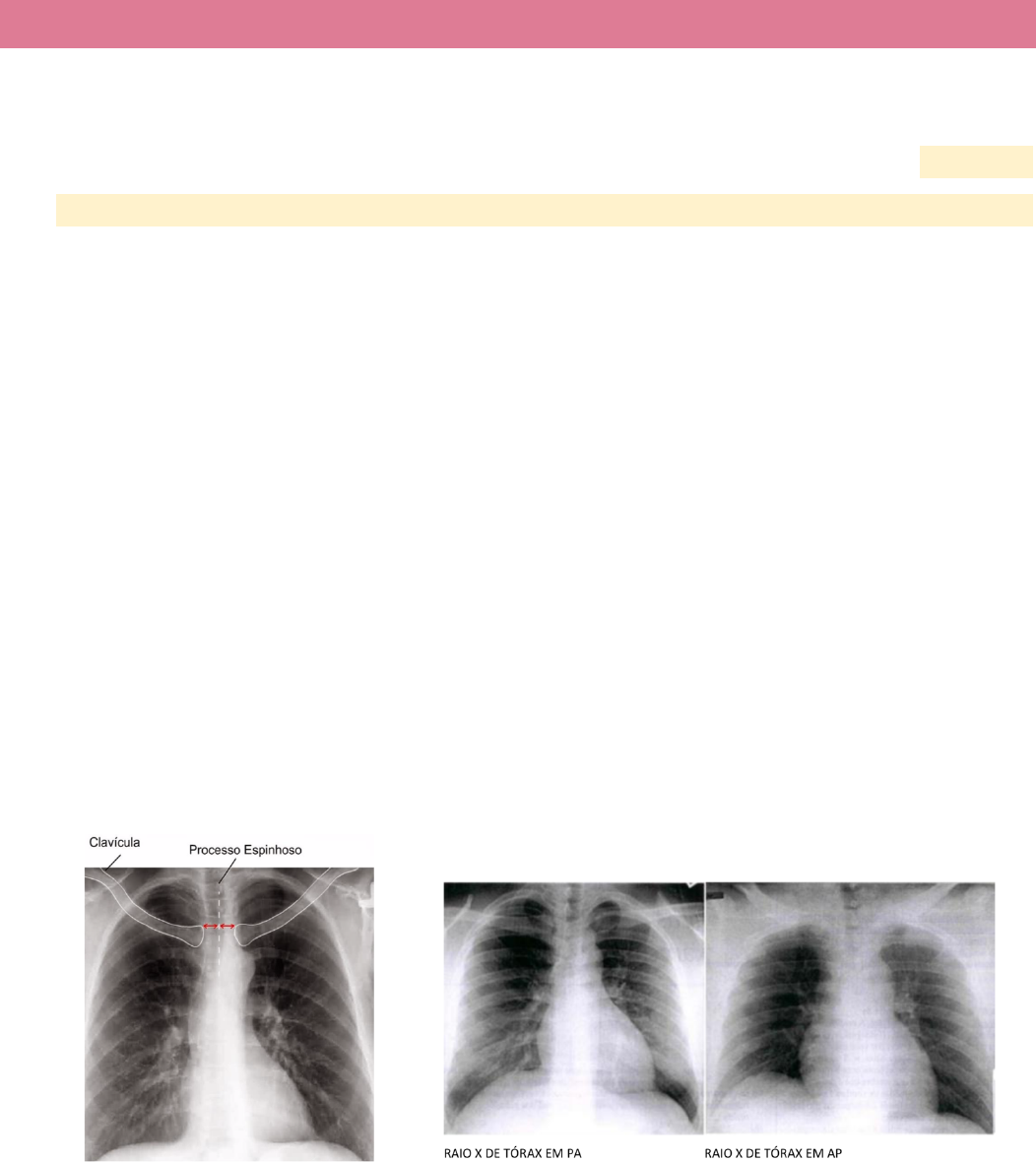 Priscilla Prado – turma 22 B 1 Raio X Torácico ® Filme convencional: baixa qualidade e durabilidade X Filme digital: melhor qualidade ® Maior densidade = mais branco AVALIAÇÃO DA TÉCNICA 1. Direção dos raios: póstero-anterior ou ântero-posterior? Raio X em PA - pessoa em pé : com bolha gástrica e sem escápulas no campo de visão. O RX em PA deve sempre ser acompanhado por um raio X de perfil. Raio X em AP - pessoa deitada (crianças, acamados) : sem bolha gástrica e com escápulas no campo de visão. Pode haver aumento enganoso do tamanho do coração. 2. Penetrância dos raios: quanto de radiação foi usado no Raio X? só pode ser avaliado em Raio X convencional. Grande penetração: visualização da coluna mesmo atrás do mediastino + pulmões muito pretos. Penetração normal: visualização de até 5 vértebras. 3. Centralização da imagem: centrado ou rodado? Visualizar se há equidistância entre as clavículas, ou se há deslocamento de alguma do centro do tórax. Raio X rodado: pode deslocar o mediastino, dando uma impressão de aumentado. Priscilla Prado – turma 22 B 2 4. Durante a inspiração ou expiração? Contar quantos arcos costais ANTERIORES existem até o diafragma. Normalmente o RaioX é feito em apnéia inspiratória máxima, para visualização melhor das estruturas. O RaioX expirado ocorre quando há suspeita de pneumotórax. Inspirado: 7º arco anterior cruzando o diafragma. Hiperinsuflado: após o 7º arco anterior cruzando o diafragma. Expirado: até o 6º arco anterior cruzando o diafragma. AVALIAÇÃO DA IMAGEM - Partes moles - Arcabouço ósseo - Traqueia, carina e brônquios fonte - Arco aórtico e cavidade cardíaca: deve-se medir o maior diâmetro do coração e ver se cabe em um hemitórax - Hilos pulmonares - Cúpulas diafragmáticas (a E costuma ser mais baixa que a D devido o peso do coração. Caso esteja mais alta que a D, suspeita- se de atelectasia E) - Seios osteogênicos e cardiogênicos (sendo o último não cobrado) - Parênquima pulmonar bilateral Visualizar e identificar os lobos pulmonares! Pulmão D: lobo anterior, médio e inferior : 2 incisuras Pulmão E: lobo anterior e inferior (médio -> língula) : 1 incisura Priscilla Prado – turma 22 B 3 Opacidade pulmonar -> indica algo dentro do pulmão, que não seja ar. Ex: secreção • Alveolar : com broncograma aéreo • Nodular: sem broncograma aéreo Opacidade com broncograma aéreo = opacidade alveolar -> indicativo de pneumonia, pois há secreção (branco) apenas dentro dos alvéolos, com os brônquios cheios de ar. Para diferenciar alterações no lobo médio e inferior D, devemos observar a silueta da cavidade cardíaca: se o lobo médio estiver acometido, não será possível visualizá-la; se o lobo inferior D estiver acometido, será possível visualizá-la. A outra opção é fazer um RX de perfil. Priscilla Prado – turma 22 B 4 Lobo superior direito Lobo médio Lobo inferior direito Lobo superior esquerdo Lobo inferior esquerdo Priscilla Prado – turma 22 B 5 Raio X normais RAIO X 1 Técnica • PA: bolha gástrica + escápulas fora do campo de visão • Centrado: clavículas equidistantes • Inspirado: o 7º arco intercostal cruza o diafragma no meio Imagem • Partes moles sem alterações • Arcabouço ósseo sem alterações • Traqueia visível e centralizada, com carinas e brônquios fonte visíveis e sem alteração • Arco aórtico visível sem alterações • Hilos pulmonares visíveis bilateralmente • Cavidade cardíaca sem alterações • Cúpulas diafragmáticas sem alterações • Seios osteogênicos livres • Parênquima pulmonar sem alterações bilateralmente Diagnóstico radiográfico : RX de tórax sem alterações Priscilla Prado – turma 22 B 6 Raio X 2 Técnica • AP: sem bolha gástrica + escápula no campo de visão • Rodado para esquerda (clavícula E mais deslocada) • Expirado Imagem • Partes moles sem alterações • Arcabouço ósseo sem alterações • Traqueia não visível, sem carinas e brônquios fonte visíveis • Arco aórtico visível sem alterações • Hilos pulmonares visíveis bilateralmente • Cardiomegalia? (RX em AP) • Cúpulas diafragmáticas sem alterações • Seios osteogênicos livres • Parênquima pulmonar sem alterações bilateralmente Diagnóstico radiográfico: RX de tórax sem alterações Priscilla Prado – turma 22 B 7 Raio X 3 Técnica • PA: escápulas fora do campo de visão • Rodado para direita (clavícula D mais deslocada do centro) • Expirado, mas quase inspirado Imagem • Partes moles sem alterações • Arcabouço ósseo sem alterações • Traqueia visível e centralizada, mas sem carinas e brônquios fonte visíveis • Arco aórtico visível sem alterações • Hilos pulmonares visíveis bilateralmente • Cavidade cardíaca sem alterações • Cúpulas diafragmáticas sem alterações • Seios osteogênicos livres • Parênquima pulmonar sem alterações bilateralmente Diagnóstico radiográfico : RX de tórax sem alterações Priscilla Prado – turma 22 B 8 Raio X 4 Técnica • PA: escápulas fora do campo de visão • Centrado • Inspirado Imagem • Partes moles sem alterações. Existência de prótese mamária bilateral • Arcabouço ósseo sem alterações • Traqueia visível e centralizada, mas sem carinas e brônquios fonte visíveis • Arco aórtico visível sem alterações • Hilos pulmonares visíveis bilateralmente • Cavidade cardíaca sem alterações • Cúpulas diafragmáticas? (RX tecnicamente ruim) • Seios osteogênicos? (RX tecnicamente ruim) • Parênquima pulmonar sem alterações bilateralmente Diagnóstico radiográfico : RX de tórax sem alterações Priscilla Prado – turma 22 B 9 Raio X patológicos inespecíficos Descrição radiológica: opacidade homogênea em lobo médio, com limites imprecisos e broncograma aéreo. Diagnóstico radiológico: opacidade alveolar de lobo médio. Descrição radiológica
