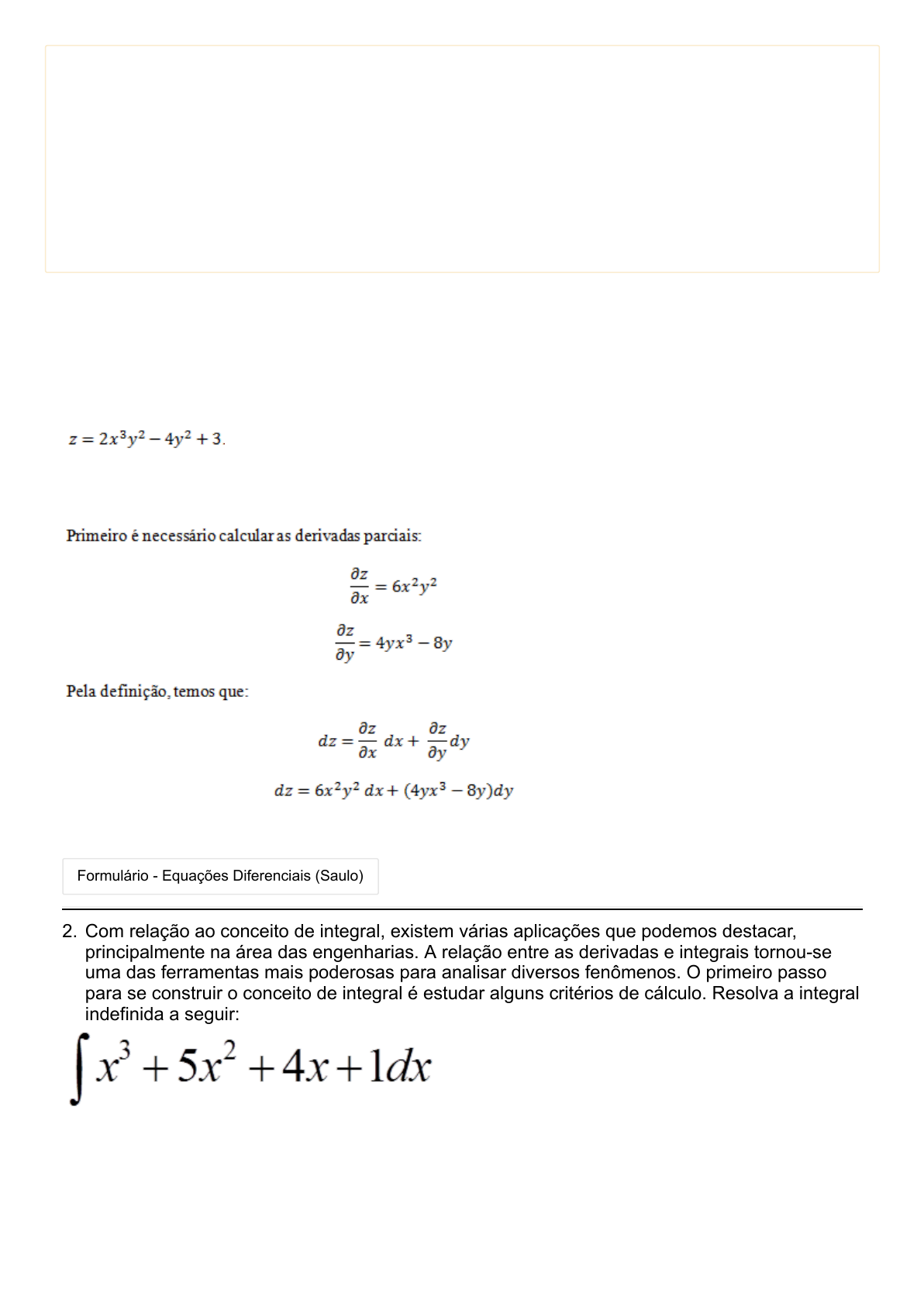 17/05/2021 UNIASSELVI - Centro Universitário Leonardo Da Vinci - Portal do Aluno - Portal do Aluno - Grupo UNIASSELVI https://portaldoalunoead.uniasselvi.com.br/ava/notas/request_gabarito_n2.php 1/2 Acadêmico: Sandro da Rosa Figueiredo (2541521) Disciplina: Cálculo Diferencial e Integral II (MAD103) Avaliação: Avaliação Final (Discursiva) - Individual Semipresencial ( Cod.:668770) (peso.:4,00) Prova: 30360839 Nota da Prova: 9,00 1. O conceito de derivada está intimamente relacionado à taxa de variação instantânea de uma função, o qual está presente no cotidiano das pessoas, através, por exemplo, da determinação da taxa de crescimento de uma certa população, da taxa de crescimento econômico do país, da taxa de redução da mortalidade infantil, entre outros. A diferencial é calculada com base nas derivadas parciais da função. Assim, calcule a diferencial dz da função z a seguir: Resposta Esperada: A resposta deverá ser baseada no seguinte: Anexos: Formulário - Equações Diferenciais (Saulo) 2. Com relação ao conceito de integral, existem várias aplicações que podemos destacar, principalmente na área das engenharias. A relação entre as derivadas e integrais tornou-se uma das ferramentas mais poderosas para analisar diversos fenômenos. O primeiro passo para se construir o conceito de integral é estudar alguns critérios de cálculo. Resolva a integral indefinida a seguir: https://portaldoalunoead.uniasselvi.com.br/extranet/layout/request/imag_prova_ead_anexo_n2.php?action1=MzAzNjA4Mzk=&action2=NzQ2MzAy 17/05/2021 UNIASSELVI - Centro Universitário Leonardo Da Vinci - Portal do Aluno - Portal do Aluno - Grupo UNIASSELVI https://portaldoalunoead.uniasselvi.com.br/ava/notas/request_gabarito_n2.php 2/2 Resposta Esperada: Resposta esperada: Anexos: Formulário - Cálculo Diferencial e Integral (MAD) - Paulo https://portaldoalunoead.uniasselvi.com.br/extranet/layout/request/imag_prova_ead_anexo_n2.php?action1=MzAzNjA4Mzk=&action2=NzQ2MzAz