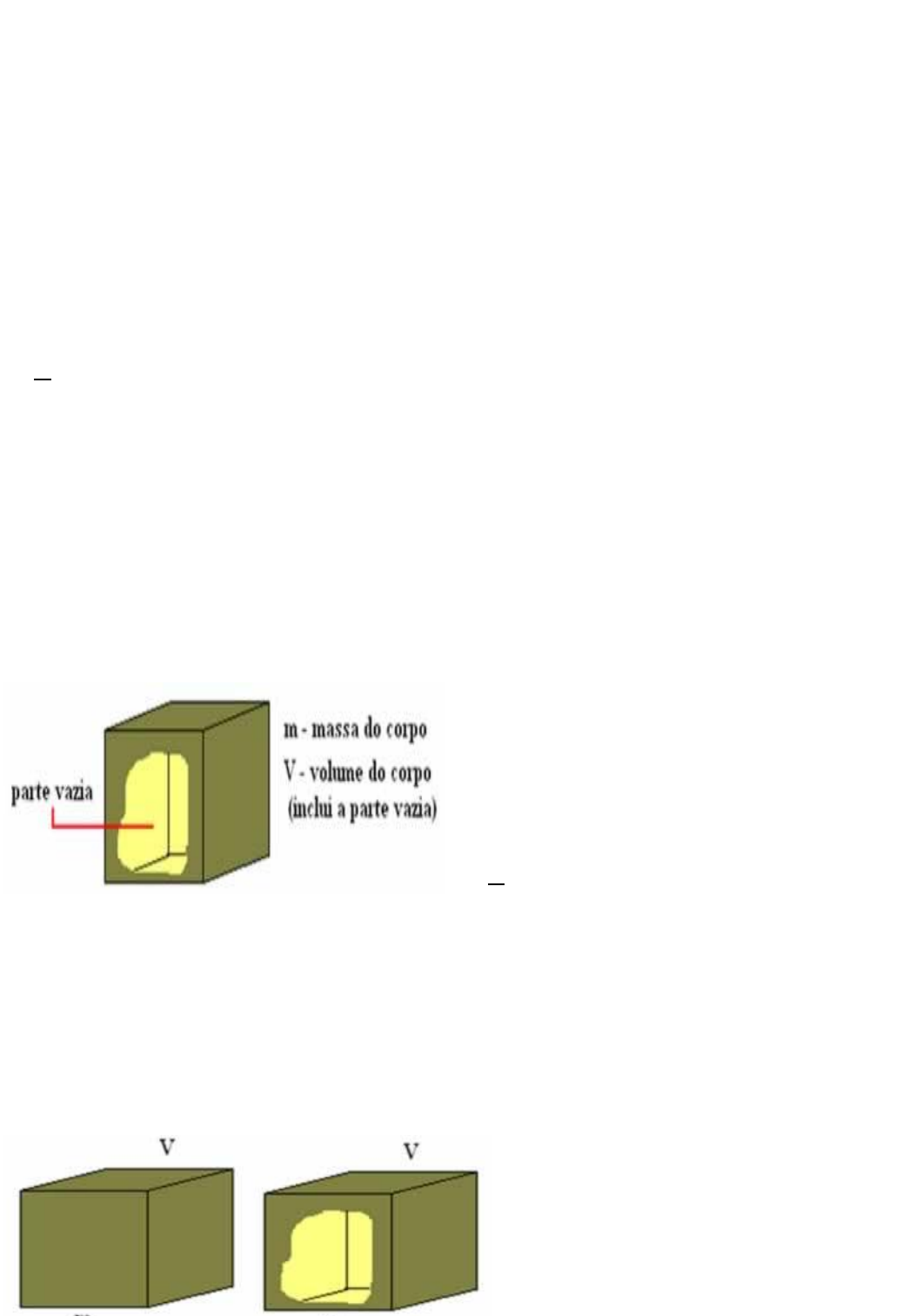 Massa específica e Densidade Massa específica e densidade são a razão entre massa e o volume de um corpo. No entanto, a massa específica é sempre constante e a densidade varia conforme o corpo. Massa específica Vamos considerar uma porção de uma determinada substância homogênea (pois todos os pontos dessa substância apresentam as mesmas propriedades) e maciça. Essa porção possui massa e volume, então podemos verificar que a razão entre sua massa e seu volume tem sempre um mesmo valor. A esse valor constante chamamos de massa específica (µ). Sendo assim, a massa específica é característica de cada substância e pode ser definida como sendo a razão entre a massa e o volume correspondente. Massa específica é representada pela equação: µ = m V Para uma determinada substância, a massa específica é sempre a mesma, então a massa dessa substância é diretamente proporcional ao volume ocupado por ela. No sistema internacional de unidades SI, a massa está em kg e o volume em m3, portanto a massa específica é dada em kg/m3. Densidade Vamos agora considerar um corpo de massa m e volume V que pode ser heterogêneo ou oco (como mostra a figura abaixo): Esse corpo possui uma massa m e um volume V, que inclui a parte vazia (oca). Dessa forma, podemos definir densidade como: A densidade de um corpo é dada pela razão entre a massa e o volume correspondente. d = m V As unidades de densidade e massa específica são as mesmas. Vimos que a massa específica de uma substância é constante, já a densidade varia conforme o corpo. Mesmo sendo a mesma equação utilizada, massa específica e densidade têm conceitos diferentes. Definimos massa específica como sendo a razão da massa e do volume de uma substância maciça, por exemplo: um bloco de ferro. Temos que ficar atentos, pois um sólido oco apresenta densidade menor que a massa específica do material que o constitui. Um corpo maciço de massa m e volume V e um corpo oco de massa m e volume V.