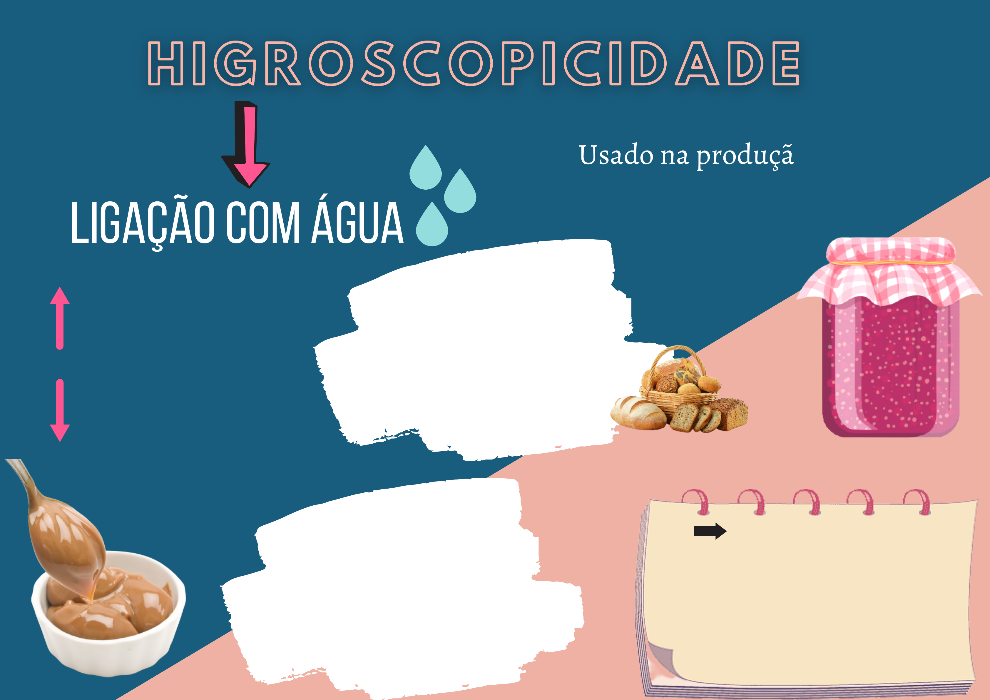 Controlam aControlam aControlam a atividade de águaatividade de águaatividade de água dos alimentosdos alimentosdos alimentos HIGROSCOPICIDADEHIGROSCOPICIDADE Ligação com água Usado na produção de geléias e doces Lactose Frutose Desejável em produtos de padaria e confeitaria Indesejado em produtos em pó e granulados