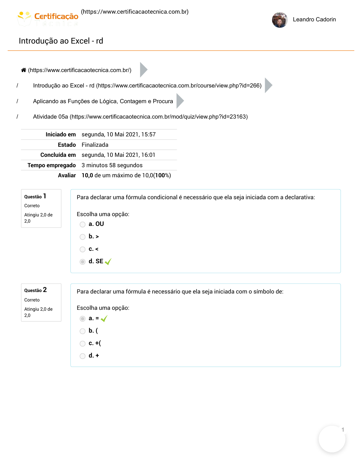 (https://www.certificacaotecnica.com.br) Leandro Cadorin Introdução ao Excel - rd Questão 1 Correto Atingiu 2,0 de 2,0 Questão 2 Correto Atingiu 2,0 de 2,0 / / / Iniciado em segunda, 10 Mai 2021, 15:57 Estado Finalizada Concluída em segunda, 10 Mai 2021, 16:01 Tempo empregado 3 minutos 58 segundos Avaliar 10,0 de um máximo de 10,0(100%) Para declarar uma fórmula condicional é necessário que ela seja iniciada com a declarativa: Escolha uma opção: a. OU b. > c. < d. SE Para declarar uma fórmula é necessário que ela seja iniciada com o símbolo de: Escolha uma opção: a. = b. ( c. +( d. + (https://www.certificacaotecnica.com.br/) Introdução ao Excel - rd (https://www.certificacaotecnica.com.br/course/view.php?id=266) Aplicando as Funções de Lógica, Contagem e Procura Atividade 05a (https://www.certificacaotecnica.com.br/mod/quiz/view.php?id=23163) 1 https://www.certificacaotecnica.com.br/ https://www.certificacaotecnica.com.br/ https://www.certificacaotecnica.com.br/course/view.php?id=266 https://www.certificacaotecnica.com.br/mod/quiz/view.php?id=23163 Questão 3 Correto Atingiu 2,0 de 2,0 Questão 4 Correto Atingiu 2,0 de 2,0 Questão 5 Correto Atingiu 2,0 de 2,0 A melhor definição de fórmulas no Excel é: Escolha uma opção: a. Uma linha de instruções que faz o Excel calcular números reais b. Expressões matemáticas representadas numa célula c. Equações que retornam o valor numa célula d. Um código que o Excel executa para obtenção de um valor Para que o Excel resolva uma operação de soma e depois divida o resultado da soma, ela deve ser declarada de que forma? Escolha uma opção: a. =(B4+C4)/2 b. =(B4+C4/2) c. (B4+C4)=/2 d. (=B4+C4)/2 O tipo de fórmula que retorna as palavras “Verdadeiro” e “Falso”, fazendo comparações entre valores é? Escolha uma opção: a. Numérico b. Equacional c. Lógico d. Condicional