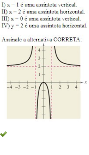 7. Existem algumas funções racionais cujos gráficos se aproximam bastante de uma reta vertical, que é denominada assíntota vertical. Em contrapartida, as assíntotas horizontais dependem do comportamento de uma função quando o valor de x tende a valores extremamente grandes ou pequenos. Faça a análise gráfica da função a seguir e analise as sentenças a seguir: a) As sentenças I e II estão corretas. b) As sentenças I e IV estão corretas. c) As sentenças III e IV estão corretas. d) As sentenças II e III estão corretas. 7 . Existem algumas funções racionais cujos gráficos se aproxima m bastante de uma reta vertical, que é denominada assíntota vertical. Em contrapartida, as assíntotas horizontais dependem do comportamento de uma função quando o valor de x tende a valores extrem amente grandes ou pequenos. Faça a análise gráfica da função a seguir e analise as sentenças a seguir: a) As sentenças I e II estão corretas. b) As sentenças I e IV estão corretas. c) As sentenças III e IV estão corretas. d) As sentenças II e III estão corretas. 7. Existem algumas funções racionais cujos gráficos se aproximam bastante de uma reta vertical, que é denominada assíntota vertical. Em contrapartida, as assíntotas horizontais dependem do comportamento de uma função quando o valor de x tende a valores extremamente grandes ou pequenos. Faça a análise gráfica da função a seguir e analise as sentenças a seguir: a) As sentenças I e II estão corretas. b) As sentenças I e IV estão corretas. c) As sentenças III e IV estão corretas. d) As sentenças II e III estão corretas.