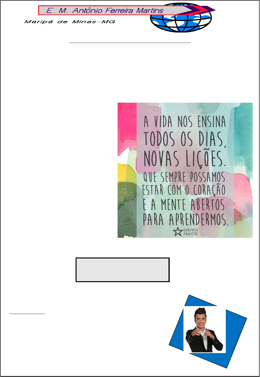 QUESTÃO 2 PLANO DE ESTUDOS DIRECIONADOS DISCIPLINAS: pORTUGUÊS e arte PROFESSORA: SAMARA HENRIQUES DE SOUSA DATA: _____/____/2020 ALUNO (A):________________________________________________________ TURMA: 5º Ano ___ - Charles Chaplin -------------------------------------------------------------------------------------------------------------------------------------- Meus queridos alunos! Estou com saudades de todos. Espero que mesmo de longe, estejam sentindo o meu carinho, através das atividades que preparo. Estou orgulhosa, vocês têm se dedicado e realizado os planos direcionados de atividades com muito capricho, atenção e cuidado. Saudades de todos vocês. Em breve vamos nos reencontrar. Com carinho. Professora Samara Setembro/2020 ----------------------------------------------------------------------------------------------------------------------------------------------------------------------------Português · Texto para à questão 1. Dona Maria Me desculpe vir aqui desse jeito Me perdoe o traje de maloqueiro De camisa larga e boné pra trás Bem na hora da novela que a senhora gosta mais Faz três dias que eu não durmo direito Sua filha me deixou desse jeito E o que ela mais fala é que a senhora é brava Mas hoje eu não vou aceitar levar um não pra casa [... ] https://www.letras.mus.br ATIVIDADE 1: Analise o trecho da canção “Dona Maria” do cantor Thiago Brava com (part. Jorge) e faça um círculo ao redor da sílaba tônica das palavras abaixo e depois classifique-as em OXÍTONA, PAROXÍTONA e PROPAROXÍTONA: DESCULPE TRAJE MALOQUEIRO CAMISA DIREITO AQUI PERDOE BONÉ LARGA FILHA DESSE JEITO HORA NOVELA SENHORA SÍLABA TÔNICA · Texto para à questão 2. Apelido Carinhoso Amor, não é segredo entre a gente Que o meu término é recente E você tá arrumando o que ela revirou E esse sentimento pendente Que insiste em bagunçar a minha mente Vai passar um dia, mas ainda não passou [... ] https://www.letras.mus.br ATIVIDADE 2: Após analisar o trecho da canção “Apelido Carinhoso” do cantor Gusttavo Lima, observe as palavras abaixo e marque um X na opção correta sobre sua classificação quanto à sílaba tônica (OXÍTONA, PAROXÍTONA e PROPAROXÍTONA). · Amor ( ) oxítona ( ) paroxítona ( ) proparoxítona · Segredo ( ) oxítona ( ) paroxítona ( ) proparoxítona · Término ( ) oxítona ( ) paroxítona ( ) proparoxítona · Recente ( ) oxítona ( ) paroxítona ( ) proparoxítona · Arrumando ( ) oxítona ( ) paroxítona ( ) proparoxítona · Revirou ( ) oxítona ( ) paroxítona ( ) proparoxítona · Bagunçar ( ) oxítona ( ) paroxítona ( ) proparoxítona · Mente ( ) oxítona ( ) paroxítona ( ) proparoxítona · Minha ( ) oxítona ( ) paroxítona ( ) proparoxítona · Insiste ( ) oxítona ( ) paroxítona ( ) proparoxítona · Texto para à questão 3. Impressionando os Anjos Hoje foi tudo bem, só um pouco cansativo Dia duro no trabalho que acabou comigo Tô aqui com os pés pra cima pronto pra dormir A saudade de você é visita frequente Que nem a sua tia chata que irritava a gente Ah, saudade da gente Tirando isso, do resto até que eu estou dando conta A Julinha tá banguela e o Pedro só apronta O que faltava do carro eu já quitei a conta [... ] https://www.letras.mus.br ATIVIDADE 3: Analise o trecho da canção “Impressionando os anjos” do intérprete Gustavo Mioto, em seguida, pinte a sílaba tônica das palavras abaixo. IMPRESSIONANDO GENTE DANDO CONTA ANJOS VISITA FREQUENTE TIRANDO DURO SAUDADE CHATA ISSO TRABALHO HOJE COMIGO IRRITAVA ACABOU AQUI BANGUELA JULINHA PRONTO VOCÊ TIA CIMA RESTO PEDRO APRONTA FALTAVA · Leia o texto abaixo e responda à questão 4.FAMÍLIA: FELIDAE COLORAÇÃO: a coloração e o padrão de manchas variam individualmente, sendo predominantemente amarelada nas regiões superiores, com manchas pretas, chamadas de rosetas. Essas rosetas formam bandas longitudinais no flanco do animal, sendo possível identificar indivíduos que possuem diferentes padrões de bandas e rosetas. ALIMENTAÇÃO: lagartos, serpentes, pequenos roedores, ouriços, cutias, pacas, tatus, marsupiais, macacos, pequenos veados, aves, ovos, carcaças. HABITAT: em ambientes florestados. Ocorrem também em áreas de campos, manguezais e banhados, aparentemente há a necessidade de que estas áreas estejam próximas a florestas. CURIOSIDADES: caçam animais no solo, porém alimentam-se com frequência de animais de hábitos arborícolas como primatas, ouriços e outros. São solitárias e noturnas sendo possível a observação de mais de um indivíduo durante a reprodução e a mãe criando seus filhotes. Usam espaços entre raízes de grandes árvores caídas como abrigos para seus filhotes. ATIVIDADE 4: No trecho “Caçam animais no solo[...]” o verbo ‘caçam’ refere-se a (A) curiosidades. (B) primatas. (C) jaguatiricas. (D) florestas. · Leia o texto abaixo e responda às questões 5, 6 e 7. Copa 2014 A Fifa anunciou na noite deste domingo o nome da mascote oficial da Copa do Mundo de 2014. Depois de uma eleição que durou três meses e oferecia três alternativas – todas sugeridas pela própria Fifa – a palavra Fuleco foi escolhida por 1,7 milhão de brasileiros, que corresponde a 48% dos votos. O nome vencedor vem da fusão de “futebol e “ecologia”. Em segundo lugar ficou Zuzeco, com 31%, que era a combinação entre “azul’ e “ecologia”. O nome Amijubi, de “amizade” e “júbilo”, terminou em terceiro lugar, com 21% dos votos. https://veja.abril.com.br/esporte/mascote-da-copa-2014-ganha-nome-de-fuleco/ ATIVIDADE 5: A informação principal desse texto está no trecho: (A) “Depois de uma eleição que durou três meses [...] a palavra Fuleco foi escolhida...”. (B) “O nome vencedor vem da fusão de ‘futebol’ e ‘ecologia’.”. (C) “Em segundo lugar ficou Zuzeco [...] que era a combinação entre ‘azul’ e ‘ecologia’.”. (D) “O nome Amijubi, de ‘amizade’ e ‘júbilo’ terminou 
