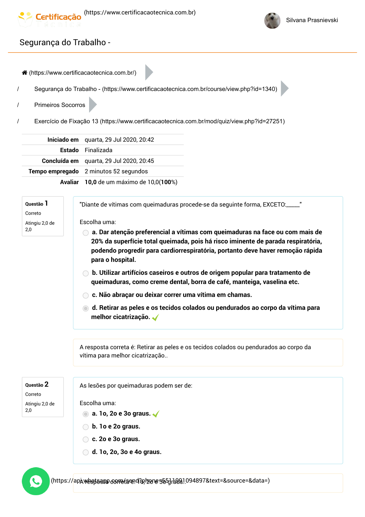 / (https://www.certificacaotecnica.com.br) Silvana Prasnievski Segurança do Trabalho - Questão 1 Correto Atingiu 2,0 de 2,0 Questão 2 Correto Atingiu 2,0 de 2,0 / / / Iniciado em quarta, 29 Jul 2020, 20:42 Estado Finalizada Concluída em quarta, 29 Jul 2020, 20:45 Tempo empregado 2 minutos 52 segundos Avaliar 10,0 de um máximo de 10,0(100%) "Diante de vítimas com queimaduras procede-se da seguinte forma, EXCETO:_____" Escolha uma: a. Dar atenção preferencial a vítimas com queimaduras na face ou com mais de 20% da superfície total queimada, pois há risco iminente de parada respiratória, podendo progredir para cardiorrespiratória, portanto deve haver remoção rápida para o hospital. b. Utilizar artifícios caseiros e outros de origem popular para tratamento de queimaduras, como creme dental, borra de café, manteiga, vaselina etc. c. Não abraçar ou deixar correr uma vítima em chamas. d. Retirar as peles e os tecidos colados ou pendurados ao corpo da vítima para melhor cicatrização. A resposta correta é: Retirar as peles e os tecidos colados ou pendurados ao corpo da vítima para melhor cicatrização.. As lesões por queimaduras podem ser de: Escolha uma: a. 1o, 2o e 3o graus. b. 1o e 2o graus. c. 2o e 3o graus. d. 1o, 2o, 3o e 4o graus. A resposta correta é: 1o, 2o e 3o graus.. (https://www.certificacaotecnica.com.br/) Segurança do Trabalho - (https://www.certificacaotecnica.com.br/course/view.php?id=1340) Primeiros Socorros Exercício de Fixação 13 (https://www.certificacaotecnica.com.br/mod/quiz/view.php?id=27251) (https://api.whatsapp.com/send?phone=5511991094897&text=&source=&data=) https://www.certificacaotecnica.com.br/ https://www.certificacaotecnica.com.br/ https://www.certificacaotecnica.com.br/course/view.php?id=1340 https://www.certificacaotecnica.com.br/mod/quiz/view.php?id=27251 https://api.whatsapp.com/send?phone=5511991094897&text=&source=&data= / Questão 3 Correto Atingiu 1,0 de 1,0 Questão 4 Correto Atingiu 1,0 de 1,0 Questão 5 Correto Atingiu 1,0 de 1,0 "Nos casos de asfixia, principalmente em meio líquido (afogamento), a falta do O2 provoca a liberação de adrenalina na corrente sanguínea, causando um sensível aumento da frequência cardíaca. A adrenalina provoca ainda uma constrição dos vasos sanguíneos, que podem se tornar frios e de cor azulada, especialmente nas extremidades. Que nome se dá a essa constrição?_____" Escolha uma: a. Epiderme b. Cianose c. Esclerose d. Adrenalina A resposta correta é: Cianose. "Considere os seguintes sintomas: I. Pupila dilatada e sem reação. II. Pulsação forte e lenta. III. Suor excessivo. São sintomas de vítimas de hemorragia interna: _____" Escolha uma: a. Todas as afirmações. b. Somente I, III. c. Somente I, II. d. Somente II, III. A resposta correta é: Somente I, III.. Qual é a principal via de penetração no organismo no caso de intoxicação profissional de uma substância? Escolha uma: a. Parenteral b. Cutânea c. Digestiva d. Respiratória A resposta correta é: Respiratória. (https://api.whatsapp.com/send?phone=5511991094897&text=&source=&data=) https://api.whatsapp.com/send?phone=5511991094897&text=&source=&data= / Questão 6 Correto Atingiu 2,0 de 2,0 Questão 7 Correto Atingiu 1,0 de 1,0 "Objetos aquecidos, chamas, vapores quentes, entre outros, são agentes causadores de queimaduras, as quais, segundo sua gravidade, podem ser de primeiro, segundo ou terceiro graus. Assinale a alternativa que apresenta uma alternativa correta com relação às queimaduras:_____" Escolha uma ou mais: a. Queimadura de terceiro grau é aquela que apresenta somente vermelhidão superficial. b. O risco de morte em queimaduras é maior quanto mais profunda for a queimadura. c. Queimadura de primeiro grau é aquela em que os tecidos queimam em profundidade, podendo alcançar até os ossos. d. A gravidade das queimaduras está mais relacionada com a profundidade do que com a extensão das queimaduras. A resposta correta é: A gravidade das queimaduras está mais relacionada com a profundidade do que com a extensão das queimaduras.. A conduta para o atendimento em casos de convulsão é parecida com a de vítimas de epilepsia, por isso devemos, EXCETO: Escolha uma: a. Procurar lateralizar a vítima e conversar com ela para acalmá-la. b. Protegê-la para que não se machuque e aguardar até o final da crise. c. Despir a vítima. d. Não tentar impedir a contração dos membros, para não aumentar o desconforto físico da vítima. A resposta correta é: Despir a vítima.. (https://api.whatsapp.com/send?phone=5511991094897&text=&source=&data=) https://api.whatsapp.com/send?phone=5511991094897&text=&source=&data=