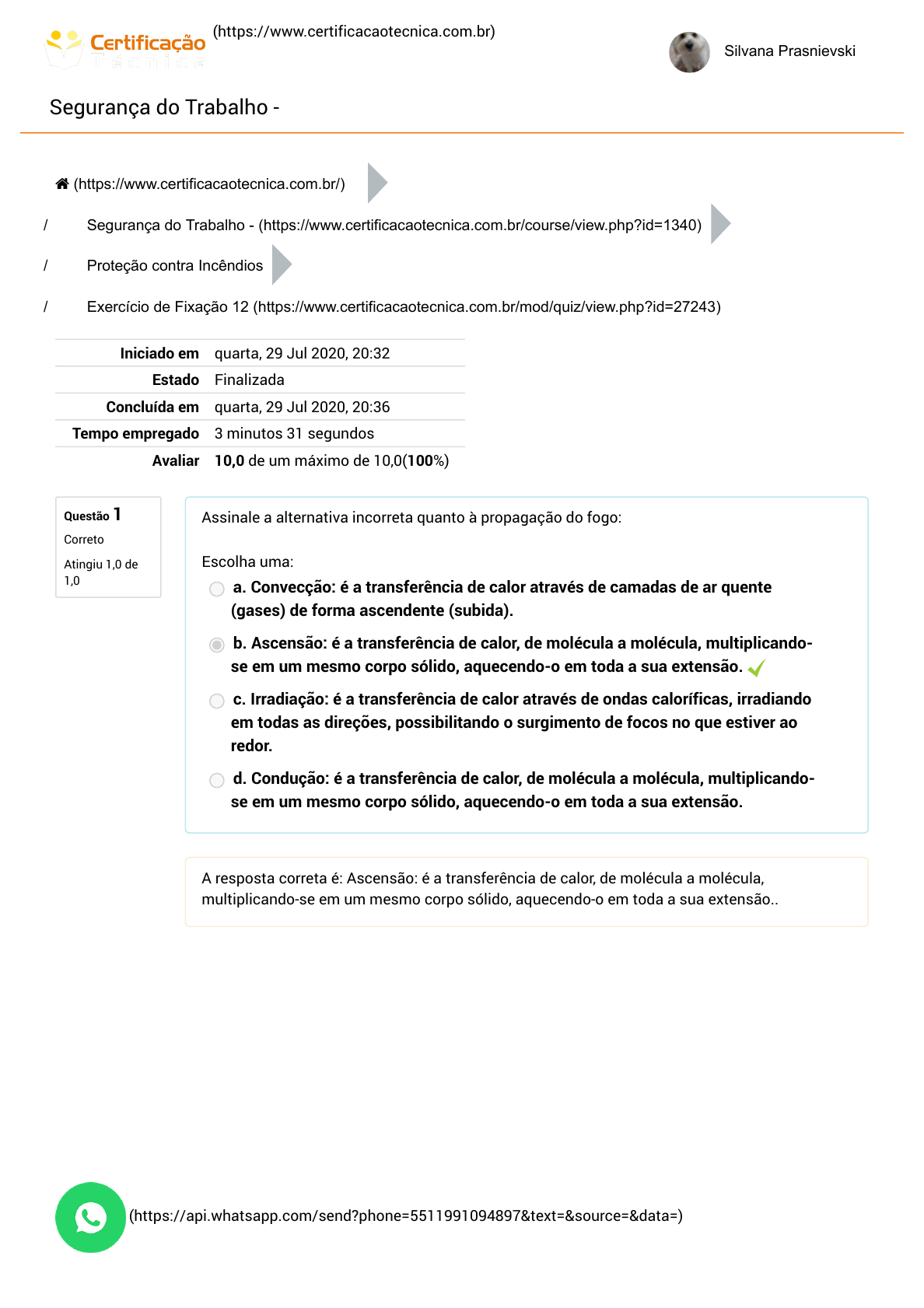 / (https://www.certificacaotecnica.com.br) Silvana Prasnievski Segurança do Trabalho - Questão 1 Correto Atingiu 1,0 de 1,0 / / / Iniciado em quarta, 29 Jul 2020, 20:32 Estado Finalizada Concluída em quarta, 29 Jul 2020, 20:36 Tempo empregado 3 minutos 31 segundos Avaliar 10,0 de um máximo de 10,0(100%) Assinale a alternativa incorreta quanto à propagação do fogo: Escolha uma: a. Convecção: é a transferência de calor através de camadas de ar quente (gases) de forma ascendente (subida). b. Ascensão: é a transferência de calor, de molécula a molécula, multiplicando- se em um mesmo corpo sólido, aquecendo-o em toda a sua extensão. c. Irradiação: é a transferência de calor através de ondas caloríficas, irradiando em todas as direções, possibilitando o surgimento de focos no que estiver ao redor. d. Condução: é a transferência de calor, de molécula a molécula, multiplicando- se em um mesmo corpo sólido, aquecendo-o em toda a sua extensão. A resposta correta é: Ascensão: é a transferência de calor, de molécula a molécula, multiplicando-se em um mesmo corpo sólido, aquecendo-o em toda a sua extensão.. (https://www.certificacaotecnica.com.br/) Segurança do Trabalho - (https://www.certificacaotecnica.com.br/course/view.php?id=1340) Proteção contra Incêndios Exercício de Fixação 12 (https://www.certificacaotecnica.com.br/mod/quiz/view.php?id=27243) (https://api.whatsapp.com/send?phone=5511991094897&text=&source=&data=) https://www.certificacaotecnica.com.br/ https://www.certificacaotecnica.com.br/ https://www.certificacaotecnica.com.br/course/view.php?id=1340 https://www.certificacaotecnica.com.br/mod/quiz/view.php?id=27243 https://api.whatsapp.com/send?phone=5511991094897&text=&source=&data= / Questão 2 Correto Atingiu 2,0 de 2,0 Questão 3 Correto Atingiu 1,0 de 1,0 Questão 4 Correto Atingiu 1,0 de 1,0 O fogo é classificado em quatro classes. Quais são os materiais enquadrados na Classe B? Escolha uma: a. São considerados inflamáveis os produtos que queimem somente em sua superfície, não deixando resíduos, como óleo, graxas, vernizes, tintas, gasolina. b. Elementos pirofóricos como magnésio, zircônio e titânio. c. Equipamentos elétricos energizados como motores, transformadores, quadros de distribuição, fios. d. São materiais de fácil combustão aqueles com a propriedade de queimarem em sua superfície e profundidade, e que deixem resíduos, como tecidos, madeira, pa- pel, fibra. A resposta correta é: São considerados inflamáveis os produtos que queimem somente em sua superfície, não deixando resíduos, como óleo, graxas, vernizes, tintas, gasolina.. Para combater o fogo descrito na questão anterior, devemos fazer uso de que tipo de extintor? Escolha uma: a. Químico seco b. Água pressurizada c. Água pressurizada e/ou espuma d. Espuma A resposta correta é: Químico seco. Quando o fogo ocorre em equipamentos elétricos energizados como motores, ele recebe a denominação de: Escolha uma: a. Classe A b. Classe D c. Classe C d. Classe B A resposta correta é: Classe C. (https://api.whatsapp.com/send?phone=5511991094897&text=&source=&data=) https://api.whatsapp.com/send?phone=5511991094897&text=&source=&data= / Questão 5 Correto Atingiu 1,0 de 1,0 Questão 6 Correto Atingiu 2,0 de 2,0 Segundo as normas do Ministério do Trabalho, todas as empresas deverão possuir, EXCETO: Escolha uma: a. Saídas suficientes para a rápida retirada do pessoal em serviço, em caso de incêndio. b. Pessoas adestradas no uso correto desses equipamentos. c. Equipamento suficiente e específico para combater fogos de Classe B. d. Proteção contra incêndio. A resposta correta é: Equipamento suficiente e específico para combater fogos de Classe B.. Em relação aos agentes extintores e aos extintores portáteis utilizados no combate ao fogo, afirma-se que a(o): Escolha uma: a. espuma mecânica deve ser aplicada contra um anteparo para ir cobrindo lentamente a superfície da área em chamas. b. espuma mecânica age apenas por abafamento, devido à ação da própria espuma. c. gás carbônico é indicado para a cobertura de riscos em equipamentos elétricos devido à sua capacidade condutora. d. gás carbônico é mantido no cilindro no estado gasoso, sob pressão de 50 a 60 bar à temperatura ambiente. A resposta correta é: gás carbônico é indicado para a cobertura de riscos em equipamentos elétricos devido à sua capacidade condutora.. (https://api.whatsapp.com/send?phone=5511991094897&text=&source=&data=) https://api.whatsapp.com/send?phone=5511991094897&text=&source=&data= / Questão 7 Correto Atingiu 1,0 de 1,0 Questão 8 Correto Atingiu 1,0 de 1,0 O fogo é classificado em quatro classes. Quais são os materiais enquadrados na Classe A? Escolha uma: a. Elementos pirofóricos como magnésio, zircônio e titânio. b. São materiais de fácil combustão aqueles com a propriedade de queimarem em sua superfície e profundidade, e que deixem resíduos, como tecidos, madeira, papel, fibra. c. Equipamentos elétricos energizados como motores, transformadores, quadros de distribuição, fios. d. São considerados inflamáveis os produtos que queimem somente em sua superfície, não deixando resíduos, como óleo, graxas, vernizes, tintas, gasolina. A resposta correta é: São materiais de fácil combustão aqueles com a propriedade de queimarem em sua superfície e profundidade, e que deixem resíduos, como tecidos, madeira, papel, fibra.. O extintor de incêndio cujo procedimento de uso consiste em retirar o pino de segurança, empunhar e apertar o gatilho, e dirigir o difusor por toda a extensão do fogo, é o de: Escolha uma ou mais: a. Dióxido de Carbono b. Água com pressão injetada. c. PQS com pressão injetável. d. Espuma mecânica pressurizada. A resposta correta é: Dióxido de Carbono. (https://api.whatsapp.com/send?phone=5511991094897&text=&source=&data=) https://api.whatsapp.com/send?phone=5511991094897&text=&source=&data=