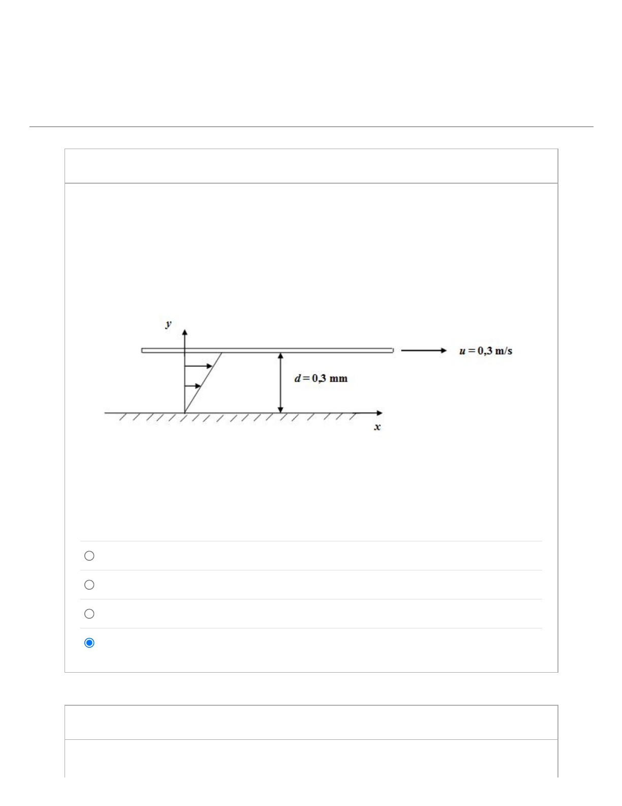22/05/2021 Teste: TESTE FINAL_1_2021 https://pucminas.instructure.com/courses/63792/quizzes/186417/take 1/9 TESTE FINAL_1_2021 Iniciado: 22 mai em 16:39 Instruções do teste 1 ptsPergunta 1 7,39x10 m /s; 1,36x10 lbf/ft ; 7,39x10 m /s; 1,36x10 lbf/ft ; 7,39x10 m /s; 1,36x10 lbf/ft . 7,39x10 m /s; 1,36x10 lbf/ft ; Uma placa infinita é movimentada sobre uma segunda placa em uma camada de líquido, conforme mostrado no diagrama. Para um espaçamento “d” pequeno entre as placas, supõe-se uma distribuição linear de velocidades no líquido. As propriedades do fluido são coeficiente de viscosidade cinemática 0,65 cSt e densidade relativa igual a 0,88. Determinar a viscosidade cinemática do fluido em (m /s) e a tensão de cisalhamento na placa superior em (lbf/ft ). 2 2 -5 2 -2 2 -7 2 -5 2 -5 2 -2 2 -7 2 -2 2 1 ptsPergunta 2 22/05/2021 Teste: TESTE FINAL_1_2021 https://pucminas.instructure.com/courses/63792/quizzes/186417/take 2/9 56,0 kW; 274,4 kW 560 kW; 274,4 kW 27,44 kW; 560 kW 274,4 kW; 560 kW Uma empresa de energia utiliza um sistema de “armazenamento” de energia conforme mostra a figura. À noite, quando sobra energia, é feito um bombeamento de água de um lago para um reservatório elevado e, durante o dia esta água é utilizada para gerar energia em uma turbina. Considerando que a vazão de água é sempre 500 litros/s e que os rendimentos da bomba e da turbina são 70%, determinar a potência, em (kW), necessária na bomba e a potência, em (kW), recuperada na turbina. 1 ptsPergunta 3 Na instalação da figura a máquina é uma bomba e o fluido é água. A bomba tem potência de 3600 W e seu rendimento é 80%. A água é descarregada na atmosfera a uma velocidade de 5 m/s pelo tubo, cuja área da seção é 10 cm . Determinar a perda de carga entre as seções (1) e (2) em (m). 2 22/05/2021 Teste: TESTE FINAL_1_2021 https://pucminas.instructure.com/courses/63792/quizzes/186417/take 3/9 1,45 m 6,25 m 62,5 m 14,5 m 1 ptsPergunta 4 3,8 cm; 3,4 cm; 9,9 cm; 3,7 cm. OZISIK, M. Necati. Transferência de Calor - um texto básico. Rio de Janeiro: Editora Guanabara Koogan S.A., 1990. p. 661 p. Uma parede composta é constituída por uma camada de tijolos com 10 cm de espessura e condutividade térmica 0,7 W/ (m.° C), e uma camada de gesso de 3 cm de espessura e condutividade térmica 0,5 W/ (m. °C). Um material isolante, condutividade térmica 0,08 W/ (m. °C) deve ser acrescentado para reduzir de 70% a transferência de calor através da placa. Determinar a espessura da camada isolante, em (cm). 22/05/2021 Teste: TESTE FINAL_1_2021 https://pucminas.instructure.com/courses/63792/quizzes/186417/take 4/9 1 ptsPergunta 5 3,0 kg/(m.s) 0,010 kg/(m.s) 1,5 kg/(m.s) 15,0 kg/(m.s) 100,0 kg/(m.s) PETROBRAS - ENGENHEIRO(A) DE EQUIPAMENTOS JÚNIOR MECÂNICA 1/2012 Um experimento consiste em um sistema de duas placas, sendo que uma está imóvel (V = 0), e a outra é puxada com uma força por unidade de área igual a 1,50 Pa. Um fluido viscoso ocupa o espaço entre as duas placas que se situam a D = 2,0 cm uma da outra. Devido à viscosidade do fluido, a placa de cima se move paralelamente à primeira com V = 1,0 cm/s. A viscosidade absoluta do fluido, em kg/(m.s), é 1 2 1 ptsPergunta 6 ÇENGEL, Yunus A.; GHAJAR, Afshin J. Transferência de Calor e Massa. 4 ed., Porto Alegre: AMGH Editora Ltda, 2012.906 p. Um aquecedor elétrico com uma superfície total de 0,25 m e emissividade igual a 0,75 está em uma sala onde o ar tem uma temperatura de 20°C e as paredes estão 2 22/05/2021 Teste: TESTE FINAL_1_2021 https://pucminas.instructure.com/courses/63792/quizzes/186417/take 5/9 160 °C; 152,9 °C; 120 °C; 114,7 °C. 140 °C; 133,8 °C; 150 °C; 143,3 °C; a 10°C. Quando o aquecedor consome 500 W de potência elétrica, a sua superfície tem uma temperatura constante de 120°C. Determinar a temperatura da superfície do aquecedor quando este consome 700 W, em (°C): 1. Supondo a radiação desprezada. 2. Tendo em consideração a radiação. 1 ptsPergunta 7 Um manômetro diferencial é usado para a medição da pressão causada por uma diminuição da seção reta ao longo do escoamento. Determinar diferença de pressão entre os pontos A e B, em (kPa). Densidade do mercúrio igual a 13,6. 22/05/2021 Teste: TESTE FINAL_1_2021 https://pucminas.instructure.com/courses/63792/quizzes/186417/take 6/9 375,72 kPa; 37,57 kPa; 274,42 kPa; 27,42 kPa; 1 ptsPergunta 8 A água contida em um reservatório elevado, de grandes dimensões, alimenta por gravidade a linha de engarrafamento, em uma fábrica de água mineral gasosa, conforme mostra a figura. O reservatório é pressurizado e o manômetro no topo indica uma pressão de 50 kPa. O diâmetro da tubulação de descarga é 1,6 cm. Considerando a água um fluido ideal, determinar a velocidade da água mineral na saída da tubulação de descarga em (m/s) e o o número de garrafões de 20 litros que podem ser enchidos por hora. 22/05/2021 Teste: TESTE FINAL_1_2021 https://pucminas.instructure.com/courses/63792/quizzes/186417/take 7/9 0,172 m/s e 622 garrafões Nenhuma destas respostas. 1,72 m/s e 622 garrafões 17,2 m/s e 622 garrafões 1 ptsPergunta 9 O escoamento permanente incompressível entre placas paralelas, conforme figura abaixo, tem velocidade uniforme na entrada u = U 8cm/s. desenvolvendo-se a jusante em um perfil laminar parabólico, , no qual a é uma constante. Se z 4 cm e o fluido é óleo SAE 30W, a 20°C, determinar o valor de u em cm/s. o = u = az ( − z)z0 o = max 22/05/2021 Teste: TESTE FINAL_1_2021 https://pucminas.instructure.com/courses/63792/quizzes/186417/take 8/9 0,12 cm/s 12 cm/s 120 cm/s 1,2 cm/s 1 ptsPergunta 10 ÇENGEL, Yunus A.; GHAJAR, Afshin J. Transferência de Calor e Massa. 4 ed., Porto Alegre: AMGH Editora Ltda, 2012.906 p. As superfícies interna e externa de uma parede de 25 cm de espessura estão, no verão, a 27°C e 44 °C, respectivamente. A superfície externa da parede troca calor por radiação com as supe