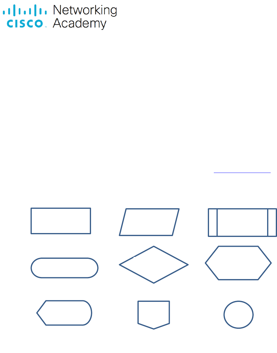 © segunda-feira, 28 de outubro de 2018 13:10:03 Cisco e/ou suas afiliadas. Todos os direitos reservados. Este documento contém informações públicas da Cisco. Página 1 de 6 Laboratório – Criar um fluxograma do processo Objetivos Parte 1: Reconhecer os símbolos usados em um fluxograma e listar o processo lógico para resolver um problema Parte 2: Desenhar o fluxograma para ilustrar o processo de solução de problemas Histórico Fluxogramas são diagramas usados para representar processos ou fluxos de trabalho. Usando diferentes formas e caixas e conectando setas, um fluxograma representa o fluxo de solução para um problema específico. Fluxogramas são comumente usados para representar programas, algoritmos ou qualquer processo ordenado em vários disciplinas. Fluxogramas normalmente são criados antes de se iniciar um processo ou de se escrever um aplicativo, para verificar e detectar possíveis fluxos de lógica em direção à solução, antes de ele ser desenvolvido e implementado. Os fluxogramas podem ser desenhados à mão ou criados usando vários pacotes, incluindo os produtos Microsoft Office, LibreOffice, GoogleDocs e vários aplicativos da web, como https://www.draw.io/ . Alguns dos símbolos de fluxograma mais comuns usados para programação são mostrados no diagrama, juntamente com a finalidade pretendida para o símbolo. Linhas com setas indicam o fluxo do processo de solução do problema. Cenário Você deve desenvolver um processo sistemático para encontrar um número predeterminado. O processo de desenvolvido é representado em um fluxograma. Usando o fluxograma, podemos verificar o processo lógico para o problema. Processo Dados Predefinido Processo Terminação Decisão Preparação Visor Página externa Conector Conector https://www.draw.io/ Laboratório – Mapeado a Internet © segunda-feira, 28 de outubro de 2018 13:10:03 Cisco e/ou suas afiliadas. Todos os direitos reservados. Este documento contém informações públicas da Cisco. Página 2 de 6 Recursos necessários • Este laboratório pode ser feito com papel e lápis ou um PC com acesso à Internet (ou aplicativos de produtividade do office, como Microsoft Office, LibreOffice e GoogleDocs. Parte 1: Liste as etapas lógicas necessárias para resolver um problema O problema é desenvolver um processo para encontrar um número predeterminado. O processo pode ser programado como um jogo de computador simples. É solicitado que um jogador pense em um número inteiro entre 0 e 128. O programa usará o método de bissecção para encontrar o número. Etapa 1: Liste as etapas necessárias para resolver o problema. a. Pergunte o que o jogador pensa sobre um número inteiro entre 0 e 128. b. Defina a como a extremidade inferior b como a extremidade alta e t como a hora do cálculo c. Defina os valores iniciais, a = 0, b = 128, t = 0 d. Calcule o número médio entre a e b. Defina-o como M. e. Set t = t + 1 f. Ask the player if M is the correct number: If yes, print “The number you thought of is M and I guessed it t tries.” End the process. Else If t = 6 If yes, print “I am sorry that I cannot guess it after 6 attempts.” End the process. Else Ask the player if M is larger than the correct number: If yes, set a = M, jump to Step d. Else Set b = M, jump to Step d. Perguntas: O processo pode detectar se o número que o jogador escolheu é 0 ou 128? Por que usar esse cabo ou por que não usar esse cabo? ____________________________________________________________________________________ ____________________________________________________________________________________ Se 0 ou 128 não puder ser detectado, o que deve ser feito para corrigir isso? ____________________________________________________________________________________ ____________________________________________________________________________________ Laboratório – Mapeado a Internet © segunda-feira, 28 de outubro de 2018 13:10:03 Cisco e/ou suas afiliadas. Todos os direitos reservados. Este documento contém informações públicas da Cisco. Página 3 de 6 Parte 2: Desenhar o fluxograma Etapa 1: Use os símbolos fluxograma adequados para cada função. Como a lista de etapas do processo é identificada, podemos usar símbolos de fluxograma para representar cada etapa. a. Use um símbolo oval como Iniciar e um símbolo de exibição para perguntas. Use uma linha para vinculá- los: b. Use um símbolo de preparação para fazer a atribuição inicial: c. Use um símbolo de processo predefinido para definir uma função ou rotina de processo: Início Please think of an integer number between 0 and 128 a=0, b=128 t=0 M=(a+b)/2 t=t+1 Laboratório – Mapeado a Internet © segunda-feira, 28 de outubro de 2018 13:10:03 Cisco e/ou suas afiliadas. Todos os direitos reservados. Este documento contém informações públicas da Cisco. Página 4 de 6 d. Use um símbolo de decisão para representar um teste de condição: e. Use um símbolo de processo para representar uma operação: Etapa 2: Desenhe o fluxograma completo. Agora podemos usar símbolos para desenhar um fluxograma completo. Usaremos o Conector fora da página e Conector para estender o fluxograma para a próxima página : Sim Não Is M correct? Início Please think of an integer number between 0 and 128 a=0, b=128 t=0 a = M Laboratório – Mapeado a Internet © segunda-feira, 28 de outubro de 2018 13:10:03 Cisco e/ou suas afiliadas. Todos os direitos reservados. Este documento contém informações públicas da Cisco. Página 5 de 6 . M = (a+b)/2 t = t+1 Is M correct? Sim Não The number you thought is “M” and I guessed it via “t” times! End End Is t=6? Sim Sorry, I cannot guess your number after 6 times! Is M larger? Não a = M b = M Não Sim Laboratório – Mapeado a Internet © segunda-feira, 28 de outubro de 2018 13:10:03 Cisco e/ou suas afiliadas. Todos os direitos reservados. Este documento contém informações públicas da Cisco. Página 6 de 6 Reflexão Qual 