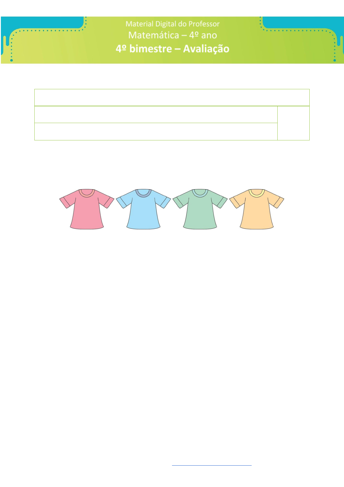 1. Jaime foi a uma loja comprar duas camisetas de cores diferentes. Veja as cores de camisetas que ele poderá escolher. Avits Estúdio Gráfico/Arquivo da editora Quantas opções diferentes Jaime terá para escolher as duas camisetas, sendo cada uma de uma cor? a) 2 b) 4 c) 6 d) 8 Mais atividades e Materiais: https://desafiosmate.com.br/ Escola: Professor: Nota: Aluno: https://desafiosmate.com.br/ 2. Veja as cédulas e moedas que Olívia tem em sua carteira. Fotos: Reprodução/Casa da Moeda do Brasil/Ministério da Fazenda *Elementos não proporcionais entre si. Qual é o valor, em reais, que Olívia tem em sua carteira? a) R$ 122,70 b) R$121,80 c) R$ 119, 80 d) R$ 118,70 Mais atividades e Materiais: https://desafiosmate.com.br/ https://desafiosmate.com.br/ 3. Mateus traçou uma linha reta sobre algumas figuras para verificar quais delas apresentam simetria de reflexão em relação à linha traçada. Ilustrações: Avits Estúdio Grádico/Arquivo da editora Quais dessas figuras apresentam simetria de reflexão em relação à linha reta traçada? a) Apenas A e B. b) Apenas A e C. c) Apenas A, B e C. d) Apenas A, C e D. Mais atividades e Materiais: https://desafiosmate.com.br/ A B C D https://desafiosmate.com.br/ 4. O celular de seu Arnaldo, pai de Carlos, caiu no chão e parou de funcionar. Como seu Arnaldo precisa muito do celular no trabalho, ele está pesquisando os preços de um novo aparelho, de certo modelo. Veja as opções de compra desse modelo: Qual loja oferece o menor preço para o mesmo modelo de celular? a) Loja 1. b) Loja 2. c) Loja 3. d) Loja 4. Mais atividades e Materiais: https://desafiosmate.com.br/ https://desafiosmate.com.br/ 5. Na entrada de uma loja de materiais para construção, o vendedor anunciava a oferta. Avits Estúdio Gráfico/Arquivo da editora Nessa promoção, quanto custa cada saco de cimento? a) R$ 40,00 b) R$ 35,00 c) R$ 32,00 d) R$ 30,00 Mais atividades e Materiais: https://desafiosmate.com.br/ https://desafiosmate.com.br/ 6. Juliano vai participar do sorteio de um número entre os que estão registrados na cartela representa a seguir. Juliano precisa escolher uma das seguintes opções para o sorteio: ● 1ª opção: números pares; ● 2ª opção: números ímpares; ● 3ª opção: números da ordem das centenas; ● 4º opção: números com algarismo 1 na ordem das unidades. Qual das opções Juliano deve escolher para ter maior chance de ser sorteado? a) 1ª opção. b) 2ª opção. c) 3ª opção. d) 4ª opção. Mais atividades e Materiais: https://desafiosmate.com.br/ 10 11 12 13 21 31 41 51 61 62 63 64 71 81 91 101 102 103 104 105 https://desafiosmate.com.br/ 7. Em um mesmo dia do mês de junho, duas cidades brasileiras apresentavam temperaturas bem diferentes no início da manhã. Fonte: Instituto de meteorologia (dados fictícios). Complete a tabela seguinte com as temperaturas em outras duas cidades brasileiras, na mesma hora e no mesmo dia das anteriores, sabendo que: ● a temperatura em Crato, no Ceará, indicava 22 °C a mais do que a temperatura em Urupema, em Santa Catarina; ● a temperatura em Belém, no Pará, era 3 °C menor do que a temperatura de Petrolina, em Pernambuco. Fonte: Instituto de meteorologia (dados fictícios). Mais atividades e Materiais: https://desafiosmate.com.br/ Temperatura em duas cidades brasileiras na mesma hora de um dia Estado Cidade Temperatura Santa Catarina Urupema 4 °C Pernambuco Petrolina 25 °C Temperatura em duas cidades brasileiras na mesma hora de um dia Estado Cidade Temperatura Ceará Pará https://desafiosmate.com.br/ 8. Alex passou o dia observando a temperatura da sua cidade, Santa Rosa, no Rio Grande do Sul, no dia 15 de novembro. Quando ele acordou, a temperatura era de 24 °C. Duas horas depois, estava em 25 °C. Na hora do almoço, a temperatura estava próxima de 30 °C. Às 15 horas, era de 34 °C, e antes de dormir estava próxima de 28 °C. Elabore um gráfico de colunas com as temperaturas máxima e mínima desse dia na cidade de Santa Rosa. Avits Estúdio Gráfico/Arquivo da editora Mais atividades e Materiais: https://desafiosmate.com.br/ https://desafiosmate.com.br/ Fonte: Alex (dados fictícios). 9. Carlos vai pegar uma figurinha do grupo 1 e uma do grupo 2 para formar um par. Quantos pares diferentes Carlos poderá formar? Ilustrações: Avits Estúdio Gráfico/Arquivos da editora Mais atividades e Materiais: https://desafiosmate.com.br/ https://desafiosmate.com.br/ 10. Veja as partes das figuras que Regina desenhou na malha quadriculada. Avits Estúdio gráfico/Arquivo da ediotra Complete as figuras para que elas apresentem simetria de reflexão em relação ao eixo de simetria traçado. Mais atividades e Materiais: https://desafiosmate.com.br/ https://desafiosmate.com.br/ 11. A gerente de um supermercado elaborou uma tabela com a quantidade, em quilogramas, de alguns produtos vendidos nos últimos dois meses. Fonte: Gerente do supermercado (dados fictícios). De acordo com a tabela apresentada, qual foi o produto mais vendido nesse período de dois meses? Quantos quilogramas foram vendidos desse produto? Resposta: _________________________________________________________ Mais atividades e Materiais: https://desafiosmate.com.br/ Produtos vendidos nos últimos dois meses Produto Vendas de outubro Vendas de novembro Banana 236 kg 468 kg Maçã 467 kg 356 kg Cebola 269 kg 298 kg Tomate 378 kg 468 kg https://desafiosmate.com.br/ 12. O gráfico abaixo apresenta a quantidade de doses de vacinas aplicadas na cidade em que Túlio e Ivonete vivem, de 2010 a 2016. Avits Estúdio Gráfico/Arquivo da editora Fonte: Posto de vacinação da cidade (dados fictícios). De acordo com o gráfico, as afirmações abaixo são falsas. 1ª) A quantidade de vacinas aplicadas em 2012 foi maior do que a quantidade aplicada em 2013. 2ª) Em 2010 foram aplicadas mais de 6 000 doses de vacina na população da cidade. 3ª) De 2011 até 2016, a quantidade de doses aplicadas de vacina só aumento