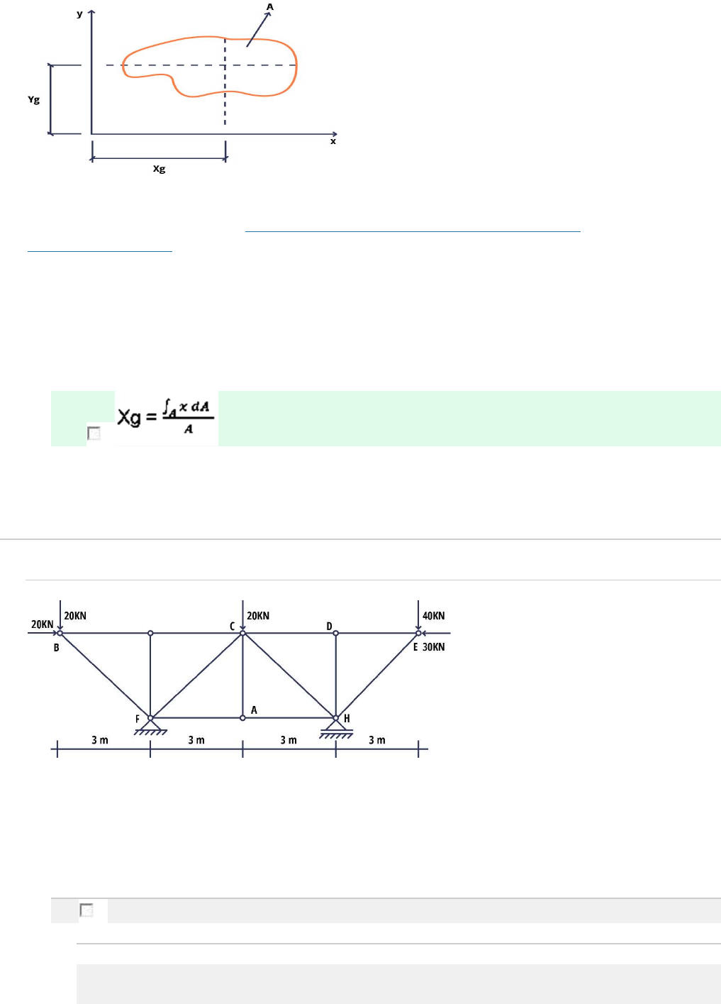 1. Para calcular o centro de gravidade de uma superfície plana, nós precisamos determinar as coordenadas de um ponto (Xg, Yg) em relação a um par de eixos de referência (X, Y), de forma que este ponto traduza a distribuição de pesos de um sistema, ou de um corpo. Analise a figura a seguir: Fonte: UNIVERSIDADE ESTADUAL DE CAMPINAS. Propriedades geométricas de seções transversais. Disponível em: <http://www.fem.unicamp.br/~em421/semII- 1999/textos/pg.pdf>. Acesso em: 24 mar. 2020, p.3. (Adaptado). Considerando essas informações e o conteúdo estudado sobre propriedades geométricas de figuras planas, pode-se afirmar que a fórmula para calcular a coordenada do centro de gravidade Xg da figura acima é: Ocultar opções de resposta 1. Resposta correta 2. Pergunta 2 Analise a figura a seguir: Considerando a figura acima e o conteúdo estudado sobre reações nos apoios e conexões de uma estrutura bidimensional, pode-se afirmar que as reações nos apoios E e F são: Ocultar opções de resposta 1. XF = 20KN; YF =35KN; YH = 35KN. Resposta correta 3. Pergunta 3 As propriedades geométricas das figuras planas têm grande importância na Resistência dos Materiais, pois, além de permitirem determinar as características dos materiais, elas também fazem parte das equações que determinam a rigidez, a capacidade de resistência e, por consequência, o equilíbrio das estruturas. Considerando essas informações e o conteúdo estudados sobre as propriedades geométricas das figuras planas, pode-se afirmar que o momento de inércia de uma barra está relacionado com o deslocamento que a barra sofre devido à ação de um esforço, porque: Ocultar opções de resposta 1. o momento de inércia está associado à rigidez de barras e, por consequência, possibilita controlar flechas nas estruturas evitando deslocamentos além dos limites de segurança. Resposta correta 4. Pergunta 4 Analise a figura a seguir: Fonte: UNIVERSIDADE ESTADUAL DE CAMPINAS. Propriedades geométricas de seções transversais. Disponível em: <http://www.fem.unicamp.br/~em421/semII- 1999/textos/pg.pdf>. Acesso em 24 mar. 2020, p.9. (Adaptado). Considerando a figura acima e o conteúdo estudado sobre propriedades geométricas das figuras planas, pode-se afirmar que os momentos de inércia da área em forma de “I”, em relação aos eixos que passam pelo centro de gravidade, são: Ocultar opções de resposta 1. IxG = 95591, 31cm4 e IyG = 18072, 92 cm4. Resposta correta 5. Pergunta 5 Analise a figura a seguir: Considerando a figura acima e o conteúdo estudado sobre propriedades geométricas das figuras planas, analise as afirmativas a seguir e assinale V para a(s) verdadeiras e F para a(s) falsa(s). I. ( ) A área total da figura pode ser obtida pela fórmula: A = A1 - A2. II. ( ) O momento de inércia em relação ao eixo y é 13,7*109 mm4. III. ( ) O momento de inércia em relação ao eixo z pode ser calculado pela fórmula Iz = Iz1 - Iz2. IV. ( ) O momento de inércia em relação ao eixo z é 17,32*1010 mm3. Agora, assinale a alternativa que apresenta a sequência correta: Ocultar opções de resposta 1. V, F, V, F. Resposta correta 6. Pergunta 6 Analise a figura a seguir Fonte: UNIVERSIDADE ESTADUAL DE CAMPINAS. Propriedades geométricas de seções transversais. Disponível em: <http://www.fem.unicamp.br/~em421/semII- 1999/textos/pg.pdf>. Acesso em: 24 mar. 2020, p. 2. (Adaptado). Considerando a figura acima e o conteúdo estudado sobre propriedades geométricas de figuras planas, pode-se afirmar que os momentos estáticos em relação aos eixos x e y, respectivamente, são: 1. bh²/2 e hb²/2. Resposta correta 7. Pergunta 7 Analise a figura a seguir: Considerando a figura acima e o conteúdo estudado sobre reações nos apoios e conexões de uma estrutura bidimensional, pode-se afirmar que as reações nos apoios A e B são: 1. HA = -q*b ; VA = -(q*b²)/2a ; VB = (q*b²)/2a. Resposta correta 8. Pergunta 8 Analise a imagem a seguir que representa uma área em forma de “T”: Considerando a figura acima e o conteúdo estudado sobre propriedades geométricas das figuras planas, pode-se afirmar que o momento de inércia da área em forma de “T”, em relação ao eixo horizontal do centroide, é: Ocultar opções de resposta 1. 6,15 * 10-3 m4. Resposta correta 9. Pergunta 9 Analise a figura a seguir que representa um perfil “T” Fonte: UNIVERSIDADE ESTADUAL DE CAMPINAS. Propriedades geométricas de seções transversais. Disponível em: <http://www.fem.unicamp.br/~em421/semII- 1999/textos/pg.pdf>. Acesso em: 24 mar. 2020, p.5. (Adaptado). Considerando a figura acima e o conteúdo estudado sobre propriedades geométricas de figuras planas, pode-se afirmar que o centro de gravidade do perfil “T” é: Ocultar opções de resposta 2 XG = 0 e YG = 4,65 cm. Resposta correta 10. Pergunta 10 Analise a figura a seguir: Considerando essas informações e o conteúdo estudado sobre reações nos apoios e conexões de uma estrutura bidimensional, pode-se afirmar que as reações no engaste é: H = 0; V = 0; M = Pa. Resposta correta Lembra de Curtir