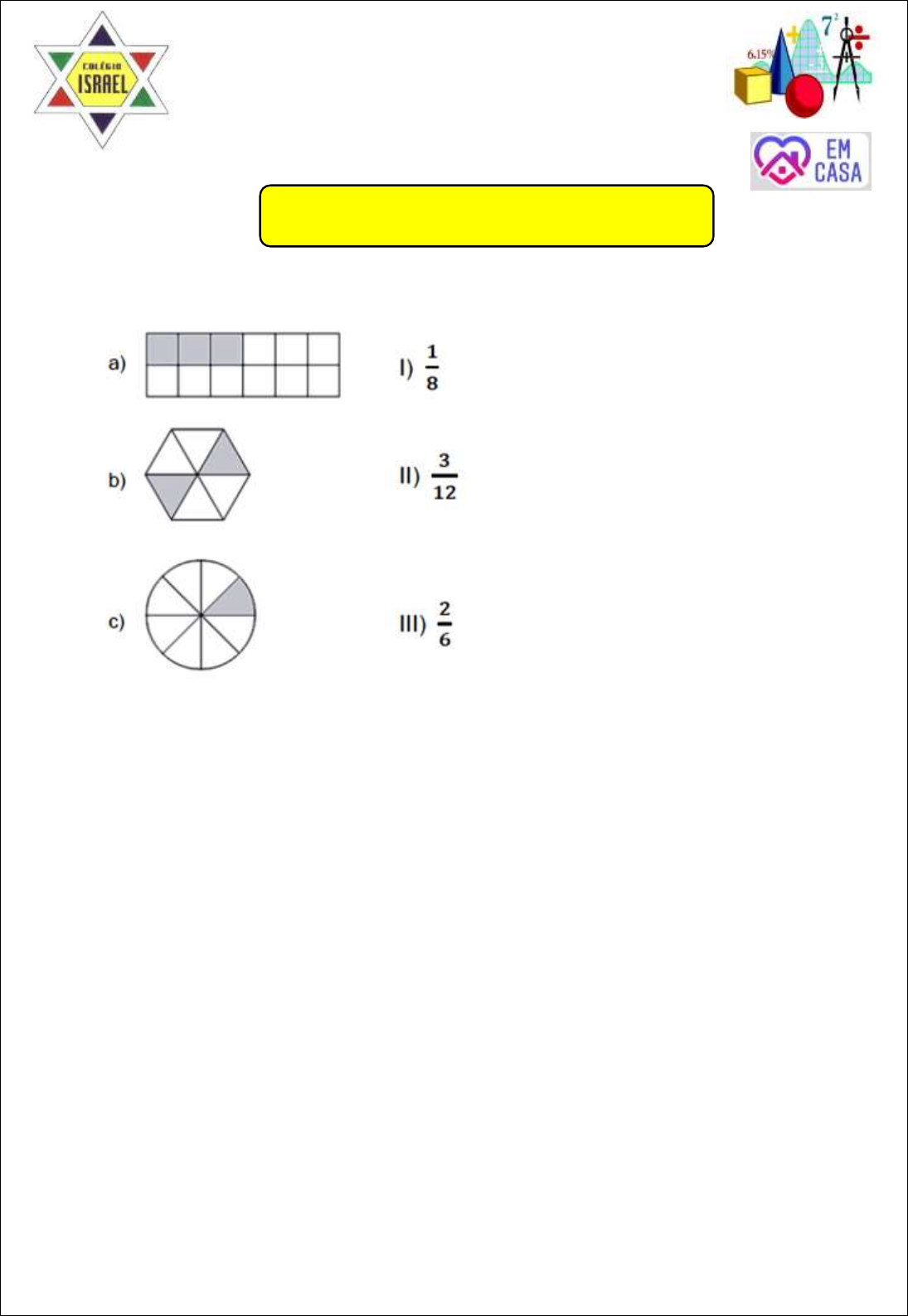 CENTRO EDUCACIONAL ISRAEL Atividades – 5º Ano PLATAFORMA PLURALL Disciplina: Matemática Tia: Daiane 1. Ligue cada figura à fração que indica a parte colorida: 2. Qual é o resultado dessa conta? A) 9789 B) 4015 C) 2923 D) 2766 3. João comprou uma bicicleta que custou 870 reais. Ele vai pagar esse fogão em 6 prestações iguais. Qual será o valor de cada prestação? A) 85 reais. B) 99 reais. C) 145 reais. D) 476 reais. 4. Observe o numeral 128784, sua decomposição é: a) 128 + 784 unidades b) 10000 + 20000 + 700 + 80 + 4 c) 100 + 20 + 8 + 784 d) 100000 + 20000 + 8000 + 700 + 80 + 4 Revisão do Simulado 37 x 79 5. Num projeto de sustentabilidade foram distribuídas 4185 mudas de árvores para serem plantadas em quantidades iguais em 45 cidades. Quantas mudas cada cidade recebeu? A) 103 mudas. B) 93 mudas. C) 87 mudas. D) 56 mudas. 6. Um livro tem 132 páginas. Leda já leu 5 6 desse livro. Quantas páginas ela já leu desse livro? A) 25 B) 42 C) 66 D) 110 7. Uma escola tem 54 professores. Desses, 5 9 são do sexo feminino. Quantas professoras há nessa escola? A) 20 B) 30 C) 40 D) 50 8. Um pedreiro precisa de 2.466 blocos para construir uma parede. Ele já fez 1 9 da parede. Quantos blocos o pedreiro ainda tem para terminar a obra? A) 154 B) 160 C) 245 D) 274